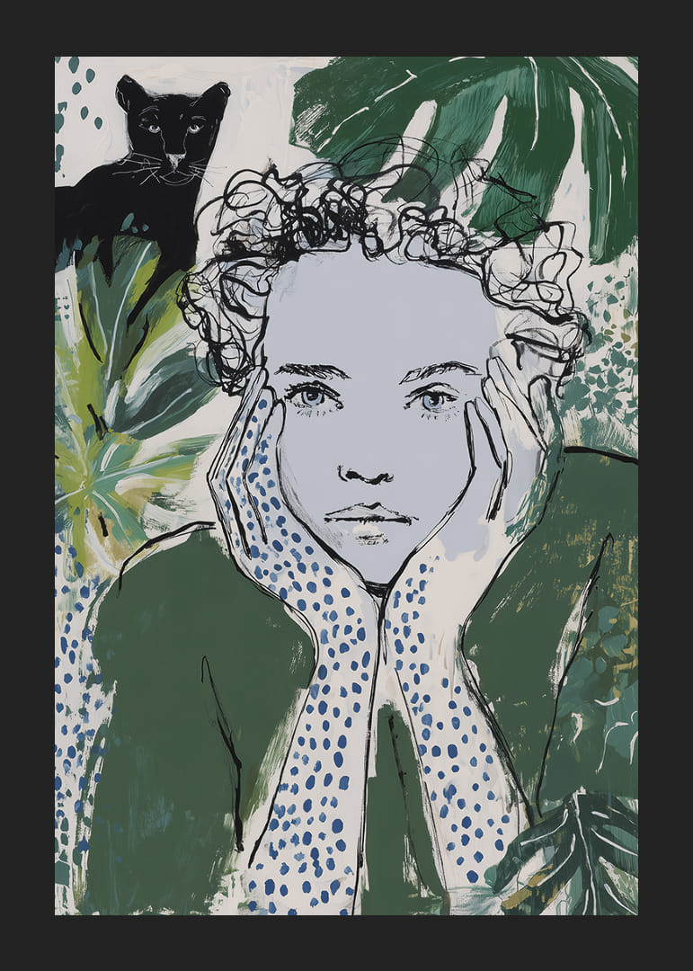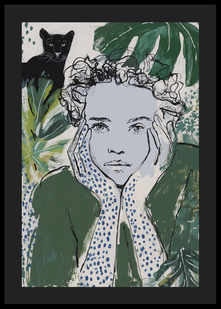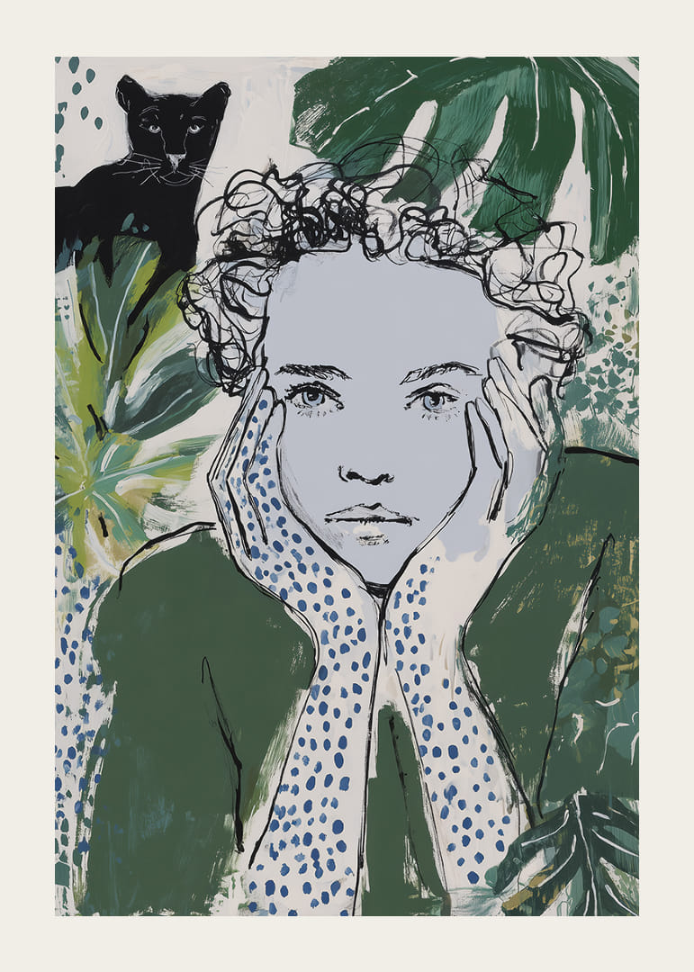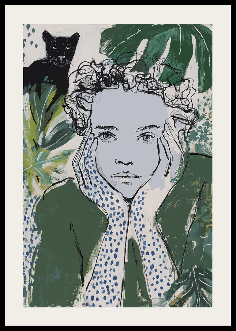 Denna poster fångar en drömsk stämning där en tankfull person är omgiven av gröna löv och växter, med en svart panter som vakar i bakgrunden. Kombinerade nyanser av grönt och blått skapar en mystisk men ändå lugnande atmosfär, perfekt för att ge liv åt vilket rum som helst. Postern tillför en touch av naturens lugn och inbjuder till eftertanke och harmoni hemma.