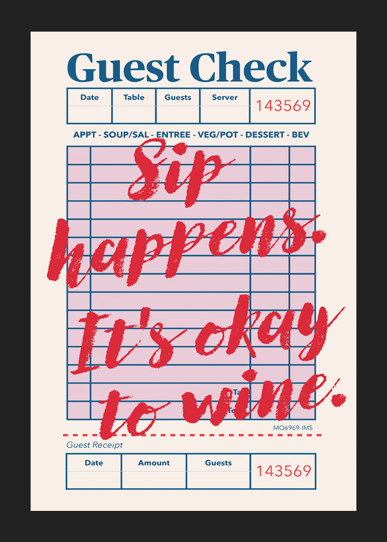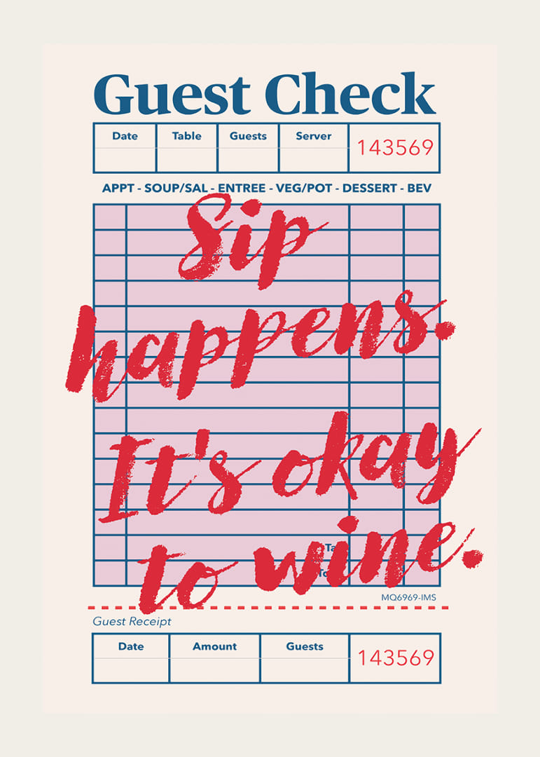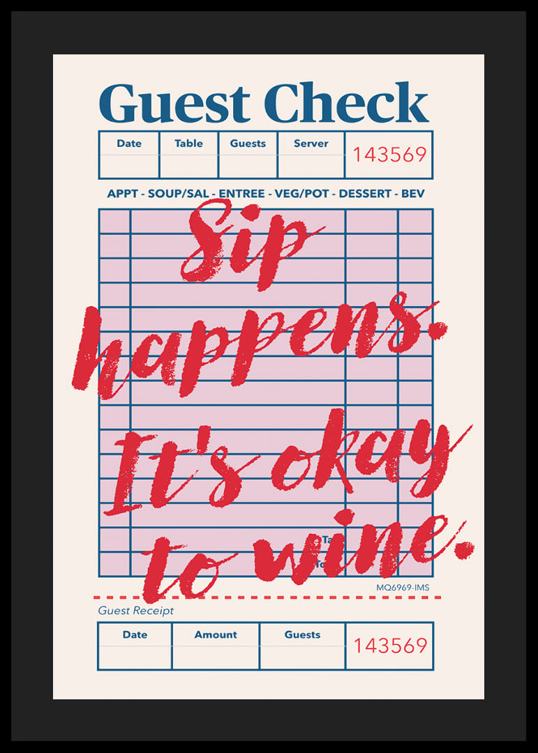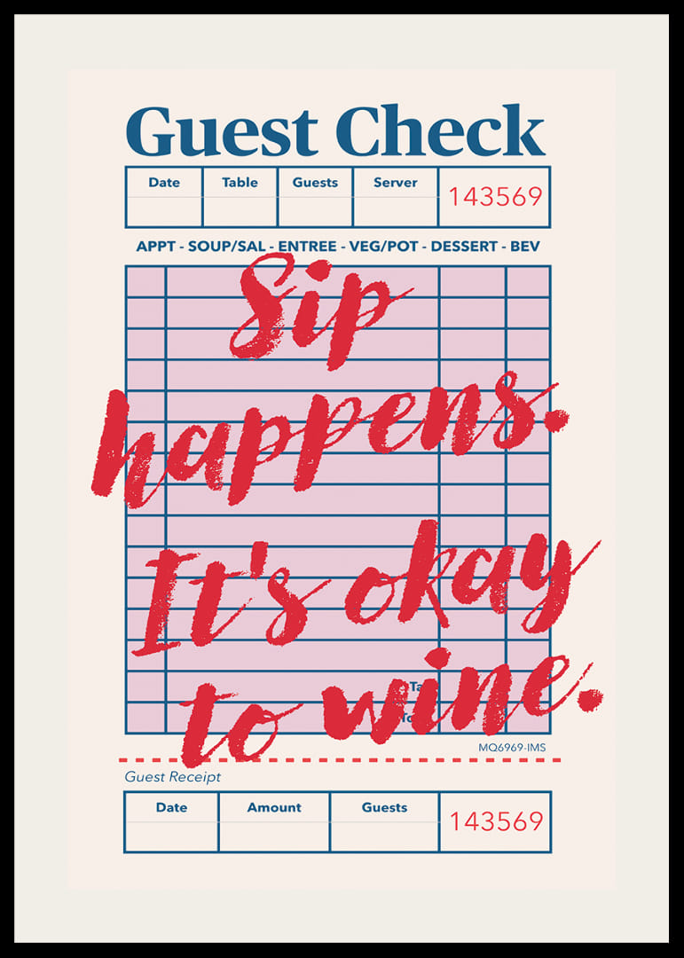 Denna lekfulla poster fångar ögat med sin humoristiska text: 'Sip happens. It's okay to wine.' Motivet av ett gästkvitto skapar en lättsam och avslappnad atmosfär, perfekt för vinälskare med glimten i ögat. Posterns charmiga ordlek ger en touch av humor och elegans, vilket förhöjer stämningen i varje rum den dekorerar och blir en konversationsstartare vid nästa middagsbjudning.