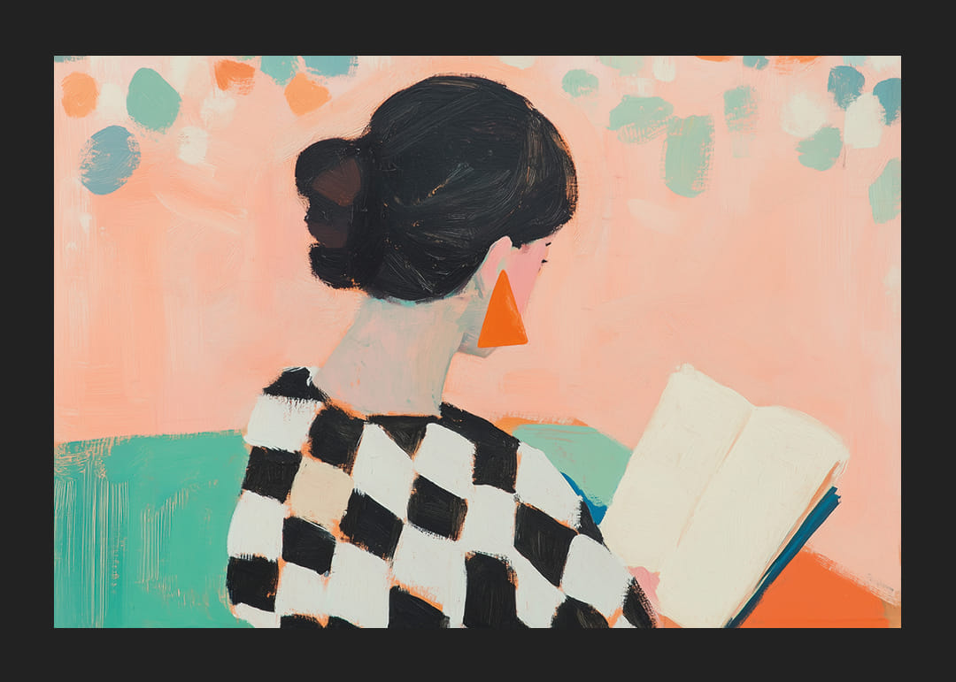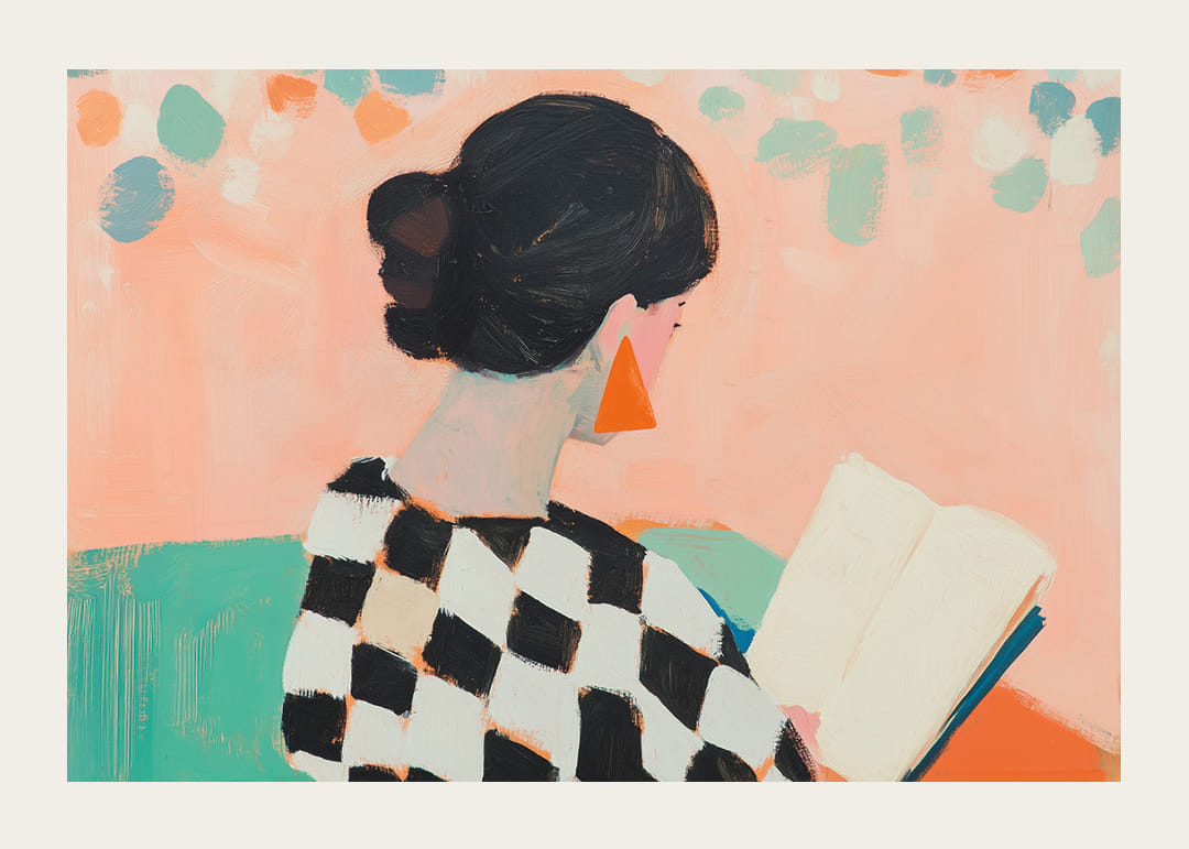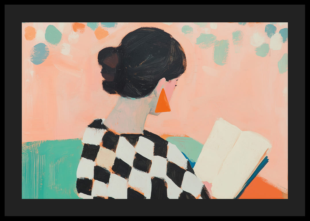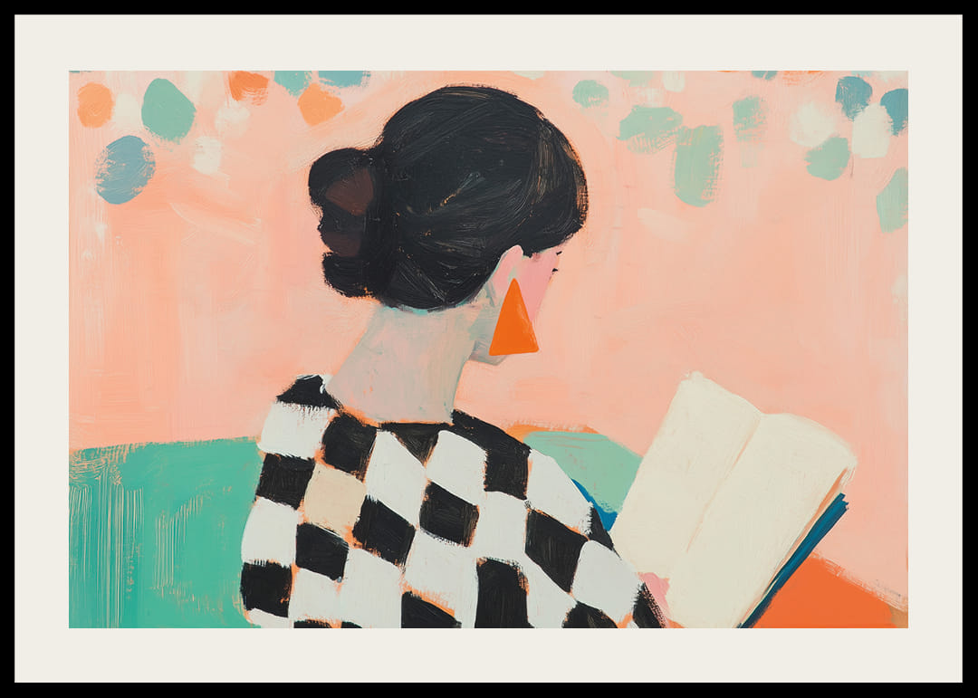 Denna poster fångar en kvinnas lugn när hon försjunker i sin bok. Den färgglada miljön med pastelltoner och geometriska mönster skapar en känsla av lekfullhet och elegans. Kontrasten mellan kvinnans schackmönstrade tröja och de livfulla bakgrundsfärgerna gör motivet levande. Med denna poster kan du förvandla vilket rum som helst till en fridfull och inspirerande oas, perfekt för personlig reflektion och kreativ stimulans.