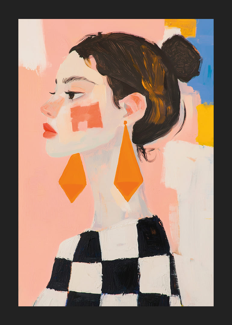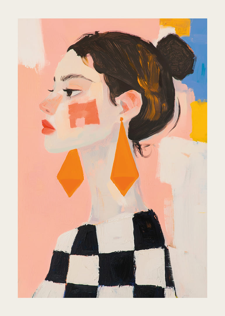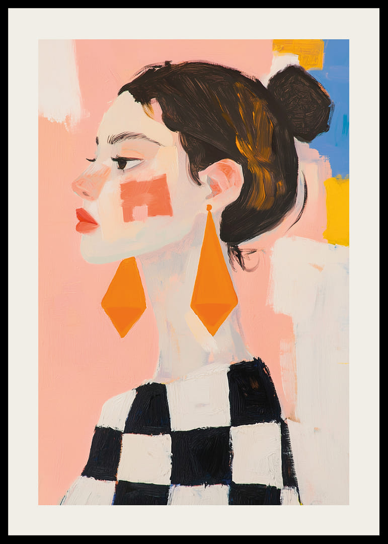 Denna poster fångar betraktarens blick med sin djärva och färgglada abstrakta elegans. Porträttet av en kvinna i profil, med de geometriska formerna och de levande färgerna, skapar en känsla av modern stil och uttrycksfullhet. Kontrasterna mellan de mjuka och kantiga linjerna ger liv åt rummet och förhöjer dess estetiska värde. Med en sådan poster i ditt hem förvandlas varje vägg till ett konstverk av individuell stil.
