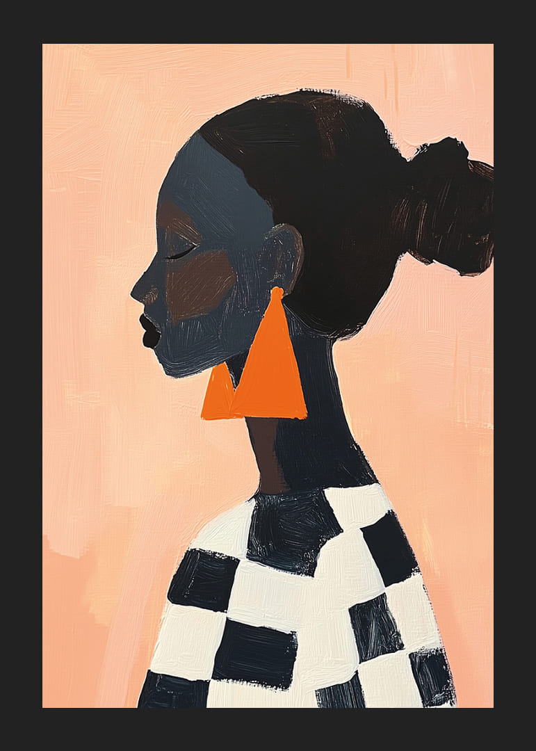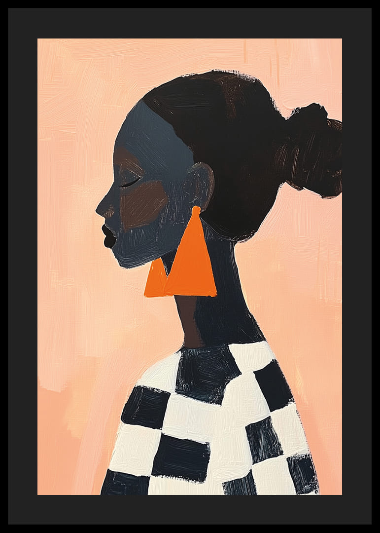 Denna poster fångar blicken med en djärv siluett mot en varm bakgrund där geometriska former och starka färgkontraster spelar huvudrollen. De stora orangea örhängena skapar en dynamisk balans mot det lugna svarta och vita mönstret. Postern utstrålar elegans och modernitet, en perfekt detalj för att lyfta atmosfären i vilket vardagsrum som helst och inge en känsla av stilfullt lugn.