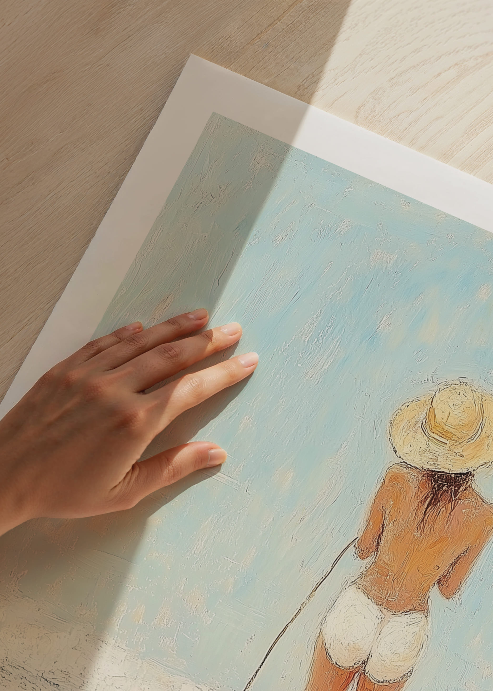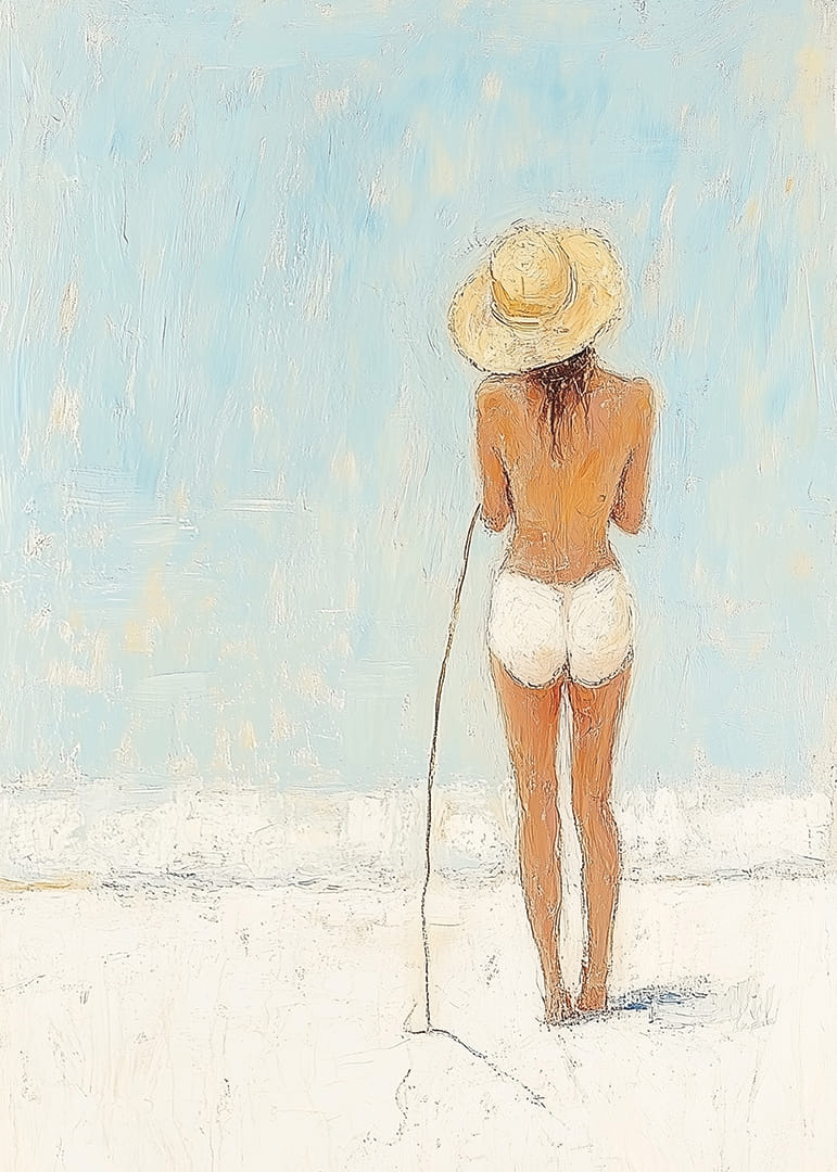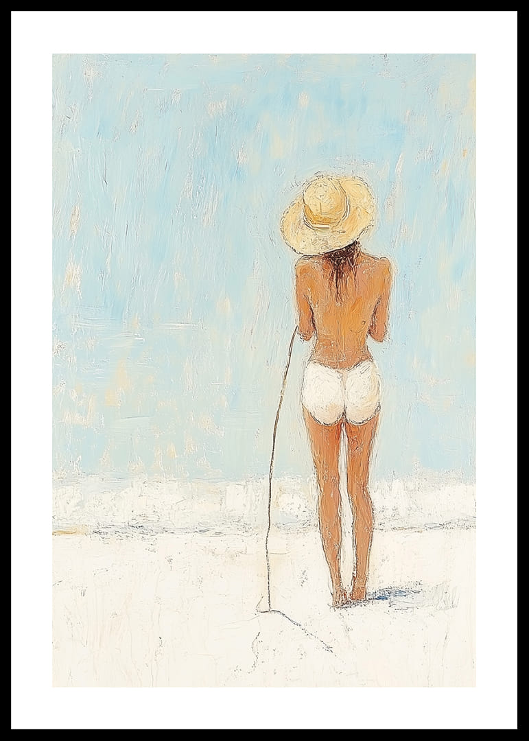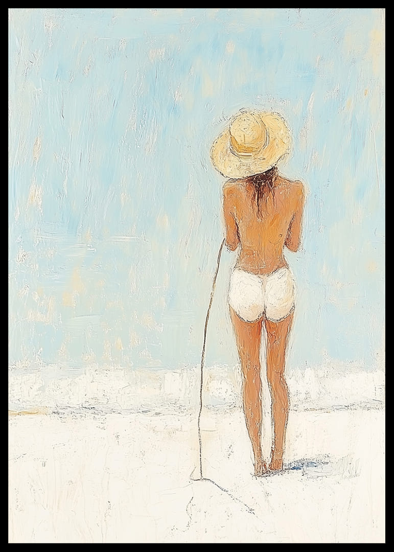 Postern fångar en solig dag vid havet där en kvinna står vänd bort mot horisonten, bara hennes silhuett mot den blå himlen. Den mjuka sanden och havets djupblå nyanser skapar en känsla av lugn och frihet. Det är en tavla som utstrålar sommar och förundran, perfekt för att ge ditt hem en solig och rofylld atmosfär. Denna poster ger ditt rum en känsla av evig sommar och havets viskningar.