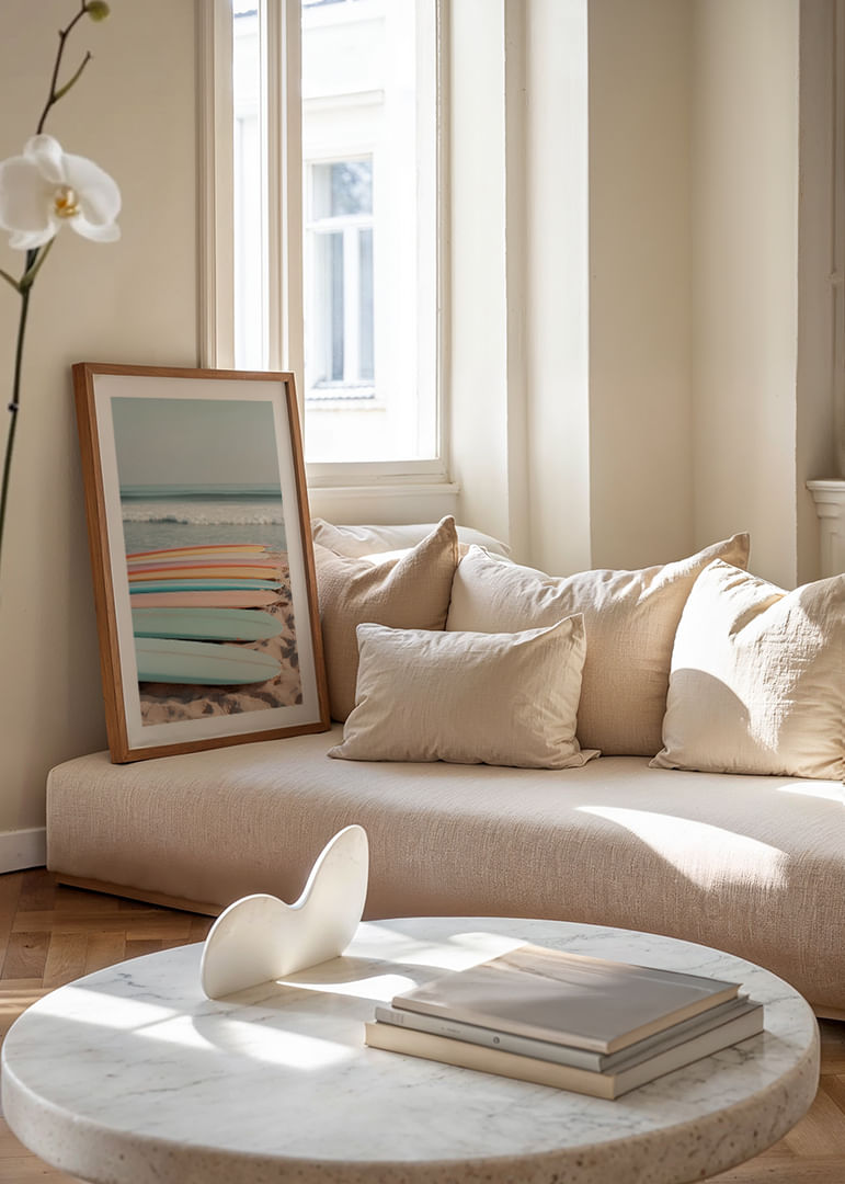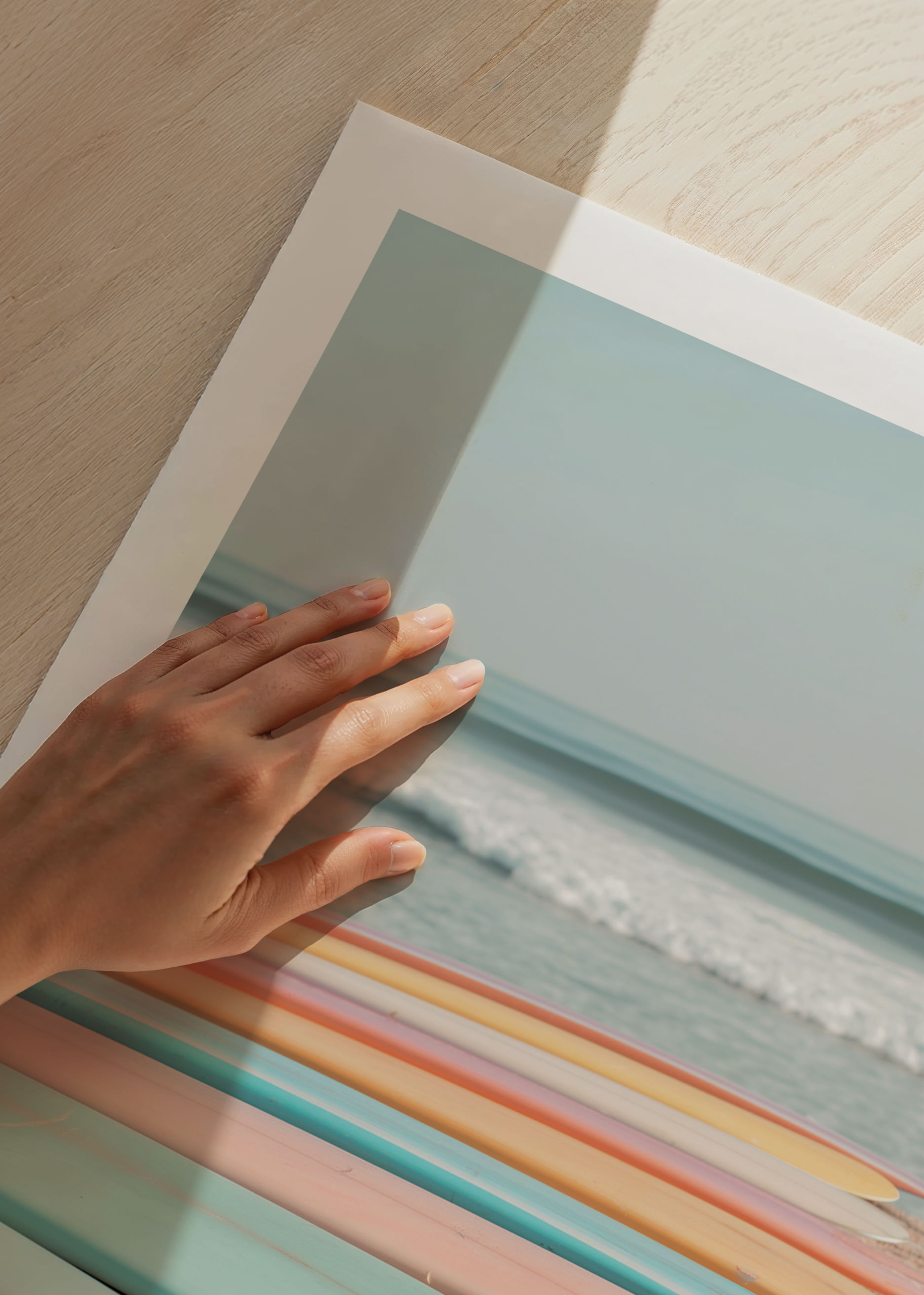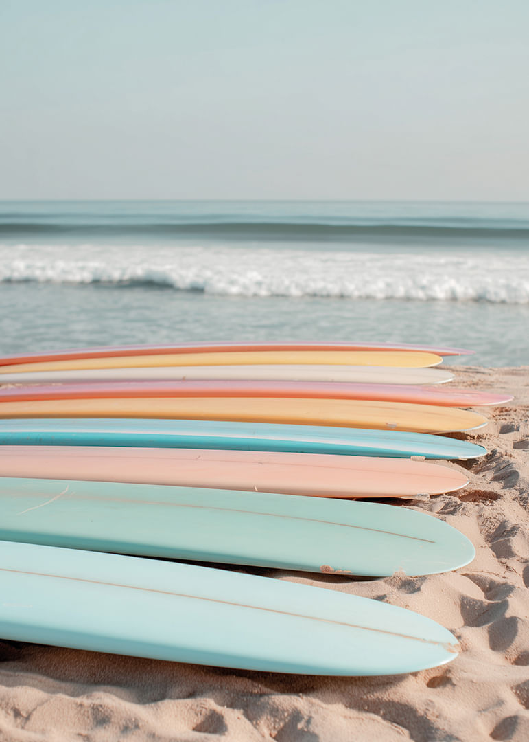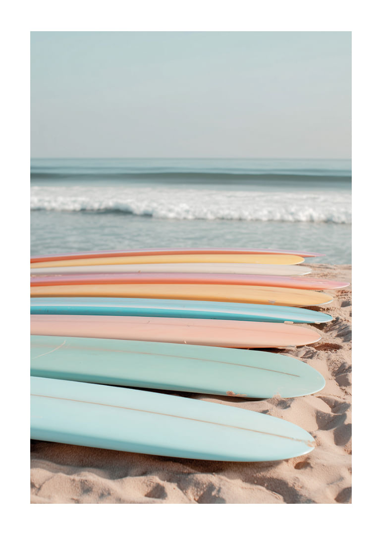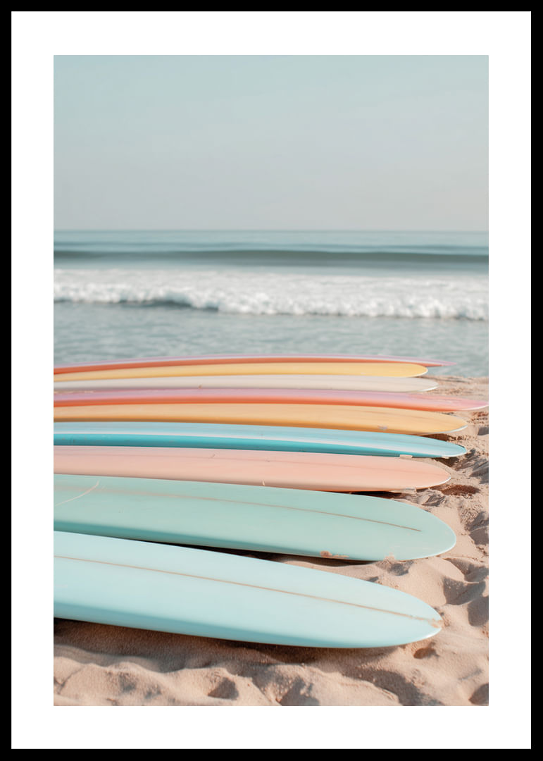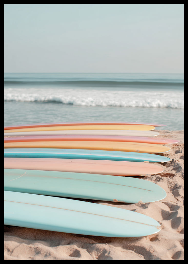 Denna poster fångar med sina mjuka pastellfärger, där surfbrädor ligger vilande på sanden och vågorna viskar i bakgrunden. Det är en bild av stilla förväntan och frihet i varje penseldrag. Perfekt för att skapa en lugn och inspirerande atmosfär, förvandlar denna poster vilket rum som helst till en oas av harmoni och drömmar om havet.