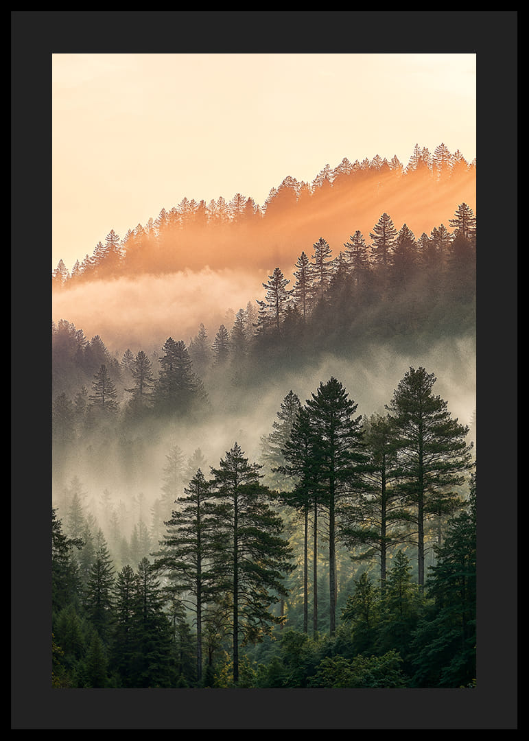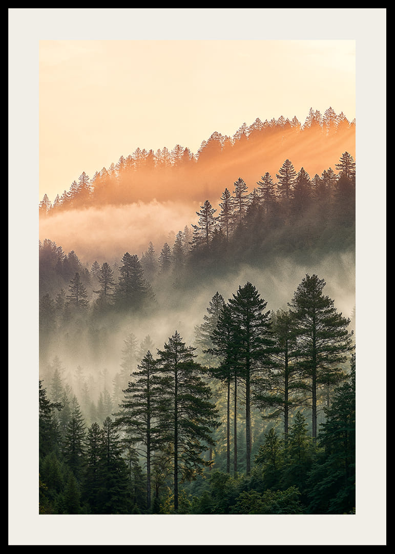 Detta magnifika poster fångar den hypnotiska skönheten av en dimmig skog på morgonen. De solbeströdda trädens siluetter framträder genom den stilla dimman, vilket skapar en känsla av mystik och lugn. De varma tonerna och skuggspelet förvandlar vilket rum som helst till en fridfull och förtrollande oas. Med denna poster upplever du naturens förtrollande essens varje dag.