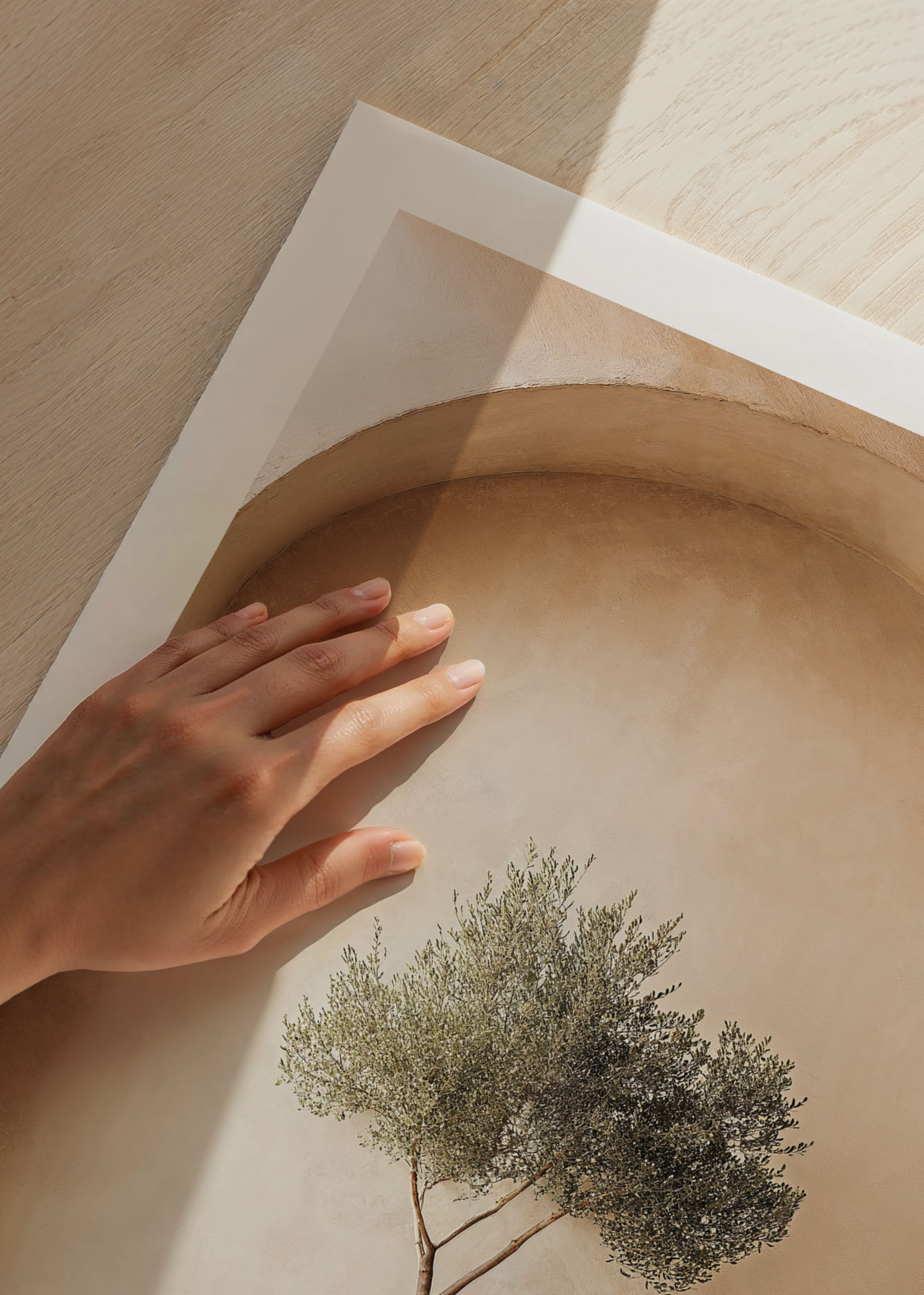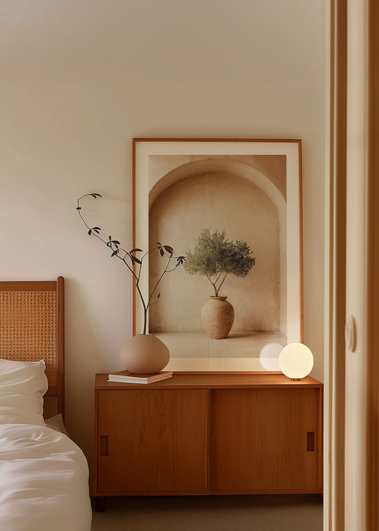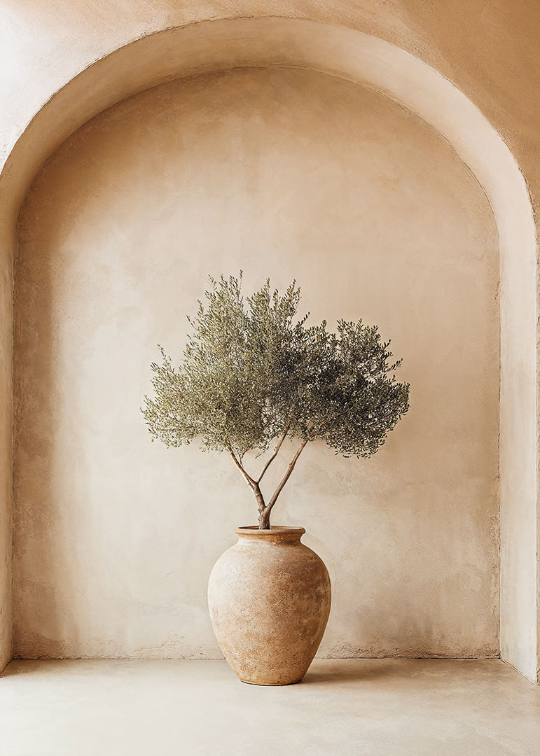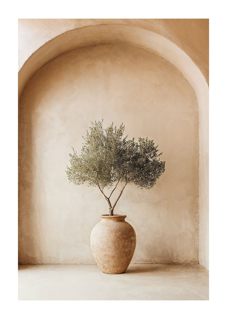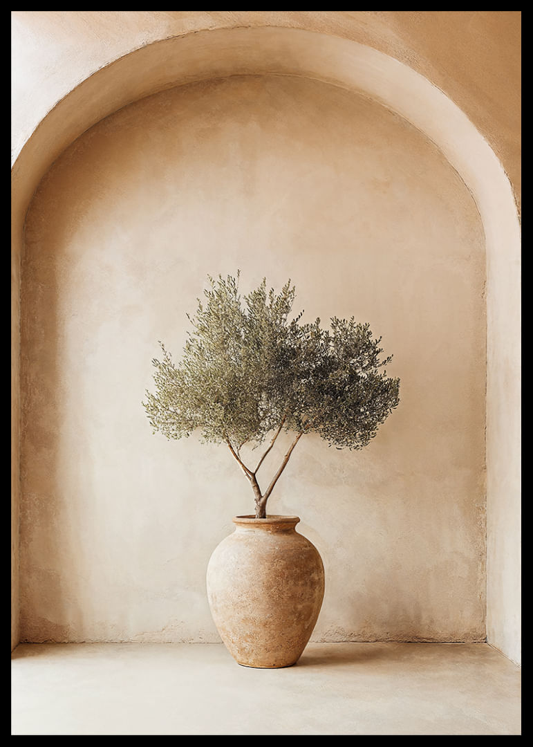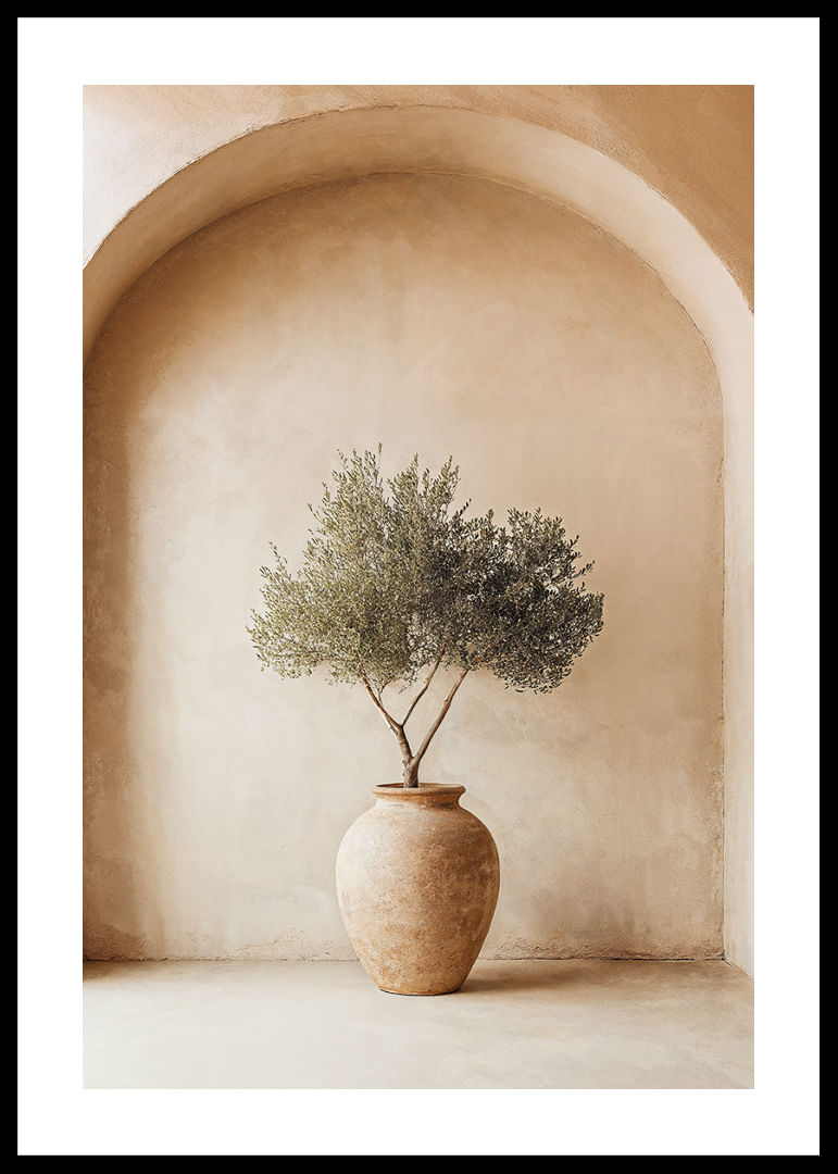 Med en elegant och avskalad design fångar denna poster essensen av Medelhavets tidlösa skönhet. Den rustika krukan och olivväxtens subtila grönska skapar en anda av frid och enkelhet. Postern förmedlar en känsla av balans och lugn, vilket berikar varje rum med sitt naturliga uttryck. Perfekt för att framhäva det jordnära och fridfulla i ditt hem, ger den en sofistikerad touch.