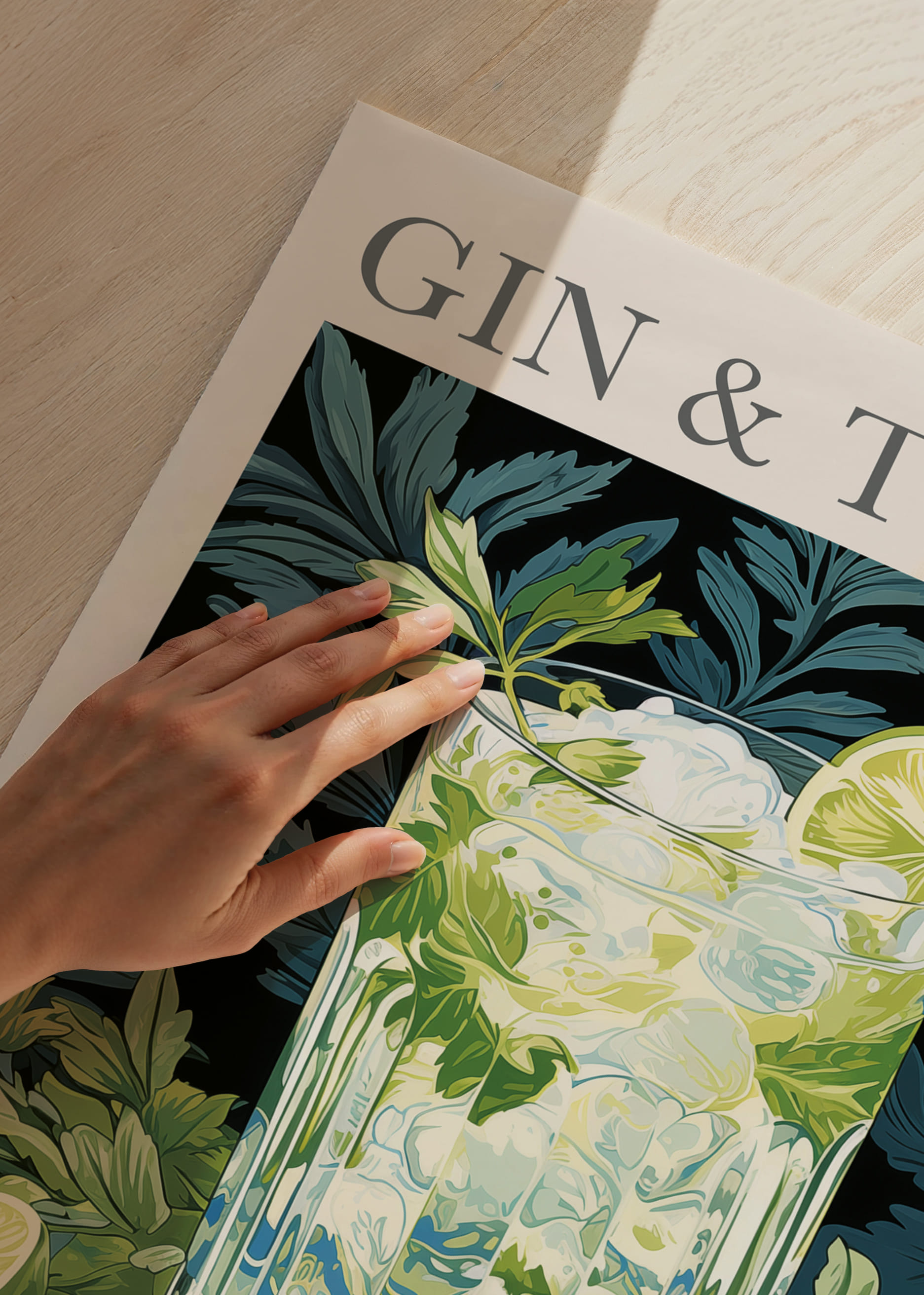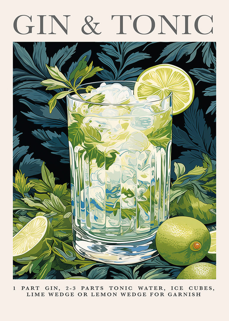 En poster som omedelbart fångar ögat med en frisk och livlig gin och tonic. De djupgröna bladen skapar en harmonisk bakgrund för glaset fyllt med is och lime. Den livfulla gröna färgpaletten ger en känsla av natur och fräschhet, perfekt för att lyfta stämningen i ditt vardagsrum. Denna poster blir en stilren och uppfriskande detalj som påminner om sommarens lätta kvällar.