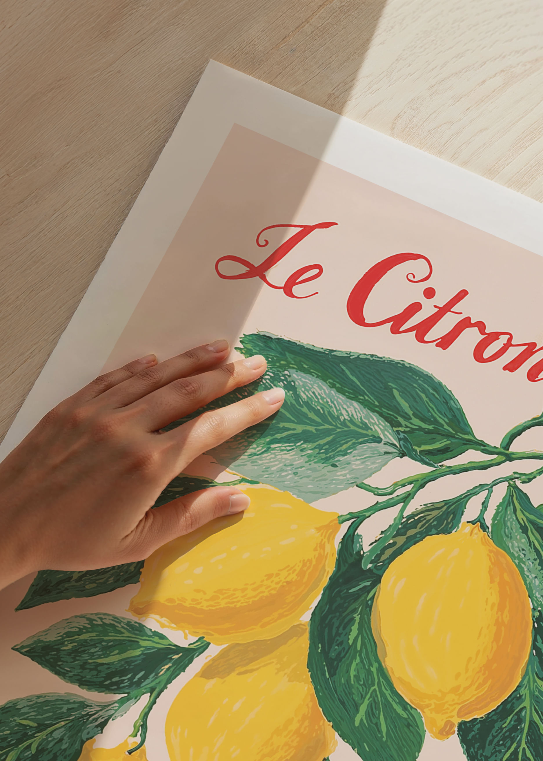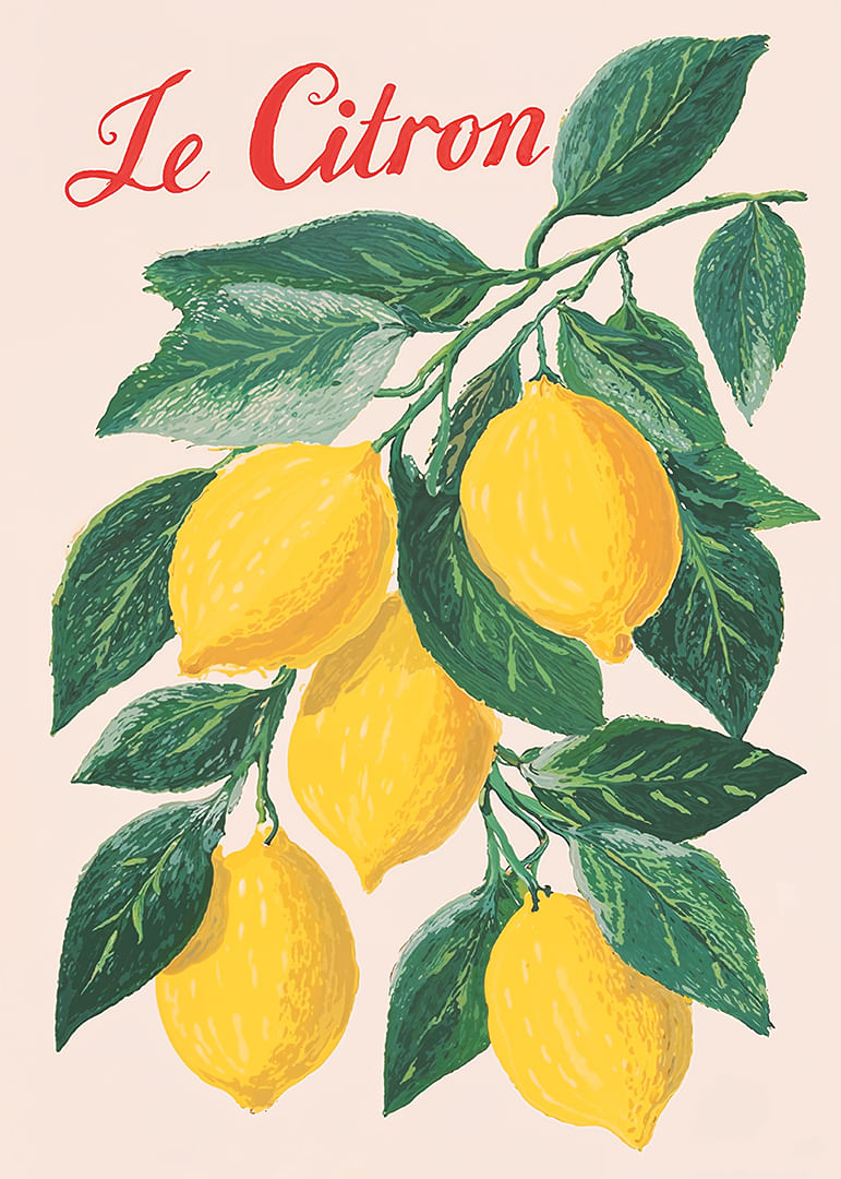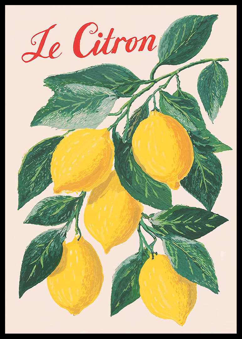 Denna poster fångar omedelbart blicken med sina livliga, gula citroner hängande från en grönskande kvist. Den intensiva färgen ger ett fräscht och energiskt intryck, förstärkt av de intrikata lövdetaljerna. Postern förvandlar vilket rum som helst till en ljus och inbjudande plats och sprider en känsla av somrig friskhet. Perfekt för att lyfta stämningen i ditt hem.