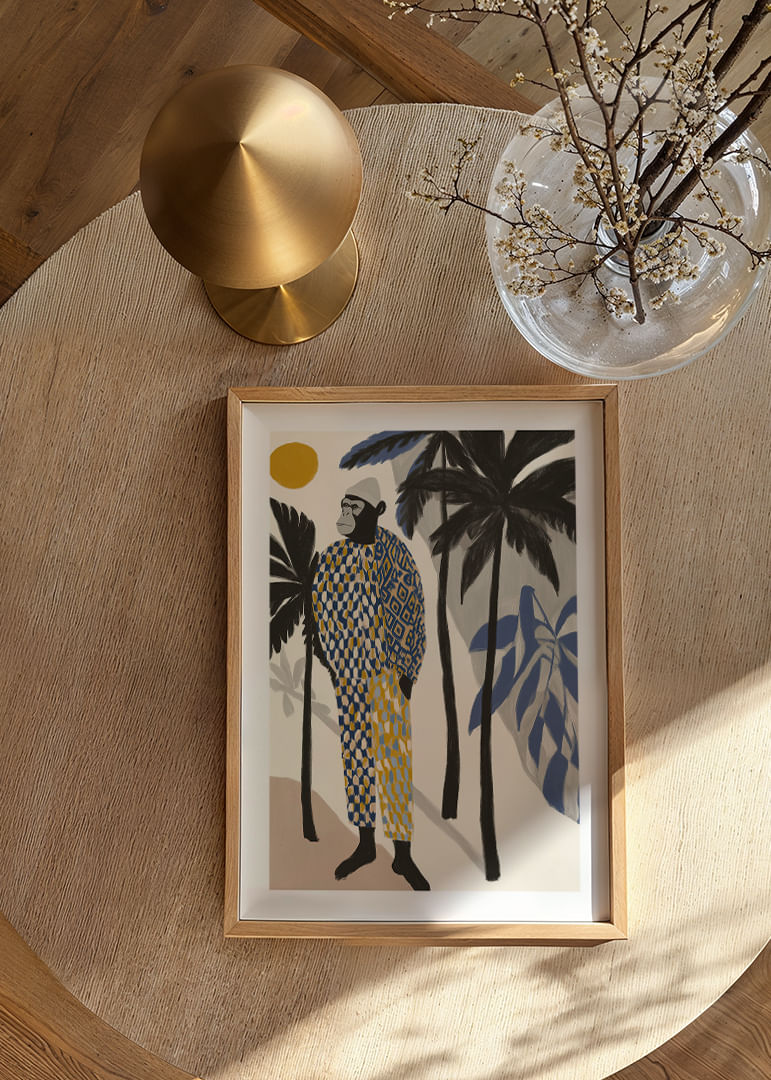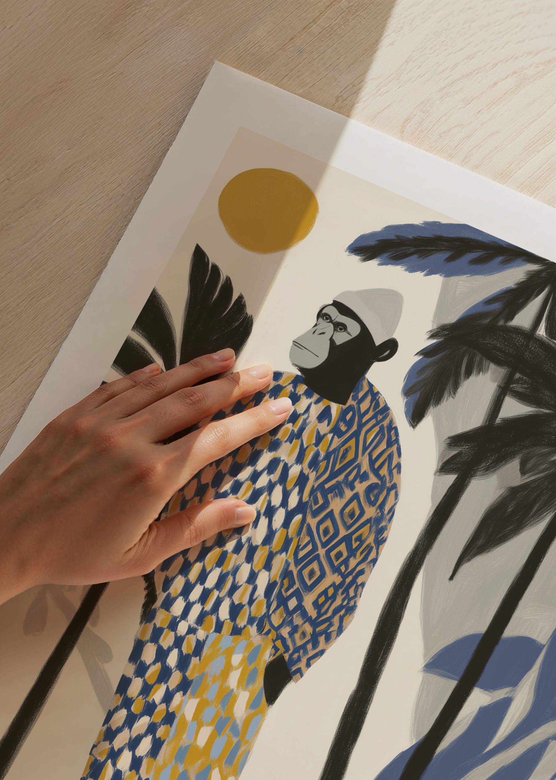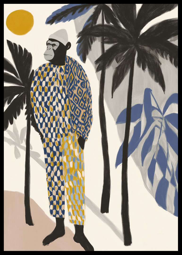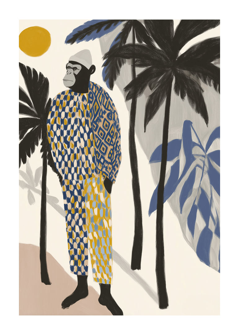 Med en djärv kombination av färger och mönster fångar denna poster essensen av humaniserad primatstil. Apan, klädd i en iögonfallande dräkt, står bland palmer och skapar en lustig och samtidigt sofistikerad känsla. Postern fungerar som en samtalsstartare, tillför en konstnärlig och exotisk twist i hemmet och framhäver en unik känsla av humor och elegans som livar upp rummet.