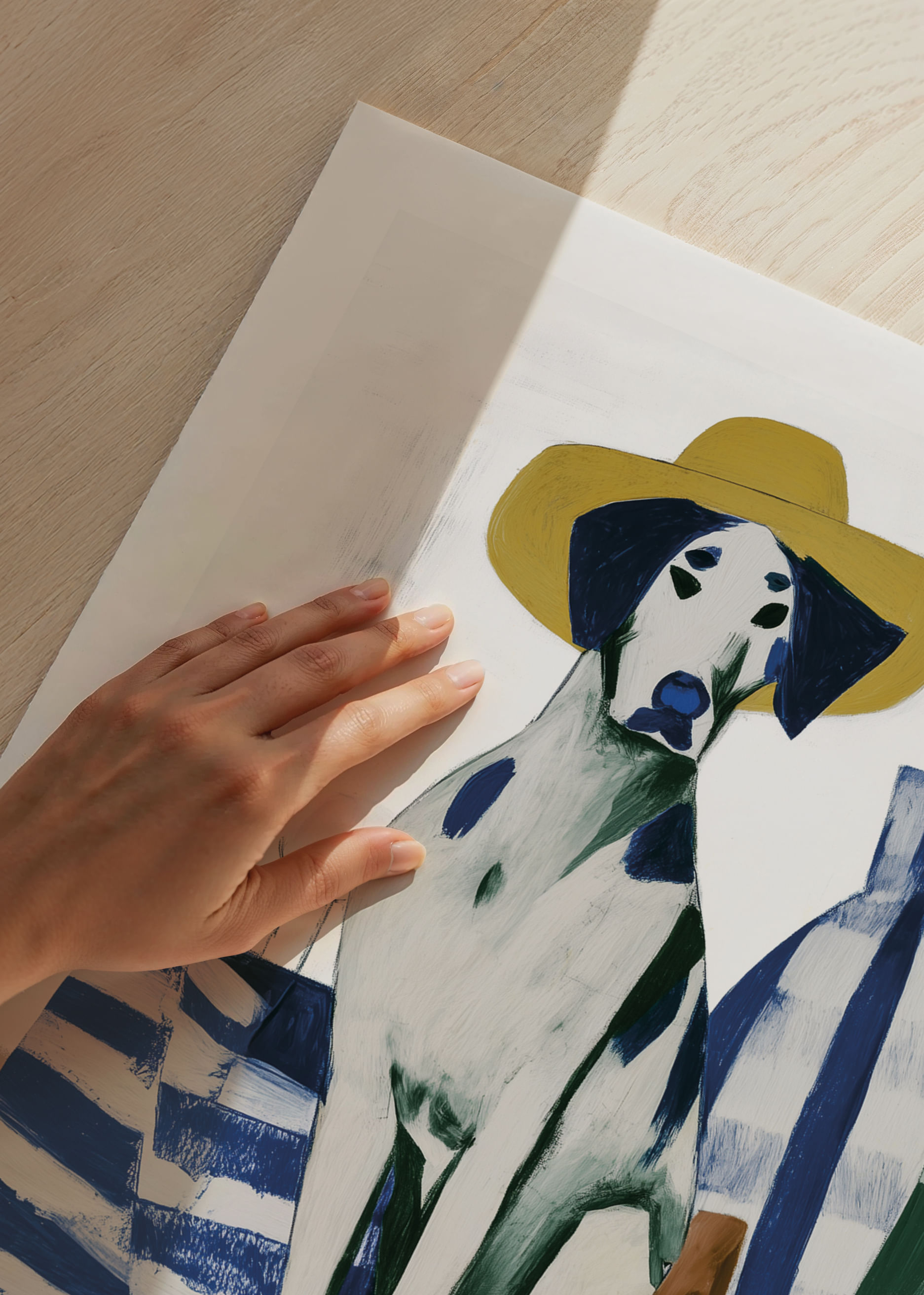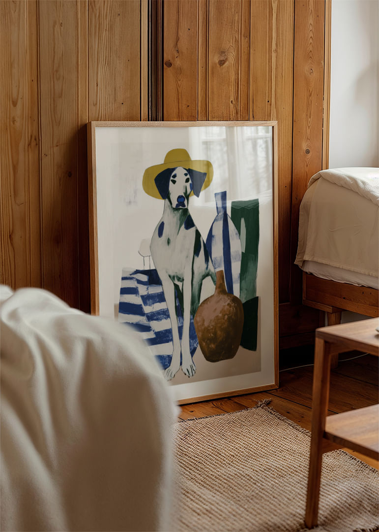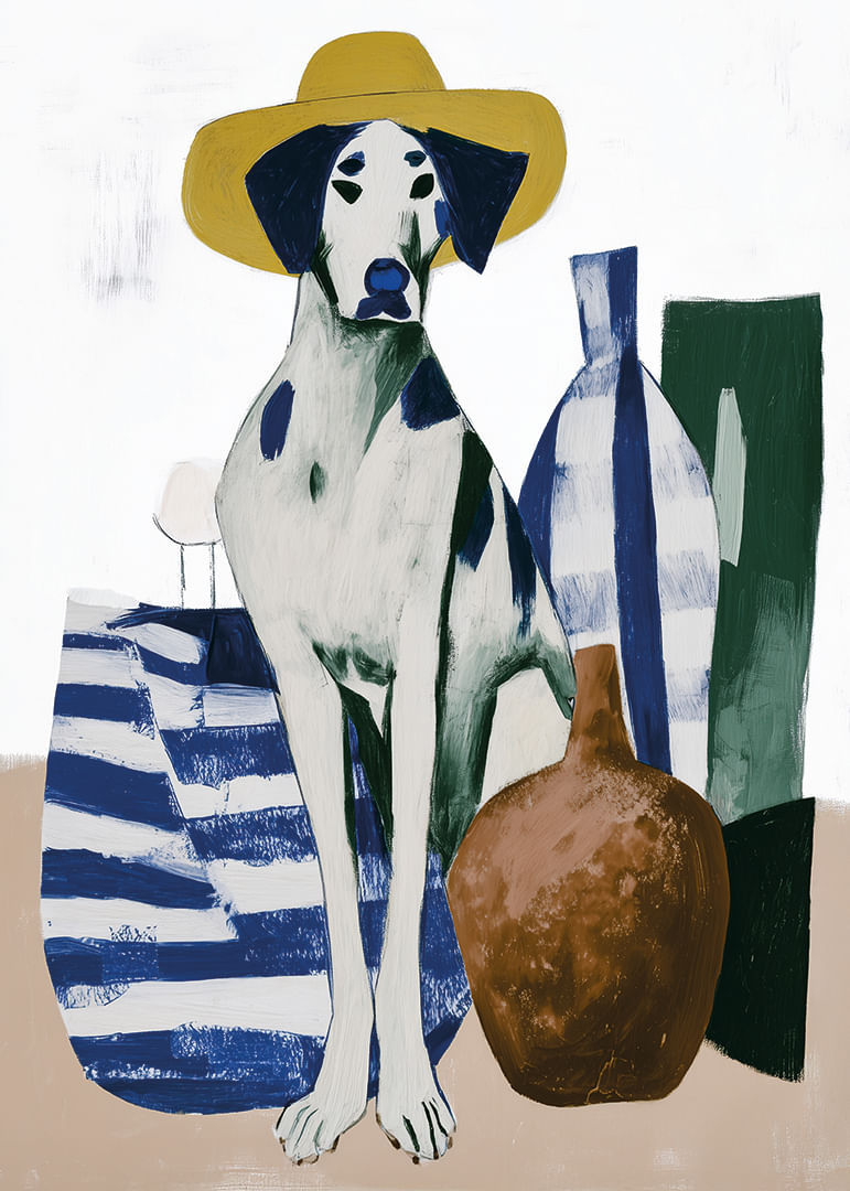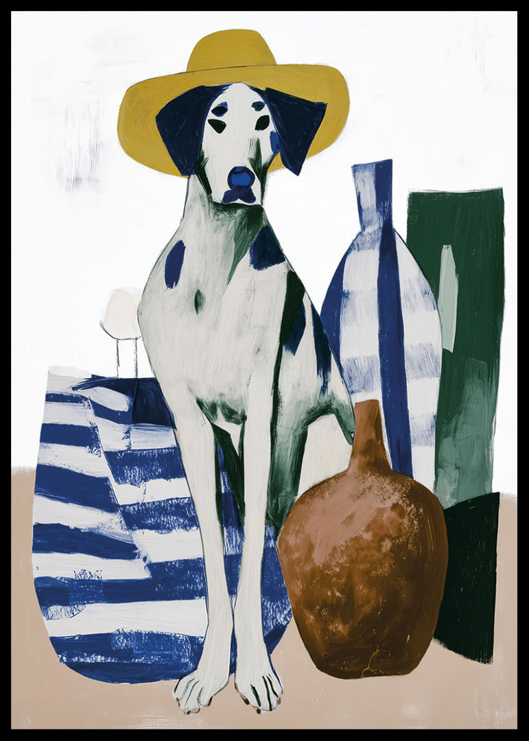Postern fångar en elegant hund med stilfulla ränder som ger en känsla av konstnärligt lugn. Den färgglada hatten och de geometriska formerna förstärker bildens charm och skapar en iögonfallande komposition. Denna poster är perfekt för den som vill tillföra en touch av humor och stil till sitt vardagsrum. Hundens lugna blick ger rummet en känsla av sofistikerad lekfullhet.