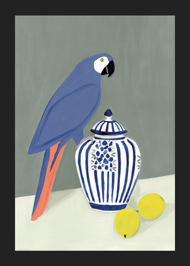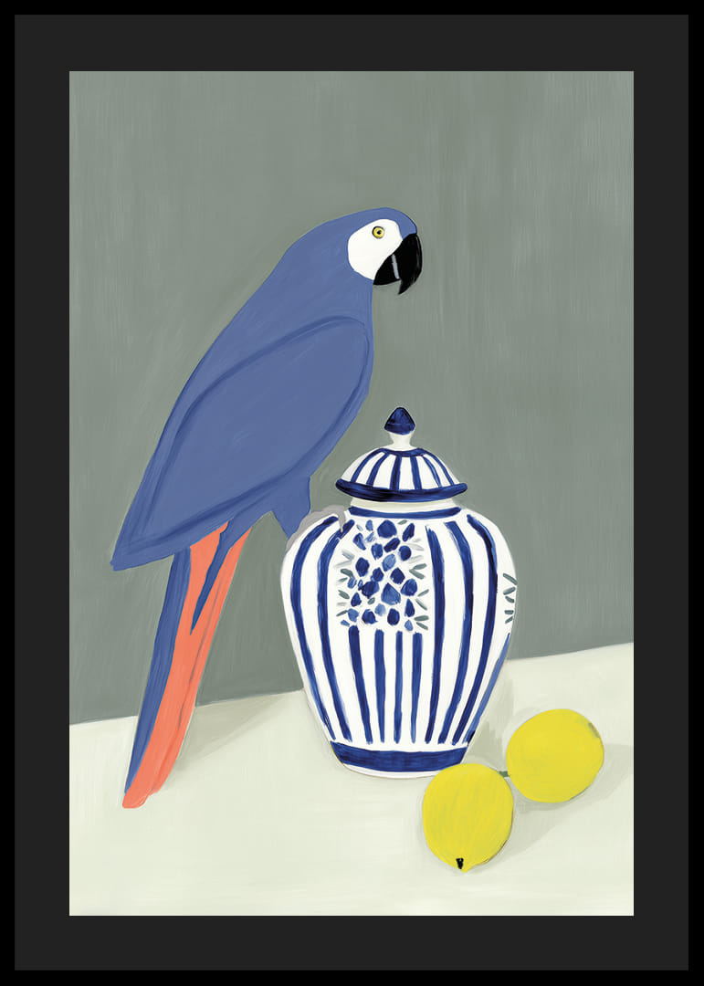 Denna poster fängslar med sin eleganta papegoja i intensivt blått mot en lugn grå bakgrund. Fågeln sitter stolt bredvid en vackert mönstrad kanna och två gula citroner, vilket skapar en harmonisk kontrast av färger. Denna poster sprider en känsla av lugn och sofistikation, perfekt för att förhöja atmosfären i vilket rum som helst och tillföra en touch av konstnärlig stil.