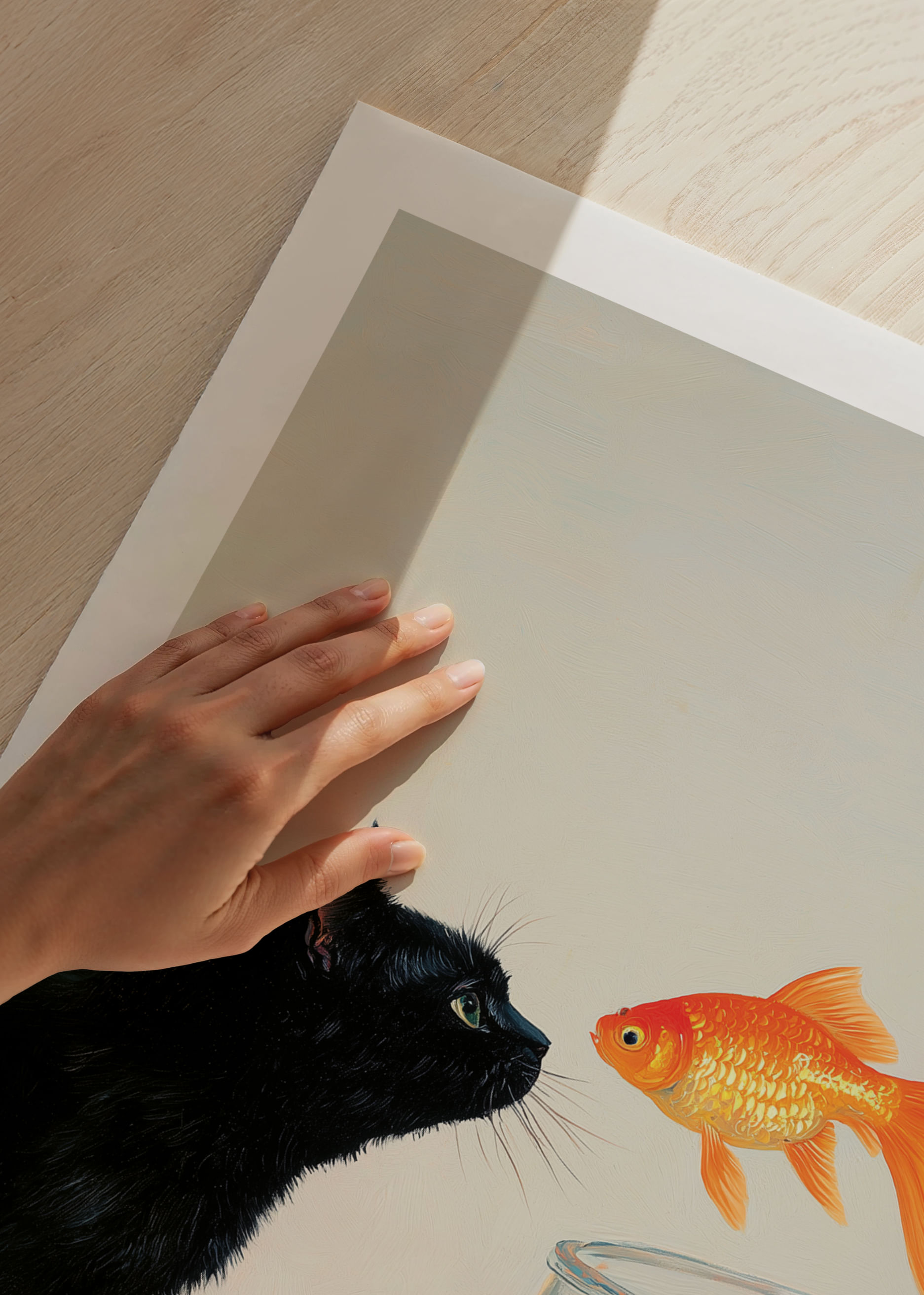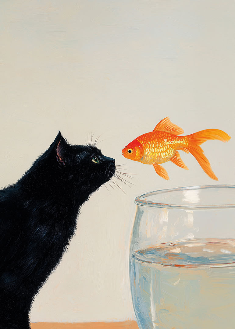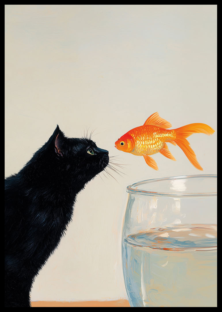 Denna poster fångar en magisk och lite humoristisk stund där en svart katt möter en gyllene guldfisk. Det förtrollande samspelet mellan djuren skapar en känsla av nyfikenhet och charm. Med kattens intensiva blick och fiskens graciösa flytande rörelse ger postern ett unikt fokus i rummet och blir ett samtalsämne som förstärker atmosfären med färgstarkt liv och inbjudande värme.