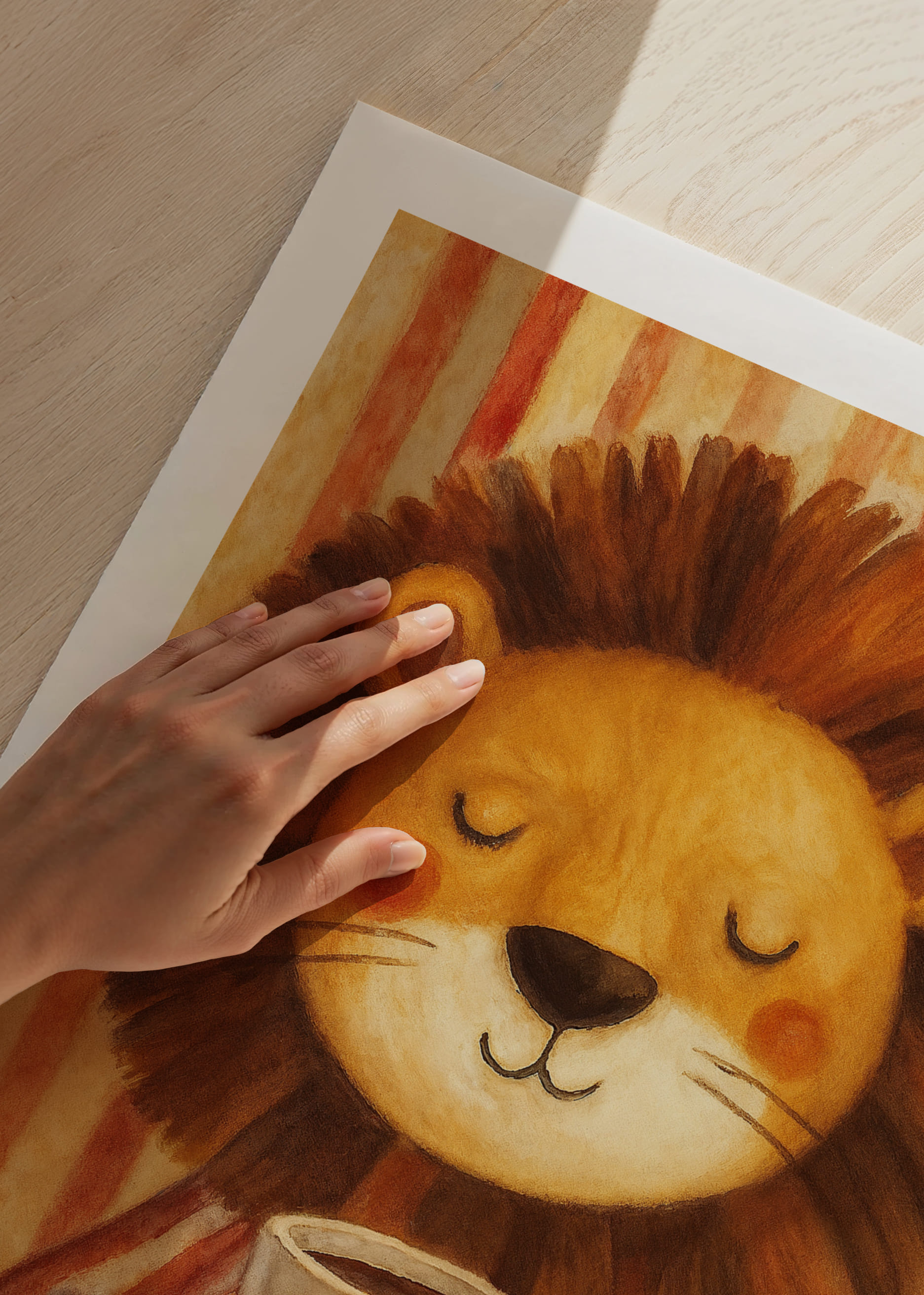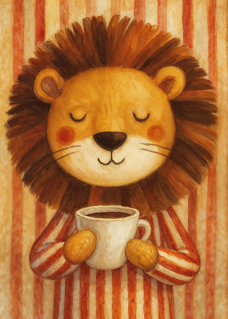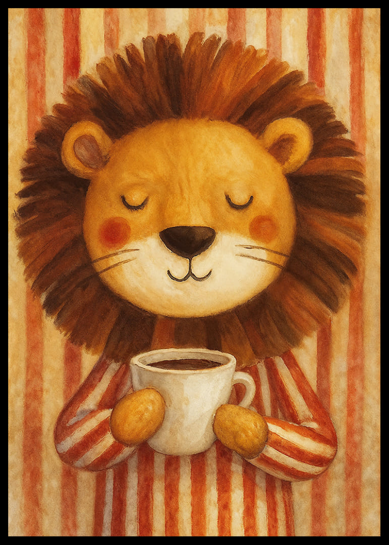 Denna poster av ett leende lejon i randig pyjamas som håller en kaffekopp fångar en varm och hemtrevlig atmosfär. Den rogivande bilden med sina milda färger och det avslappnade uttrycket hos lejonet för med sig en känsla av trygghet och komfort. Perfekt för att förstärka trivseln i köket eller barnrummet, fungerar denna poster som en charmig påminnelse om att njuta av livets enkla stunder.