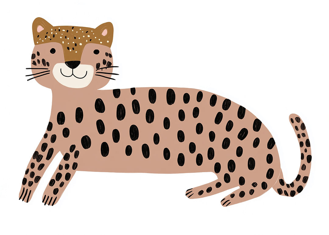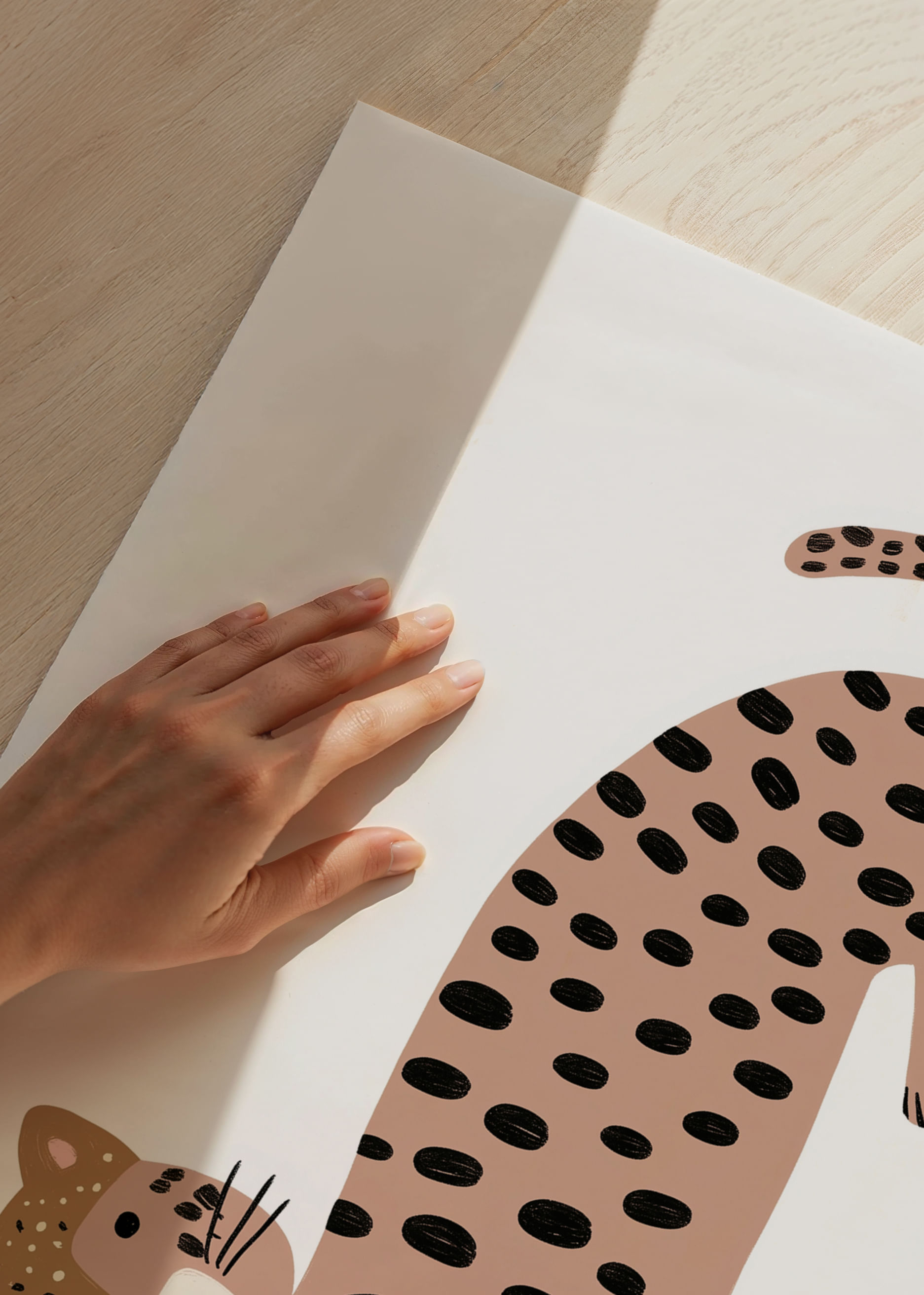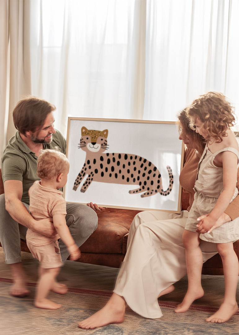 Denna poster fångar omedelbart uppmärksamheten med sin charmiga leopard i en lekfull design. Leopardens mjuka färger och stora prickar ger en känsla av glädje och livfullhet. Kombinationen av stiliserade detaljer och vänliga uttryck gör att denna poster skapar en varm och inbjudande atmosfär. Perfekt för att ge barnrummet eller vardagsrummet en dos av karaktär och personlighet.