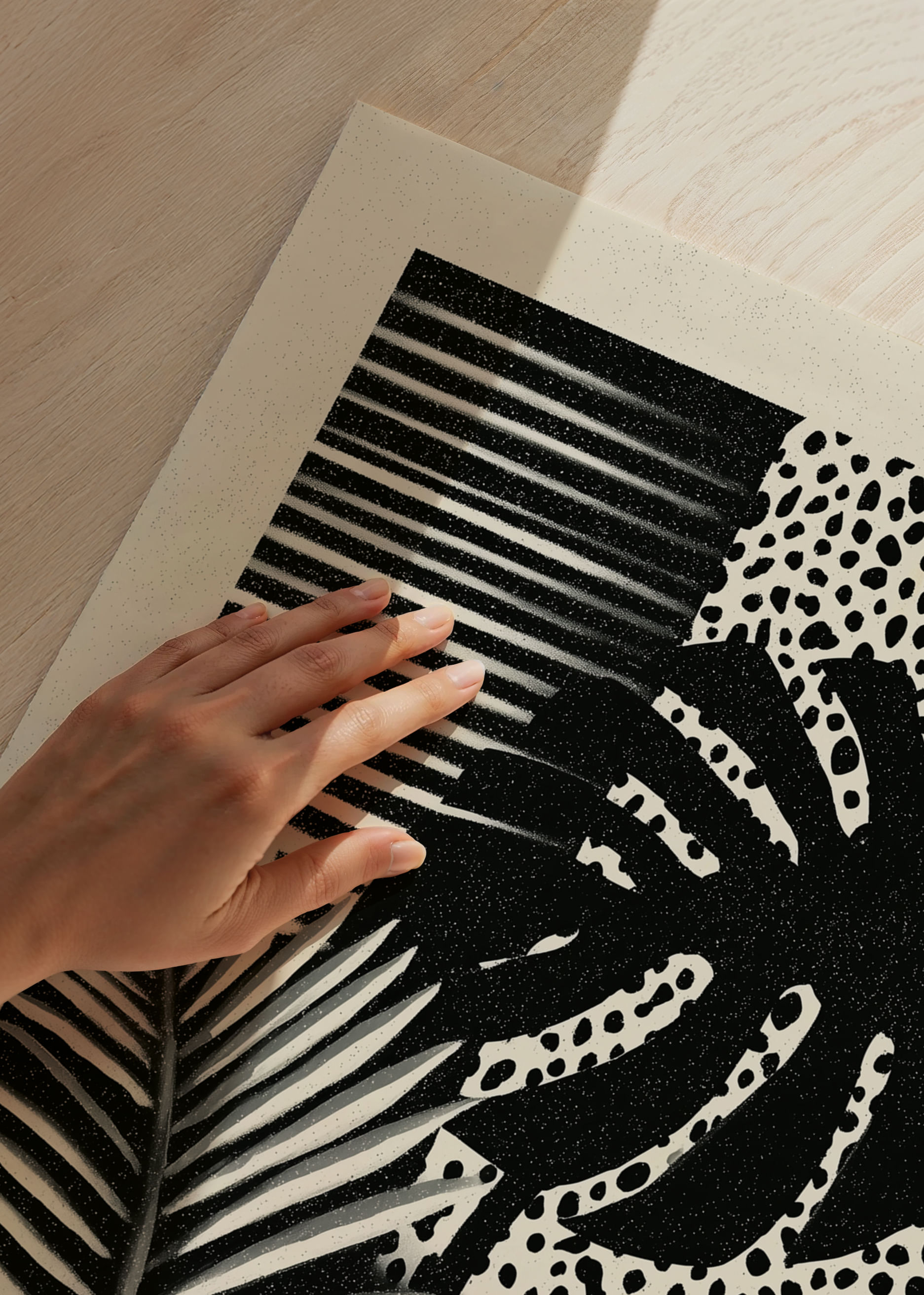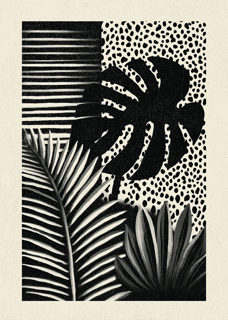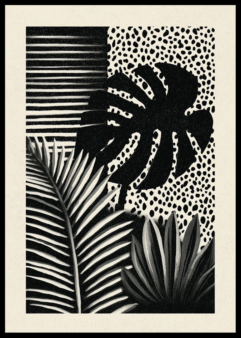 Denna fascinerande poster visar en stilfull tolkning av djungeln i svartvitt. Med dramatiska silhuetter av palmblad mot en djärv grafisk bakgrund skapas en hypnotisk mix av rytm och natur. Postern ger en modern touch till ditt hem och erbjuder en tidlös elegans som förhöjer interiörens atmosfär. Perfekt för den som uppskattar både stil och subtilt drama i sin inredning.