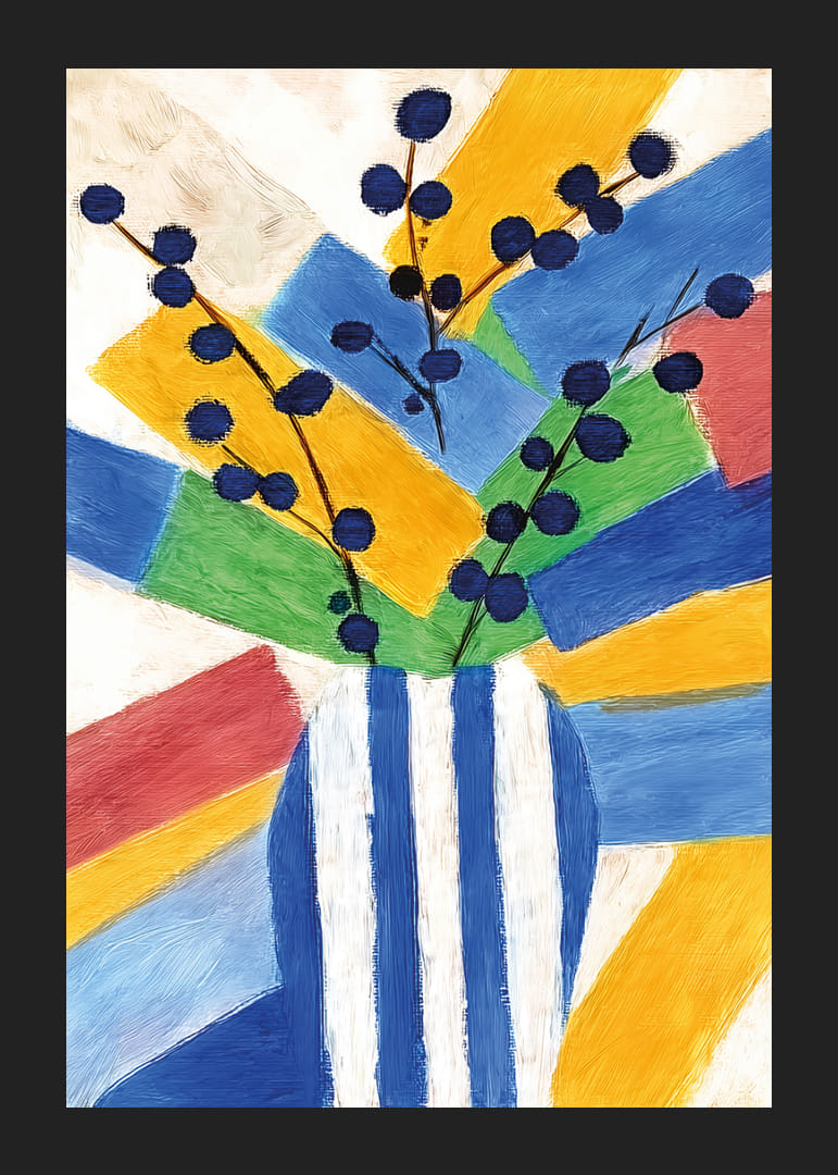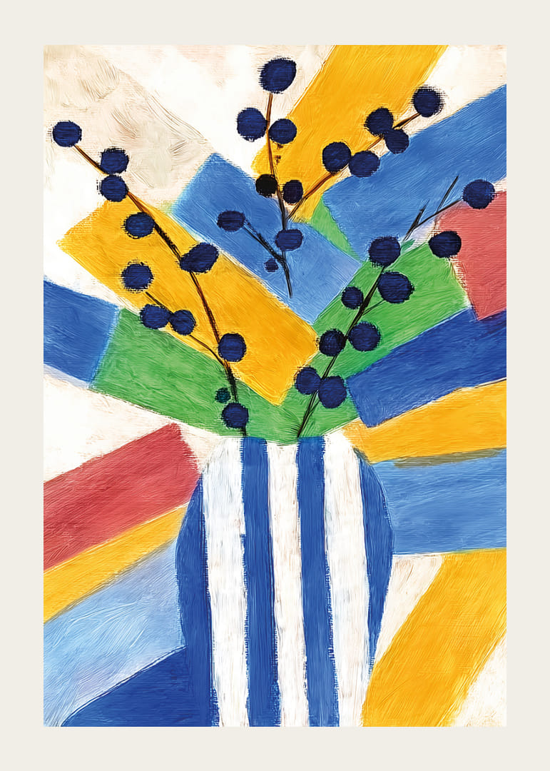 Denna poster fångar omedelbart uppmärksamheten med sina livfulla färger och modiga geometriska former. De blå och gula nyanserna harmonierar elegant med de djärva svarta linjerna, vilket skapar en dynamisk och upplyftande känsla. Denna poster förhöjer atmosfären i vilket rum som helst genom sin konstnärliga charm och energi, och ger en modern touch till ditt hem.