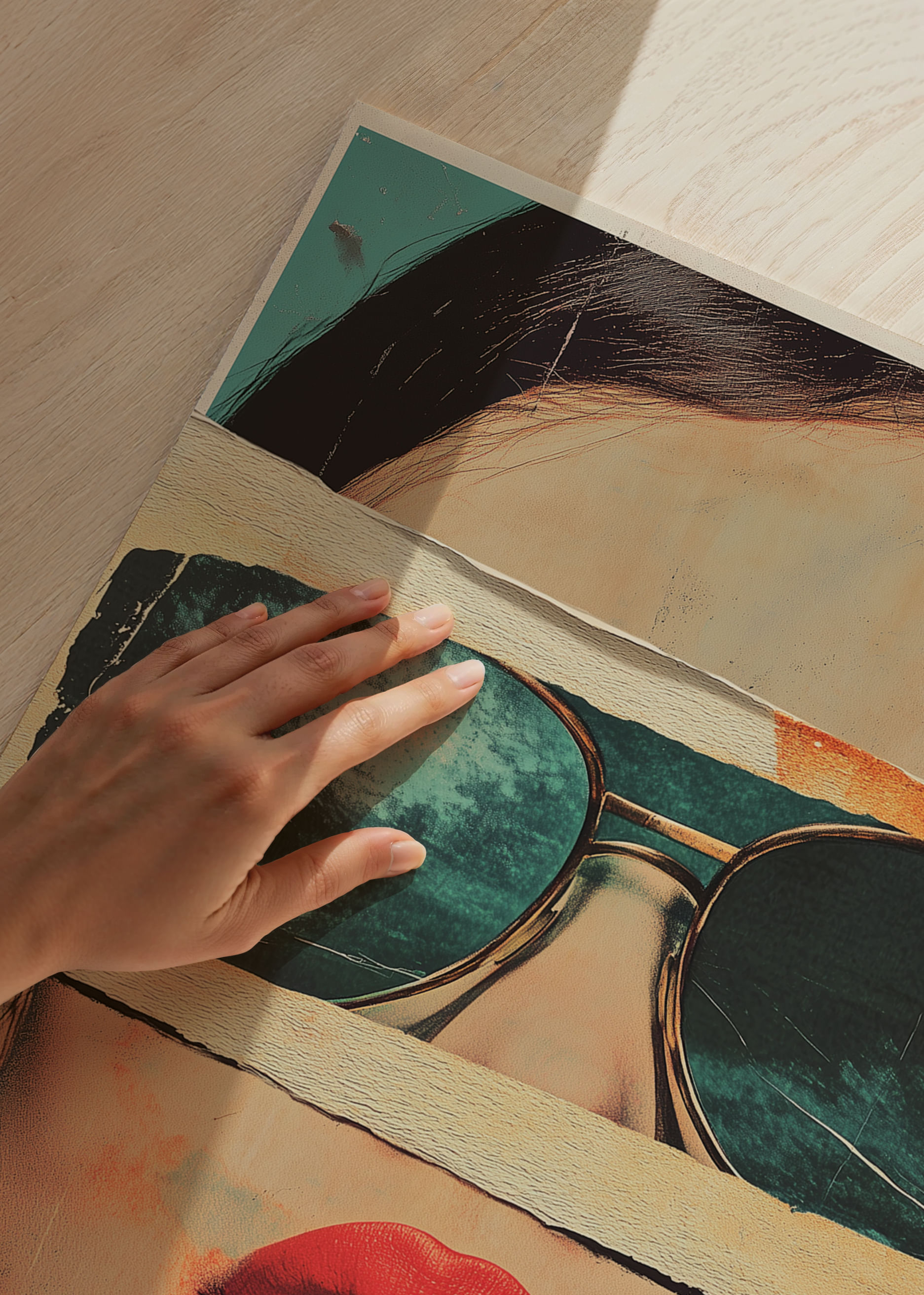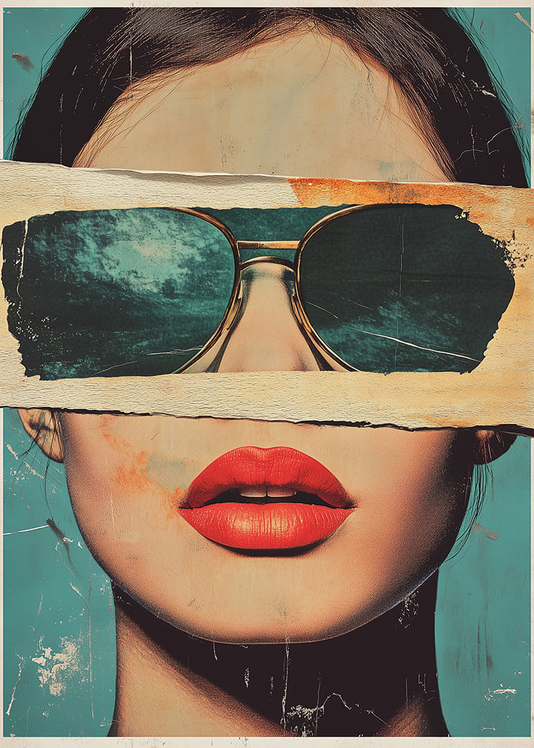 Denna poster fångar blicken med sin färgstarka retrodesign där djärva röda läppar framträder mot bakgrundens turkosa nyanser. Det distinkta modet från en svunnen tid skapar en känsla av tidlös glamour. Solglasögonen i fokus ger en mystisk och chic touch. Denna poster blir ett iögonfallande tillskott i varje rum, vilket ger ett stänk av karaktär och stil till din inredning.
