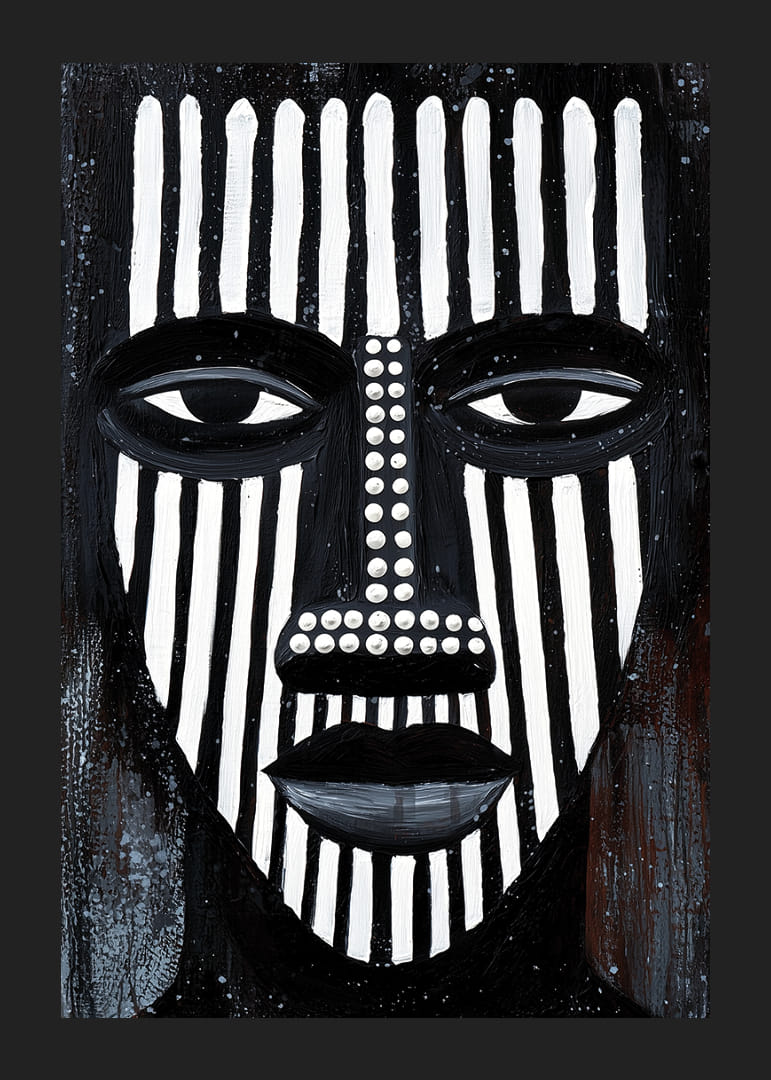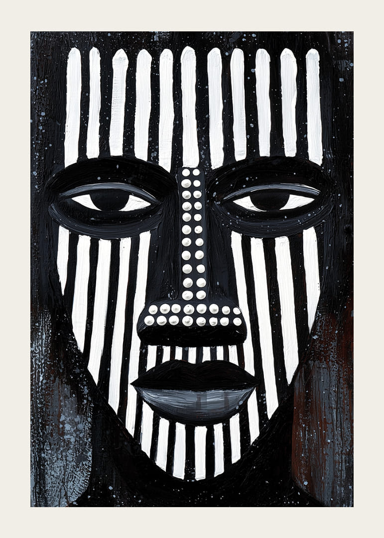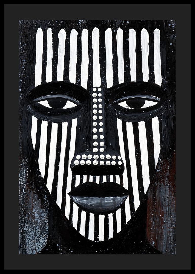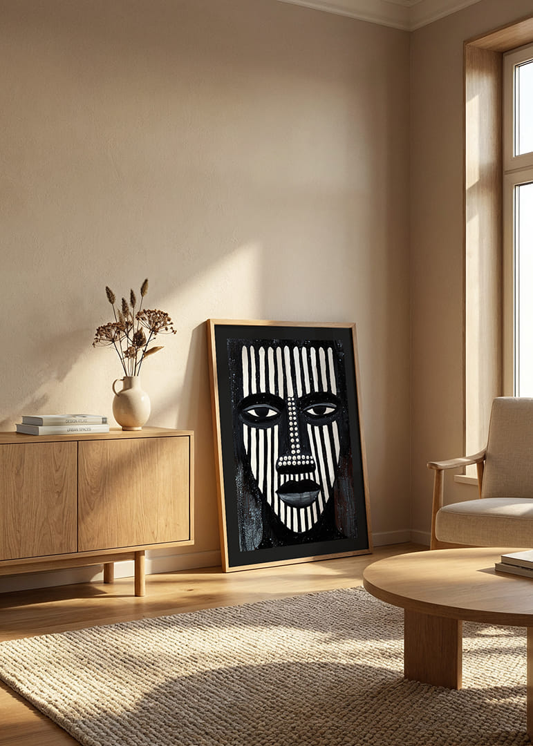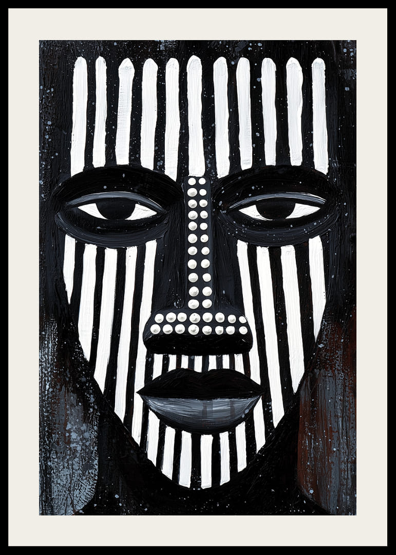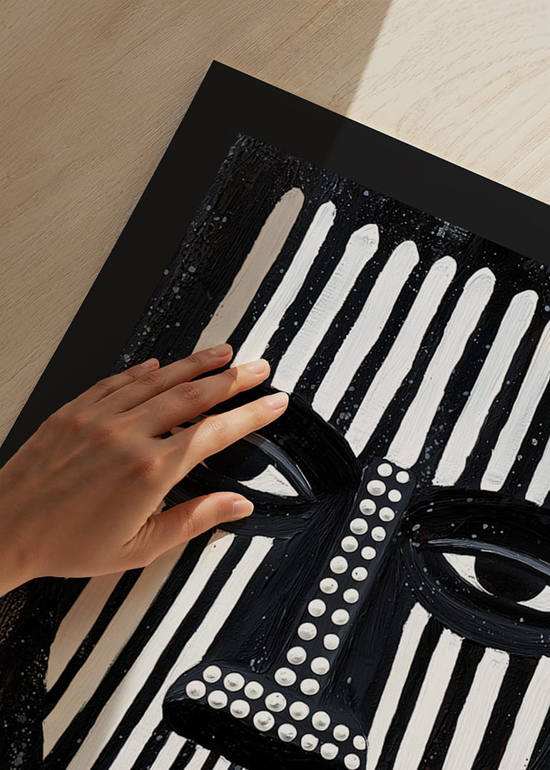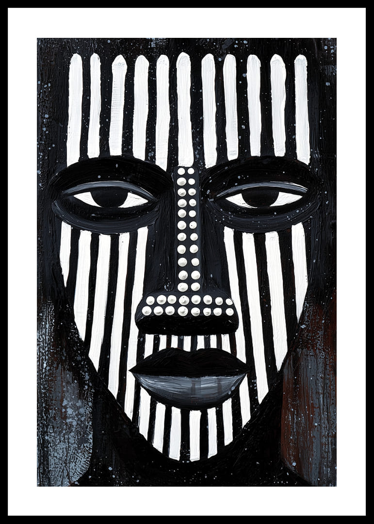 Postern fångar uppmärksamheten med sina djärva svartvita linjer som bildar ett kraftfullt ansikte. Det linjära mönstret ger en hypnotisk känsla, vilket skapar en atmosfär av mystik och introspektion. De geometriska formerna och strategiska färgväxlingarna bidrar till en visuell dynamik. Denna poster blir ett centrum för reflektion och stil i vilket rum den än placeras.