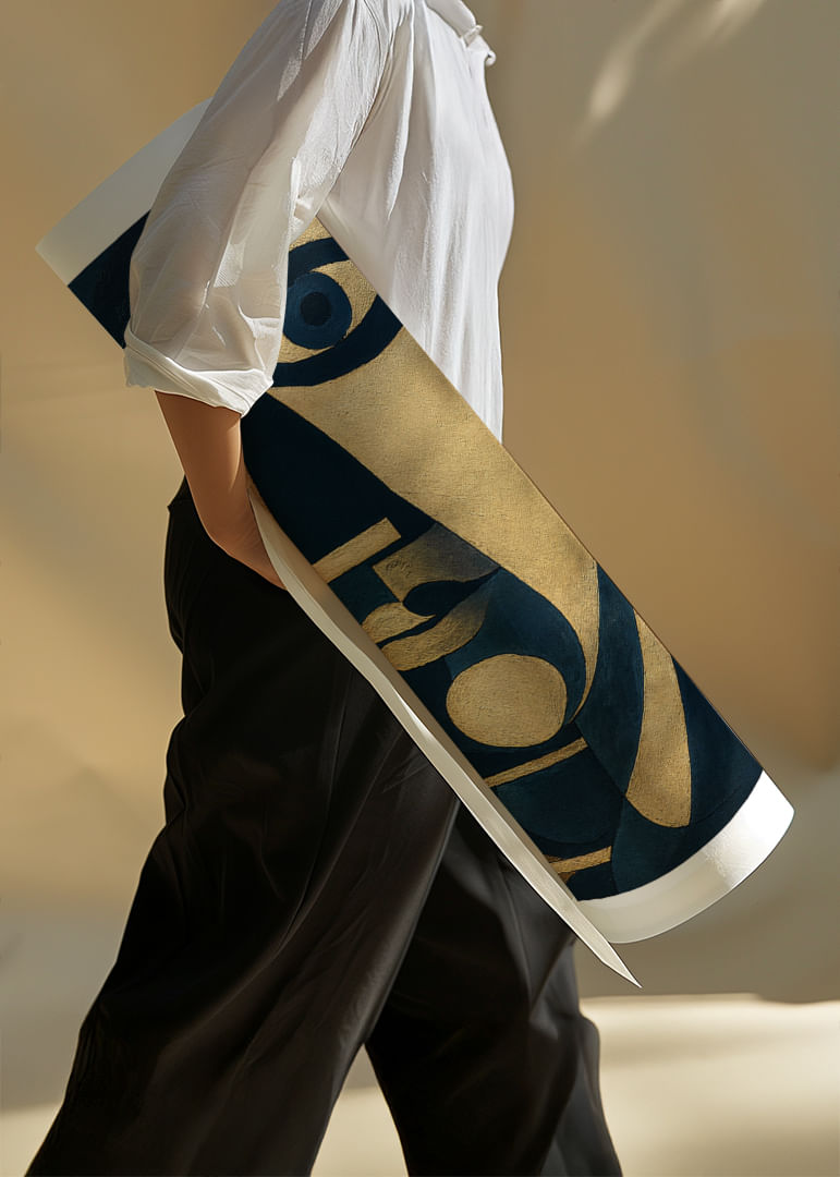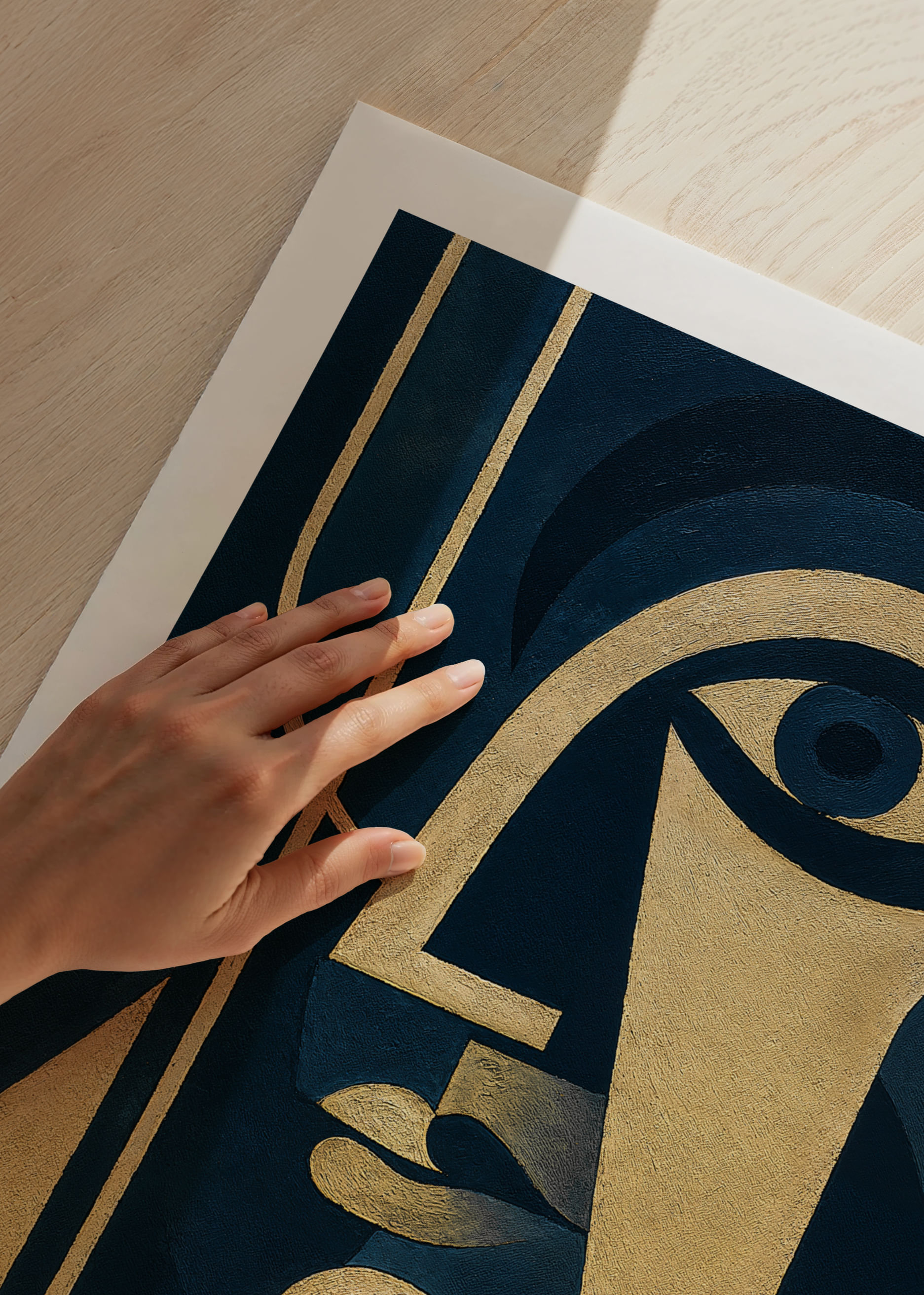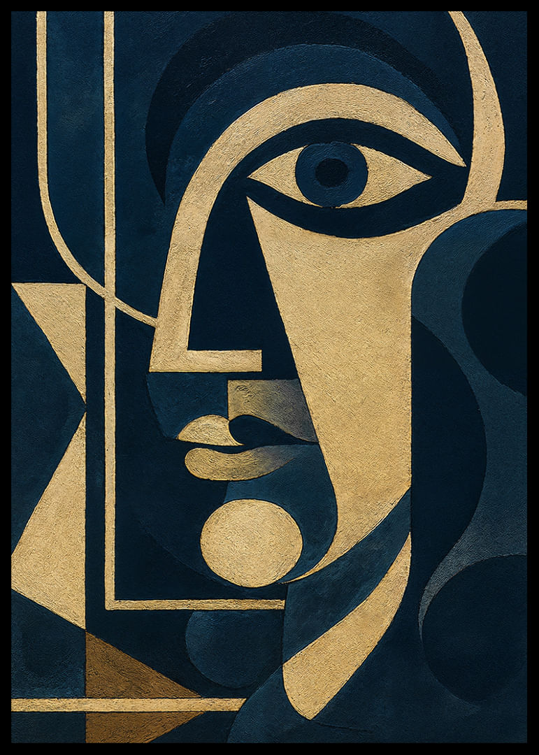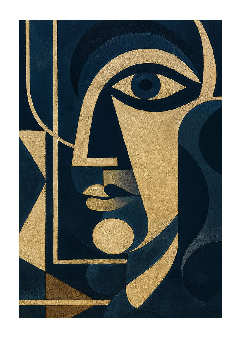 Utforska en värld av abstrakt elegans med denna poster som fångar ögat genom sina djupa blå och gyllene toner. De geometriska formerna skapar en känsla av mystik och raffinerad skönhet, vilket bjuder in till kontemplation och beundran. Perfekt för att tillföra en känsla av sofistikation och stil i vardagsrummet, blir postern en central del i din heminredning som inspirerar och fascinerar.