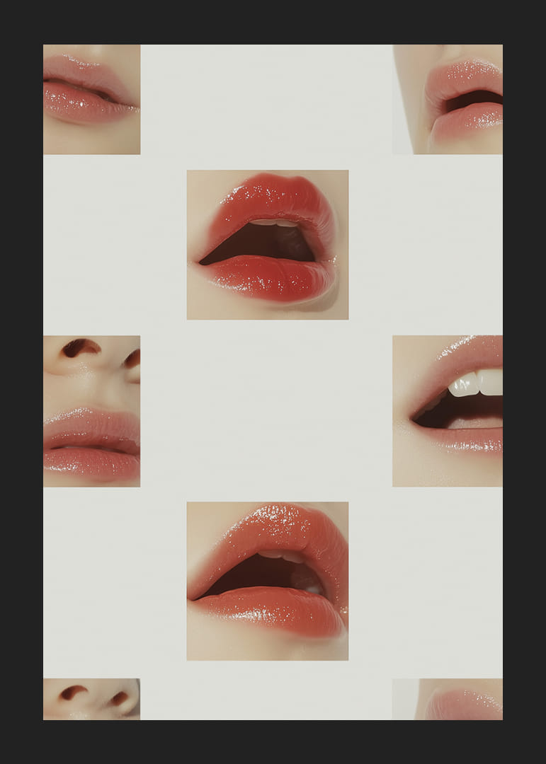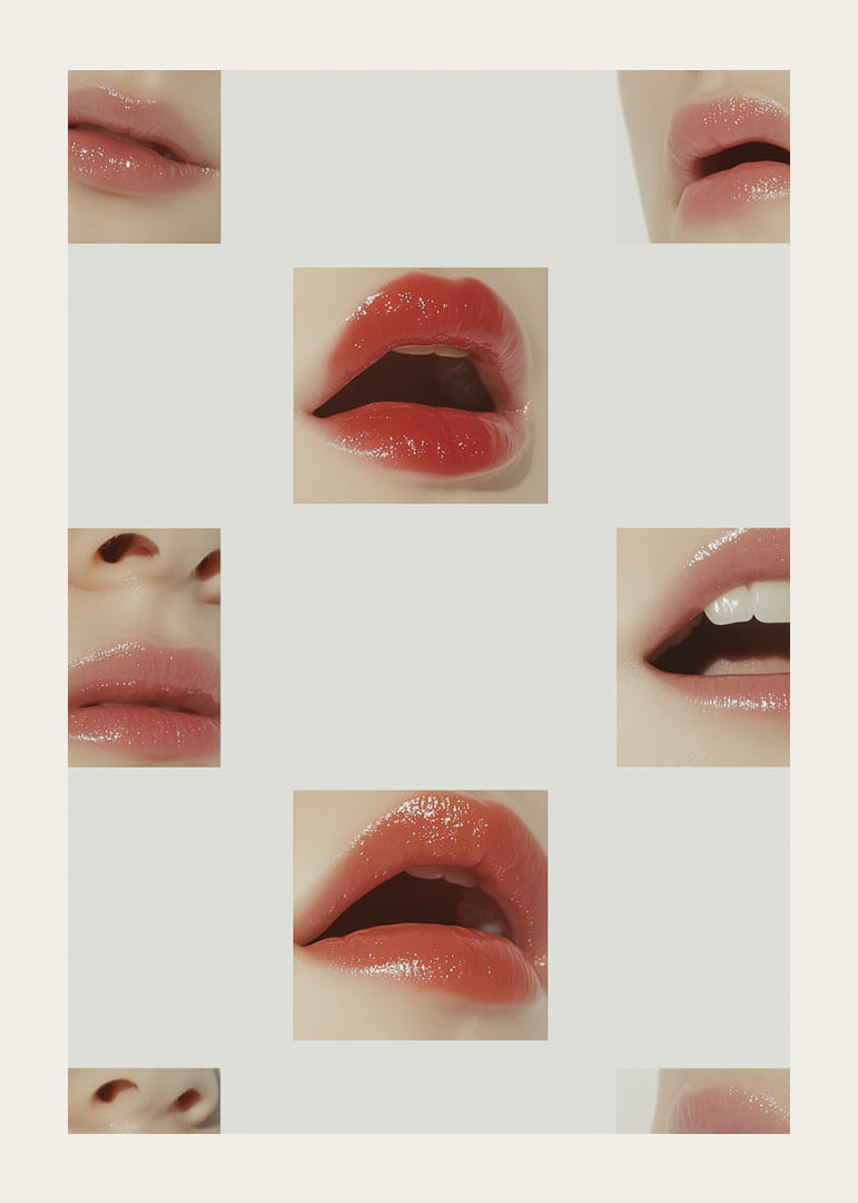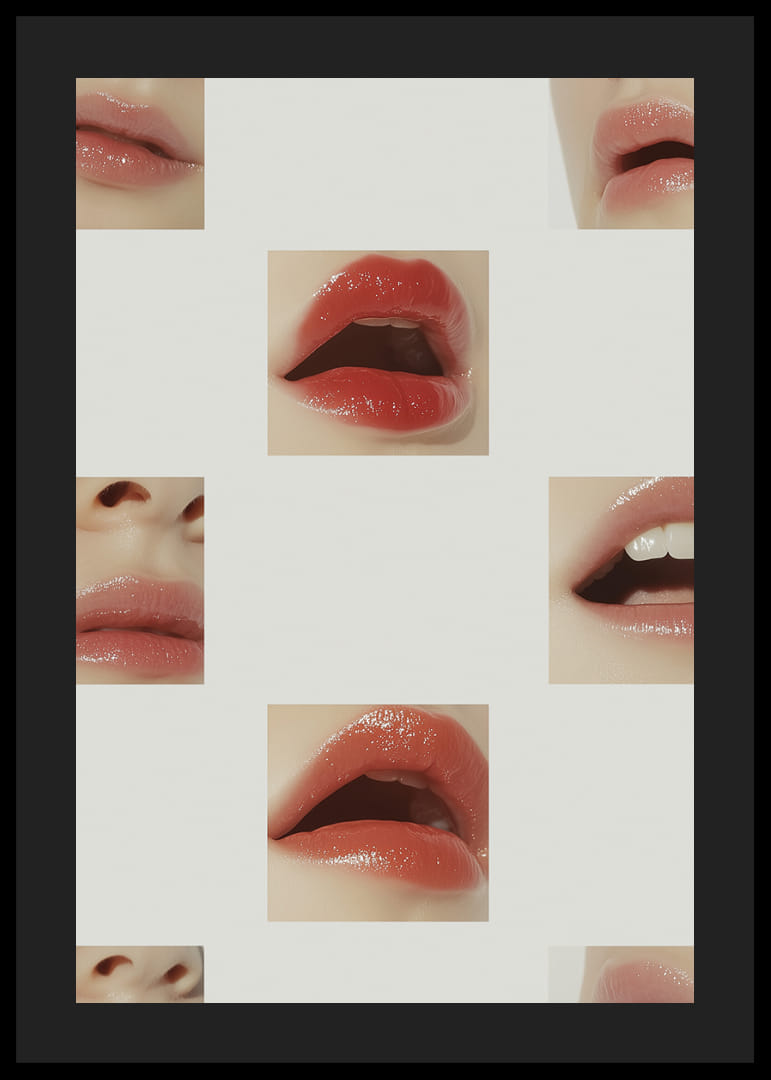 Med omedelbar hänförelse fångar denna poster blicken med sina fängslande läppar i en subtil mosaik. De glänsande nyanserna och texturerna skapar en förtrollande atmosfär som lockar till långvarig betraktelse. Postern fungerar som en elegant och modern detalj som förhöjer stämningen i varje rum genom att framhäva enkelhet och skönhet i sin renaste form.