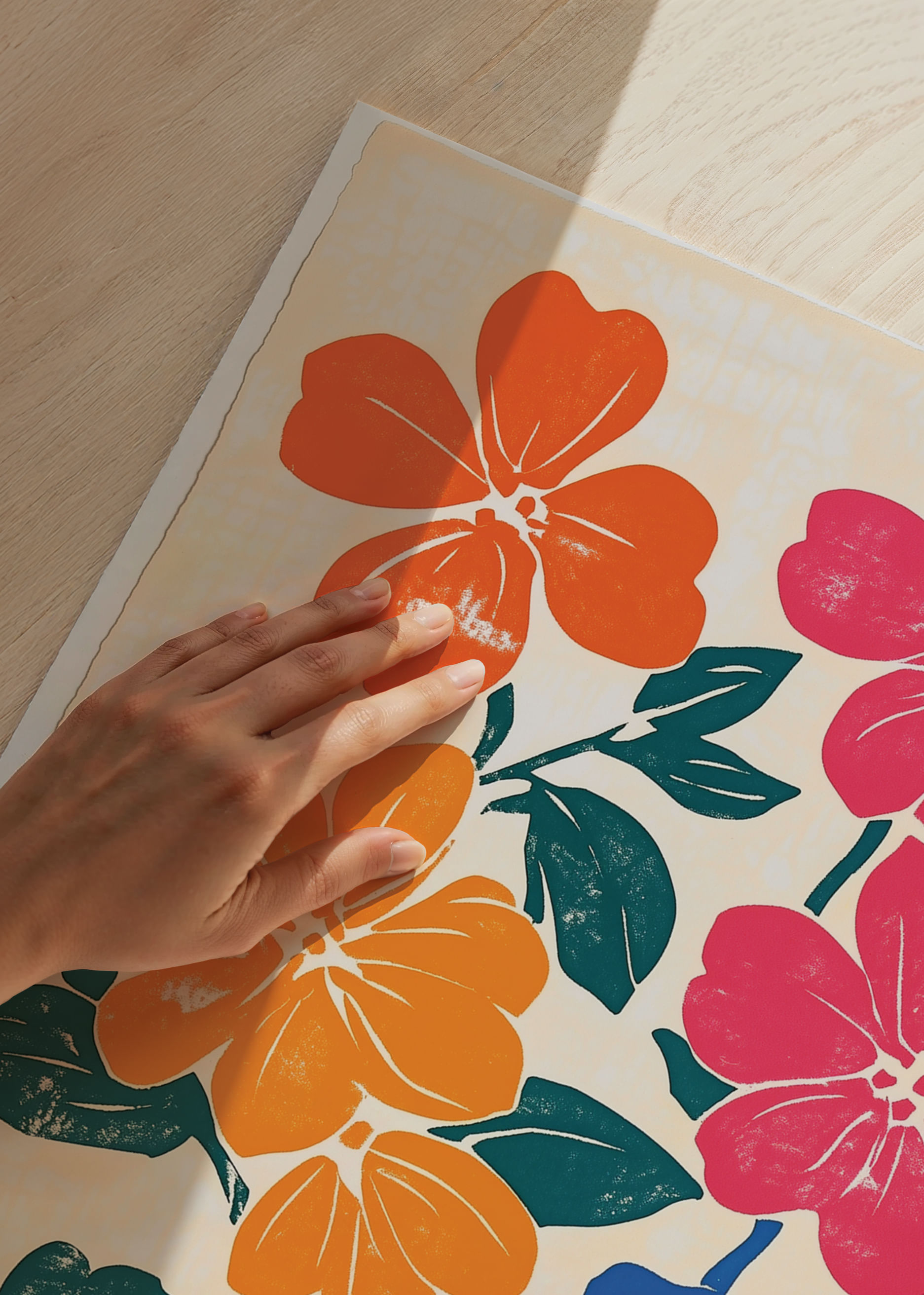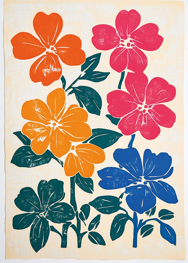Denna poster fångar omedelbart uppmärksamheten med sina livliga och färgglada blommor, som står i full blom mot en mjuk bakgrund. Varje blomma är unik, med djärva färger i orange, rosa, blått och grönt som harmoniserar perfekt. Postern skapar en stämning av glädje och vitalitet, vilket gör den idealisk för att lysa upp vilket rum som helst och ge det en frisk och upplyftande atmosfär.