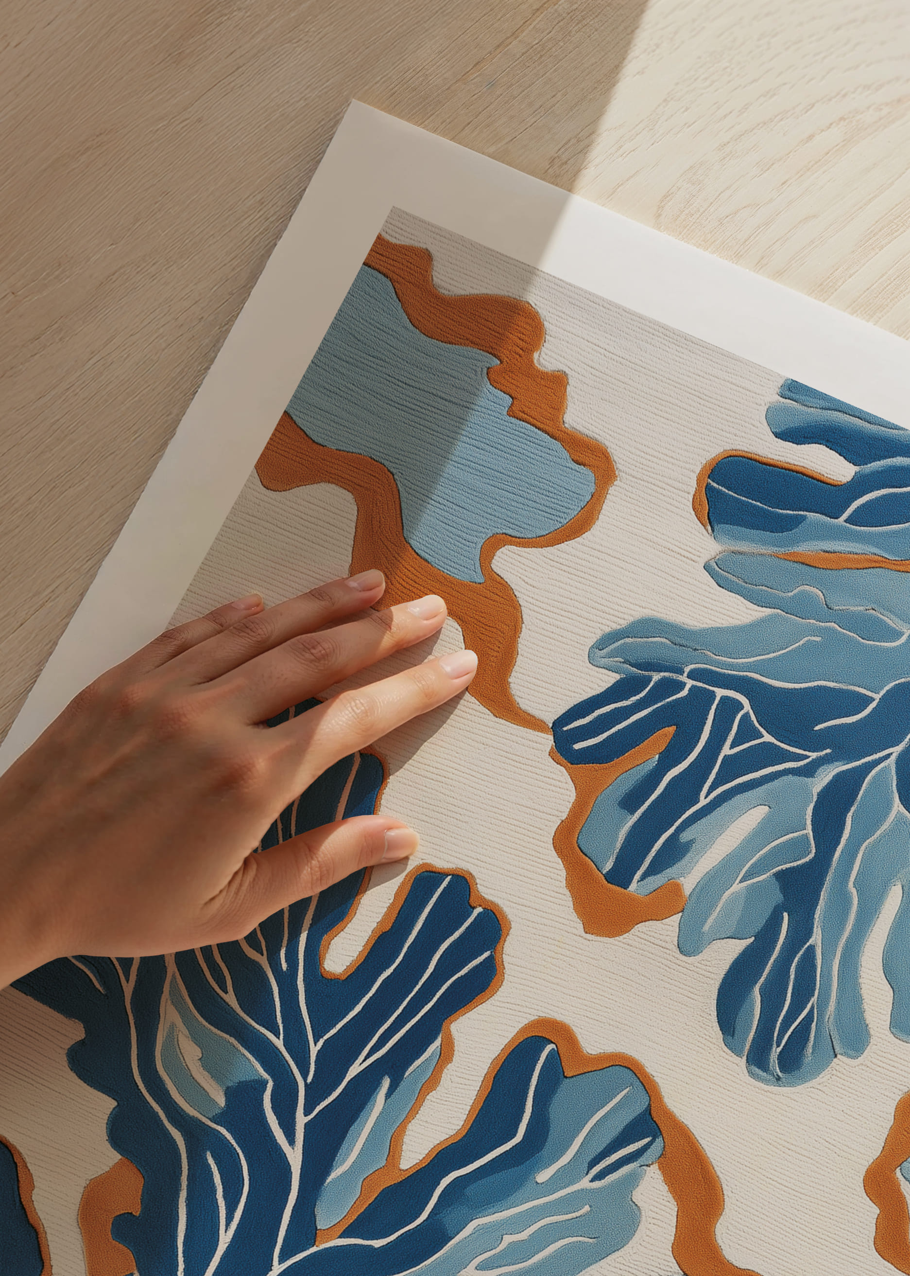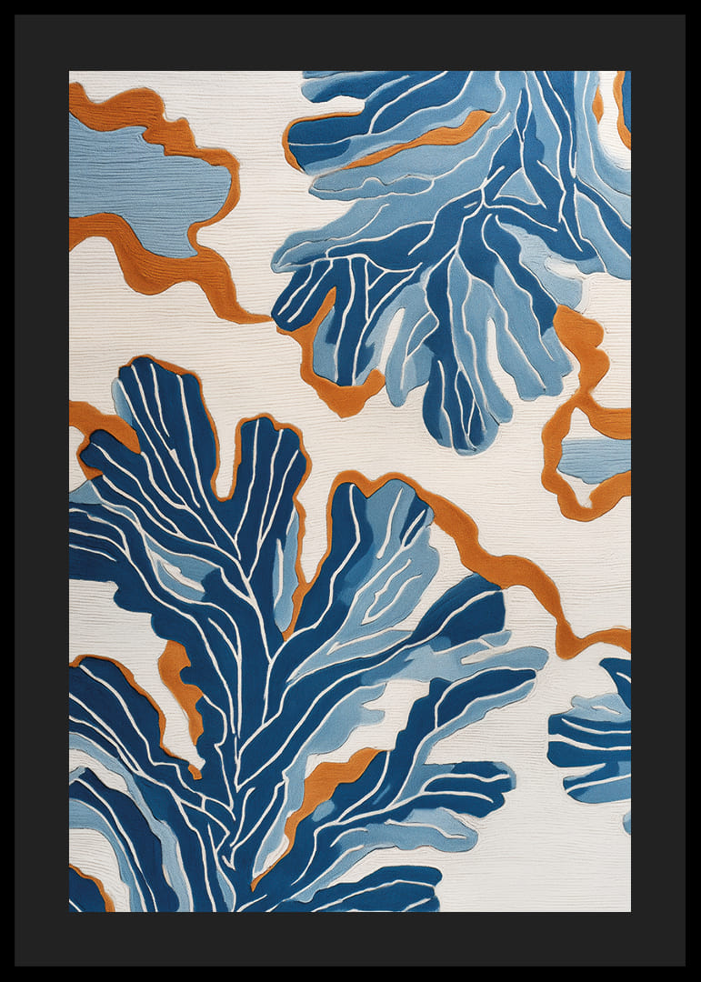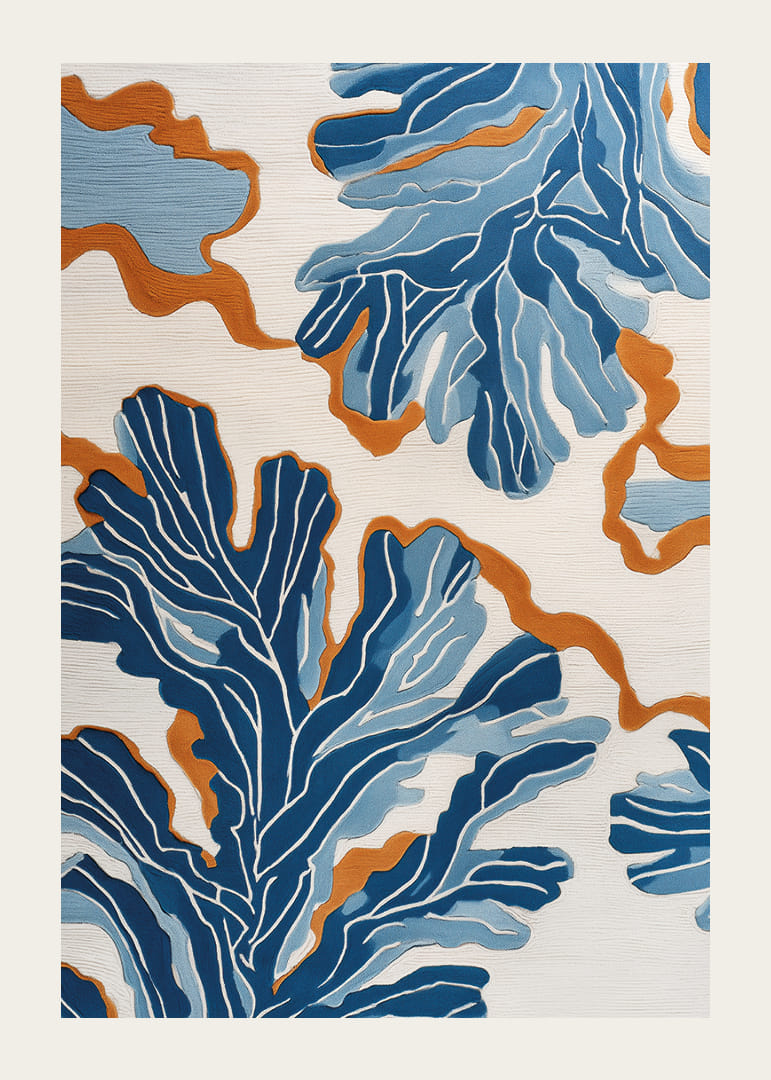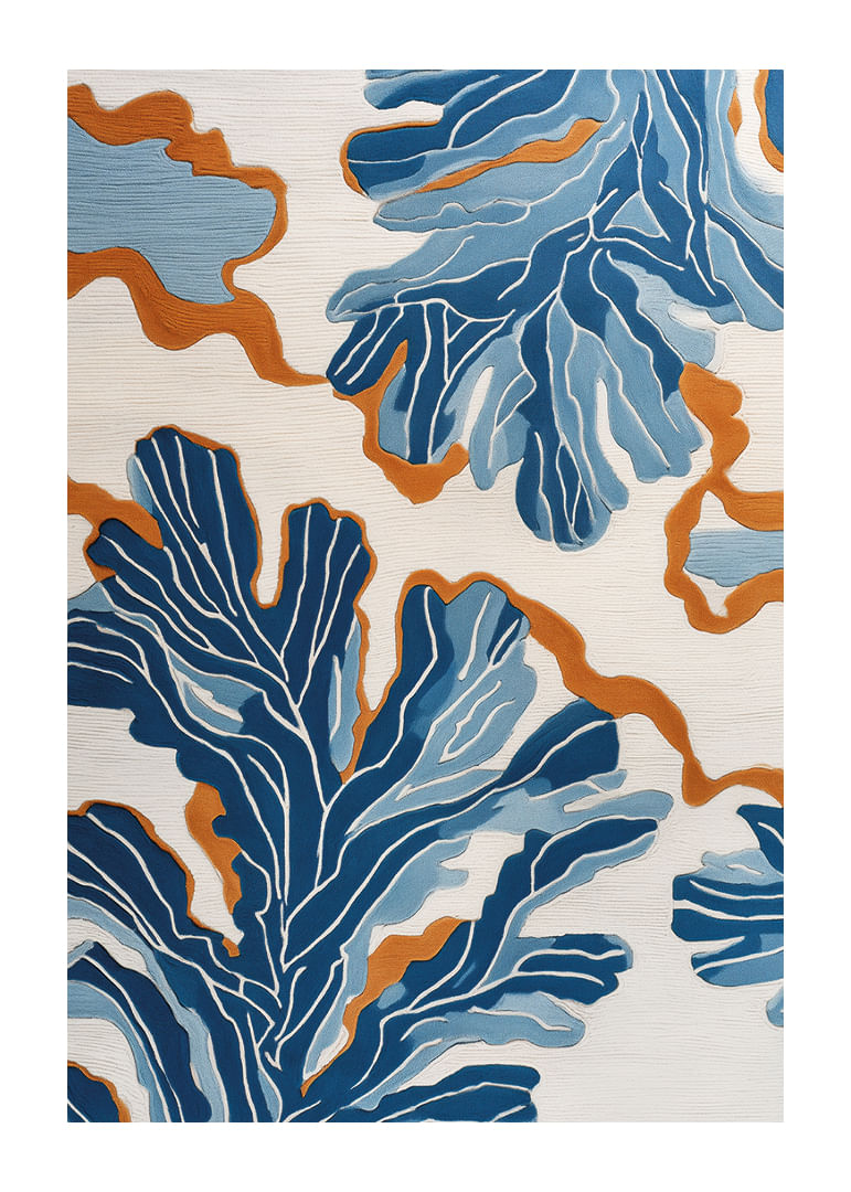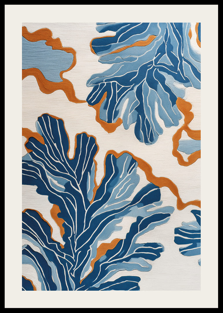 Denna poster fångar omedelbart blicken med sina livfulla blå mönster som liknar havets rörelser över en jordnära bakgrund. Färgpaletten skapar ett harmoniskt spel mellan kontrasterande blå och varma toner som känns både lugnande och energigivande. Med sin unika design blir postern ett kraftfullt tillskott till vilket rum som helst, och förvandlar enkelt atmosfären till en stillsam kustupplevelse.