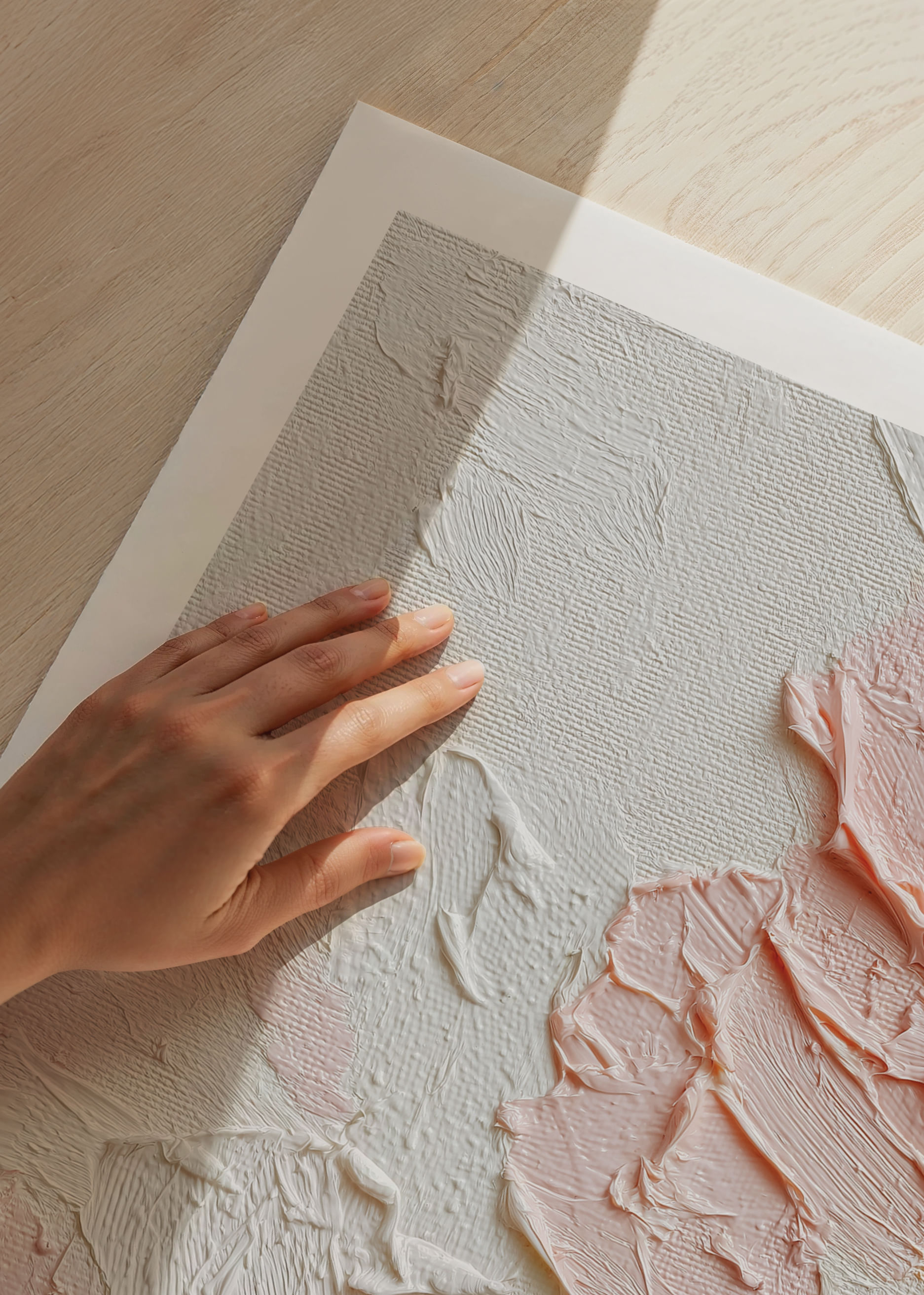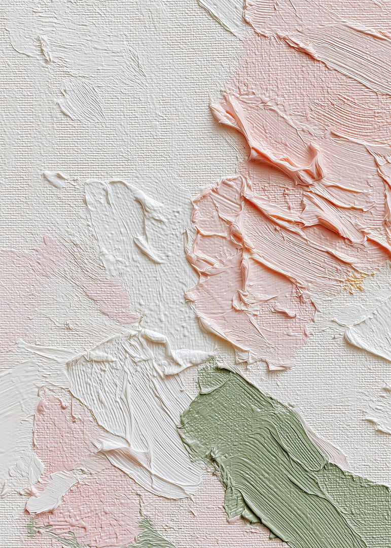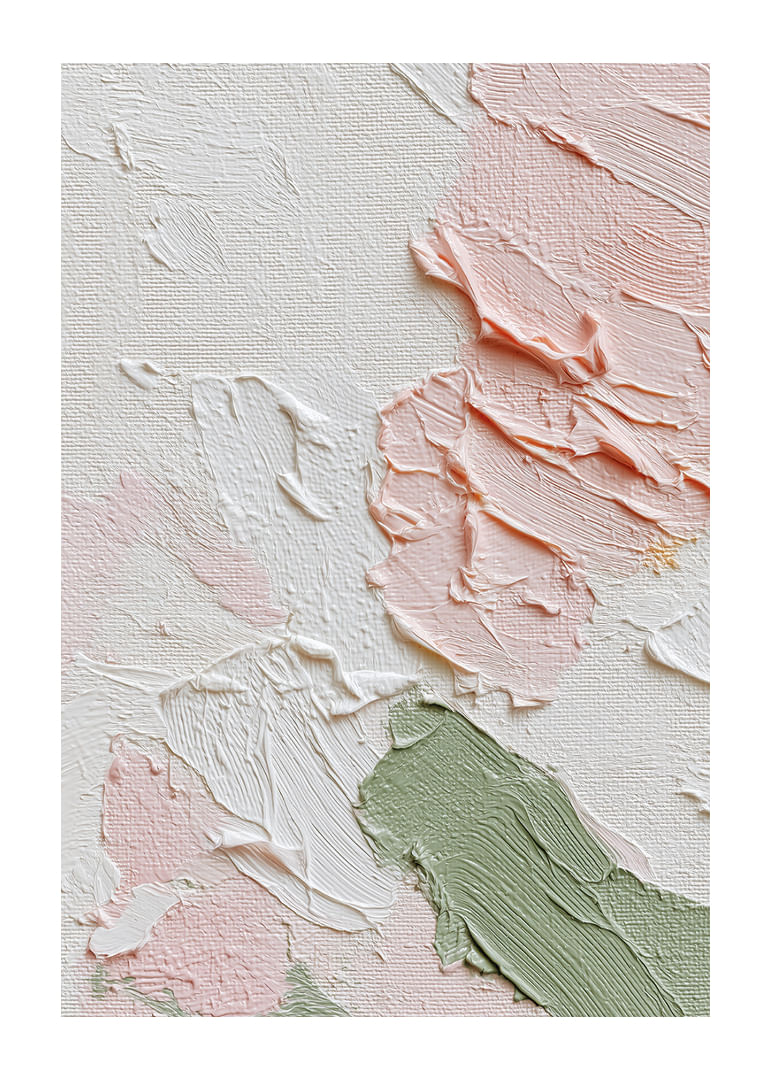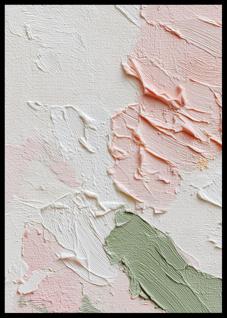Denna poster fångar uppmärksamheten med sina mjuka pastellfärger i rosa, grönt och vitt som varsamt breder ut sig över duken. Det känns som att färgerna nästan viskar till varandra och skapar en känsla av ro och stillhet. Den milda strukturen och de subtila färgtonerna gör att denna poster inte bara dekorerar väggarna utan också bidrar till att göra rummet mer avkopplande och estetiskt tilltalande.