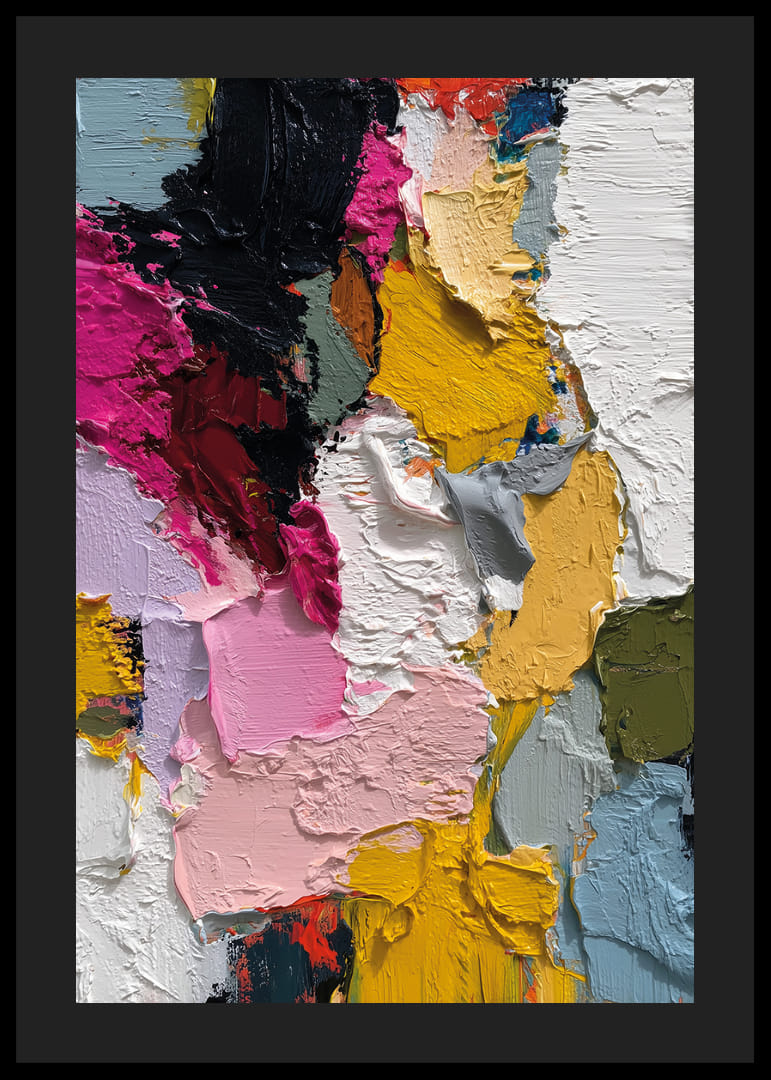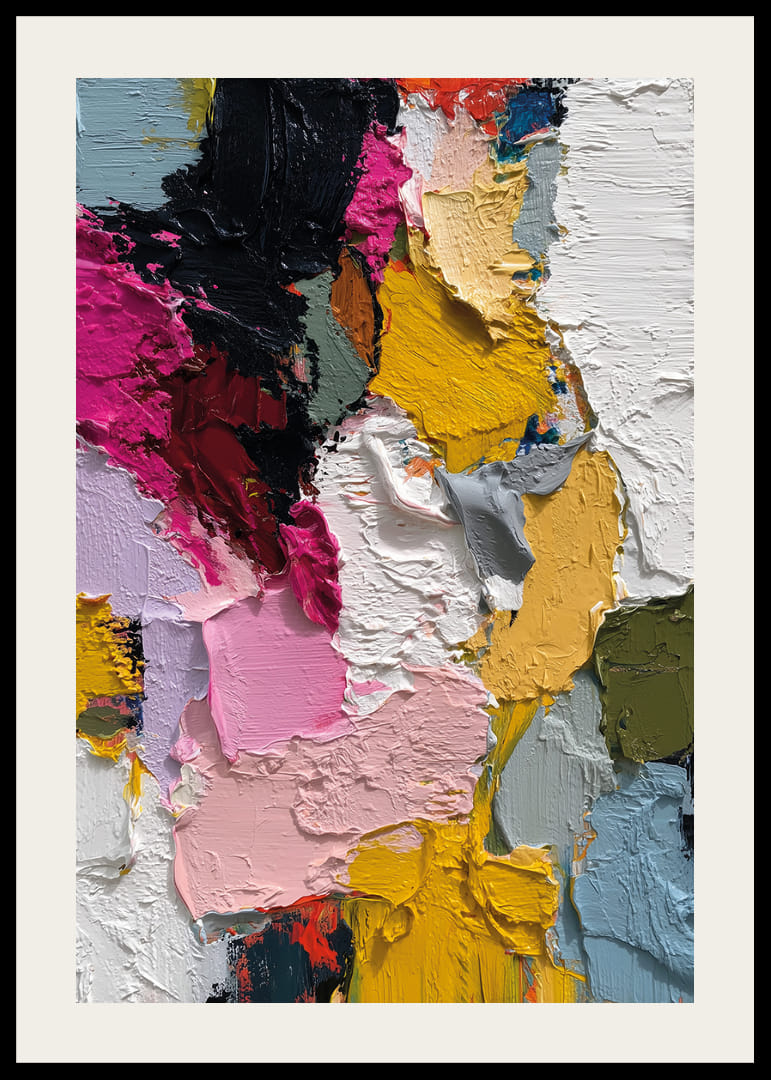 Denna poster är en fest av färg och form, där tjocka penseldrag skapar en kraftfull och livlig komposition. Mjuk rosa möter intensivt gult, medan djup svart och levande blått väver en fascinerande berättelse. Varje lager berättar en egen historia, fångar ögat och sinnet. Med denna poster på väggen förvandlas varje rum till en dynamisk plats fylld med energi och konstnärlig glöd.