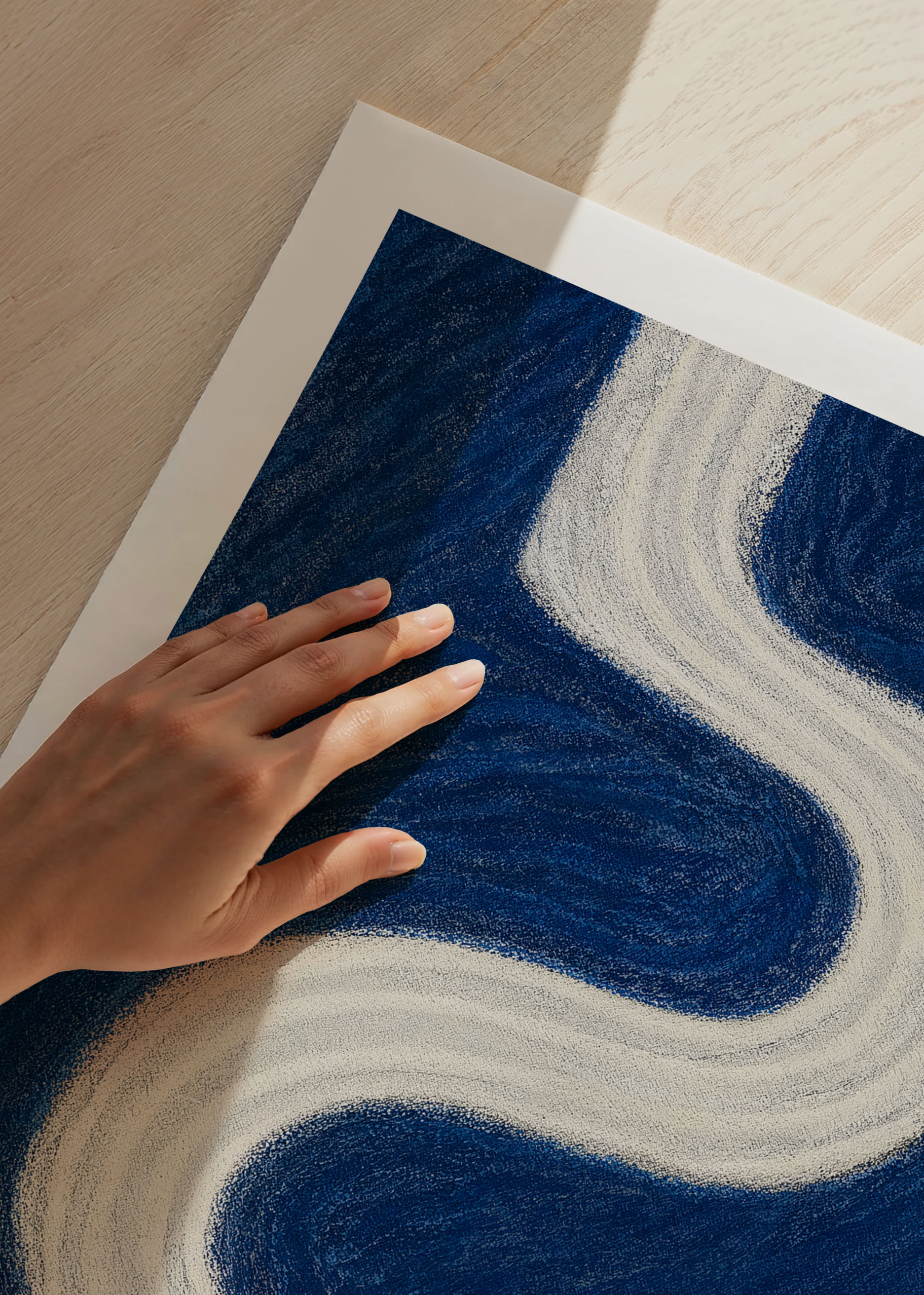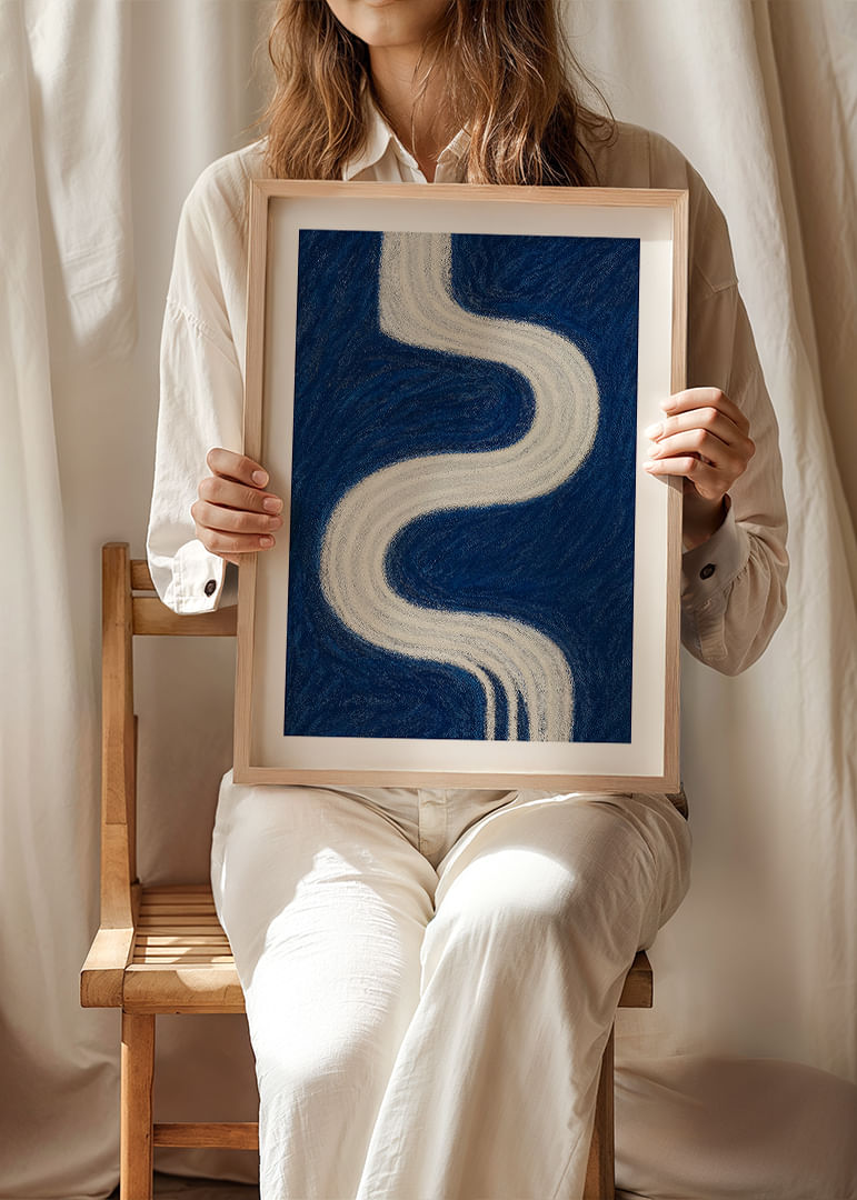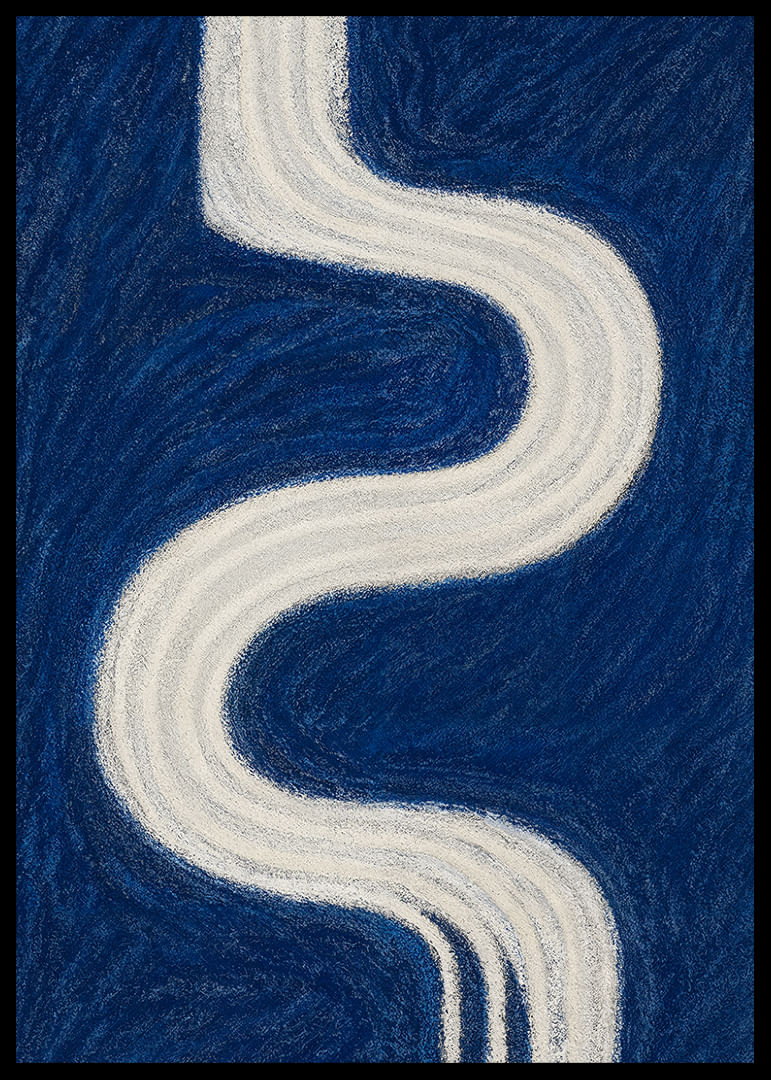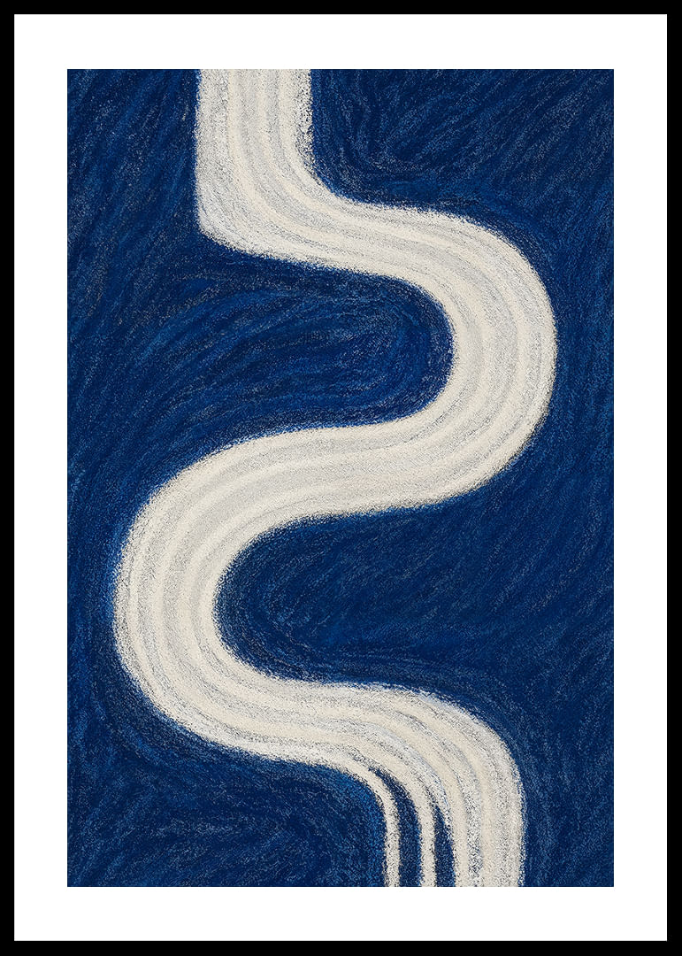 Denna poster fångar ögat med sin slingrande vita väg som löper i kontrast mot en djupblå bakgrund och skapar en känsla av oändlighet och lugn. De mjuka kurvorna bildar en känslomässig resa, där varje linje viskar hemligheter om natten. En perfekt poster för att ge ditt rum en touch av mystik och elegans, och påminna om universums eviga skönhet och djup.