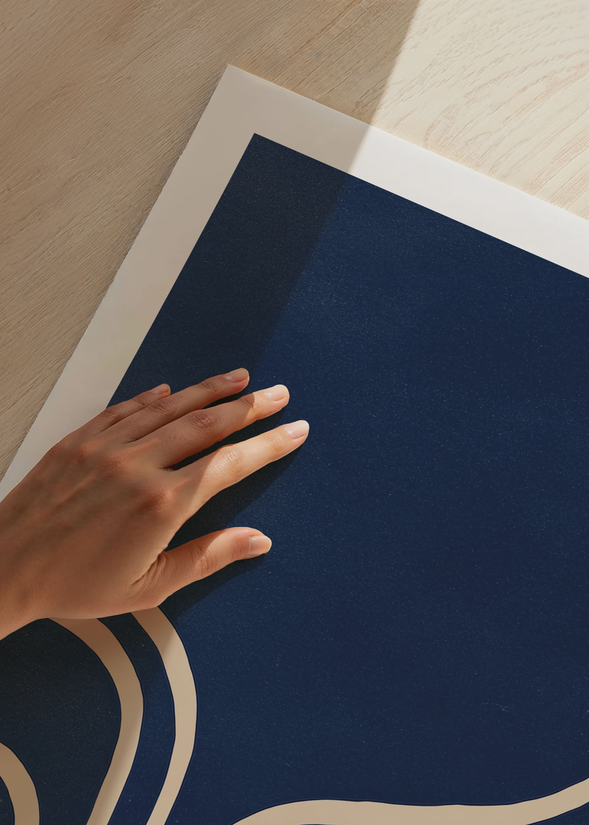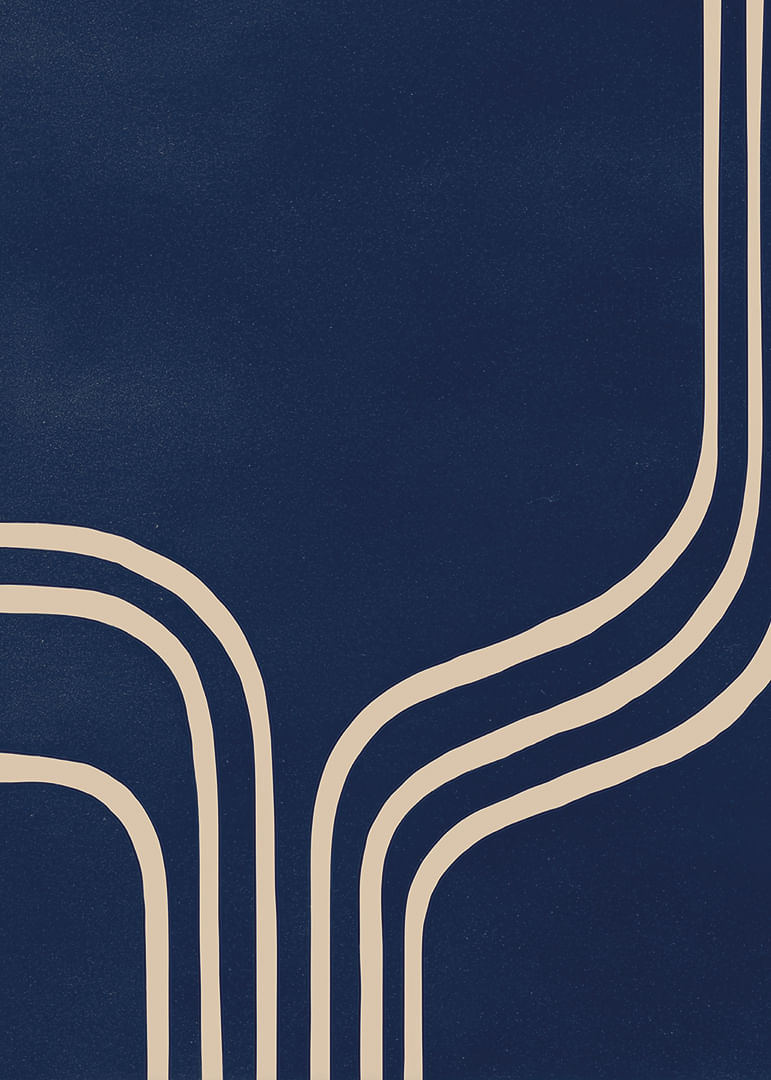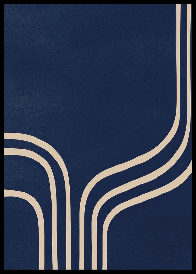 Denna poster fångar din blick med sina mjuka, eleganta linjer som böjer sig harmoniskt mot en djupblå bakgrund. Färgernas kontrast framhäver en känsla av lugn och sofistikering. Det böljande mönstret symboliserar en oändlig rörelse, perfekt för att skapa en avkopplande atmosfär i ditt hem. Denna poster blir en central del av inredningen genom att tillföra både stil och stillhet.