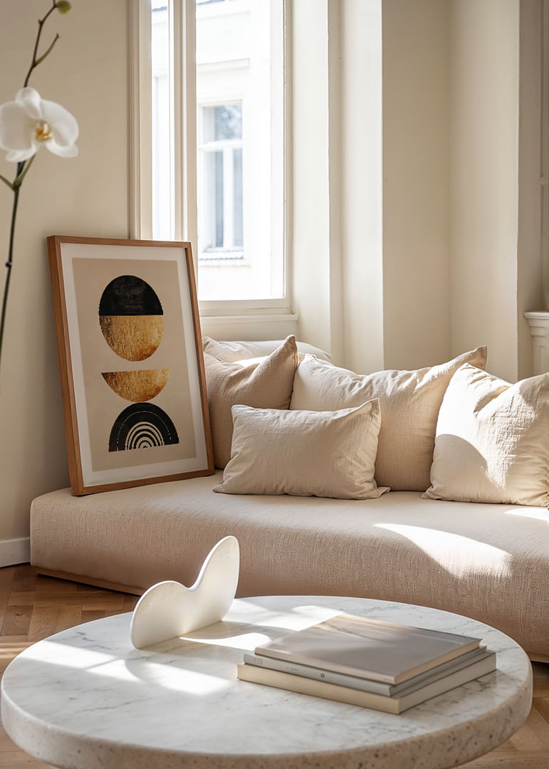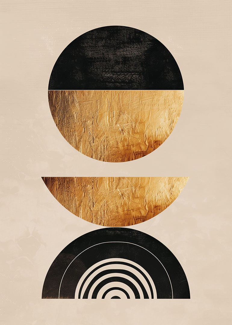 Med sina kontraster mellan rika gyllene och djupa svarta toner skapar denna poster en upplyftande balans av geometri och färg. Det dynamiska spelet av runda former mot en mild bakgrund ger rummet en känsla av modern elegans. Postern blir en centralpunkt som stärker den estetiska atmosfären i vardagsrummet eller kontorsutrymmet och förvandlar enkelt en vägg till en plats för inspiration.