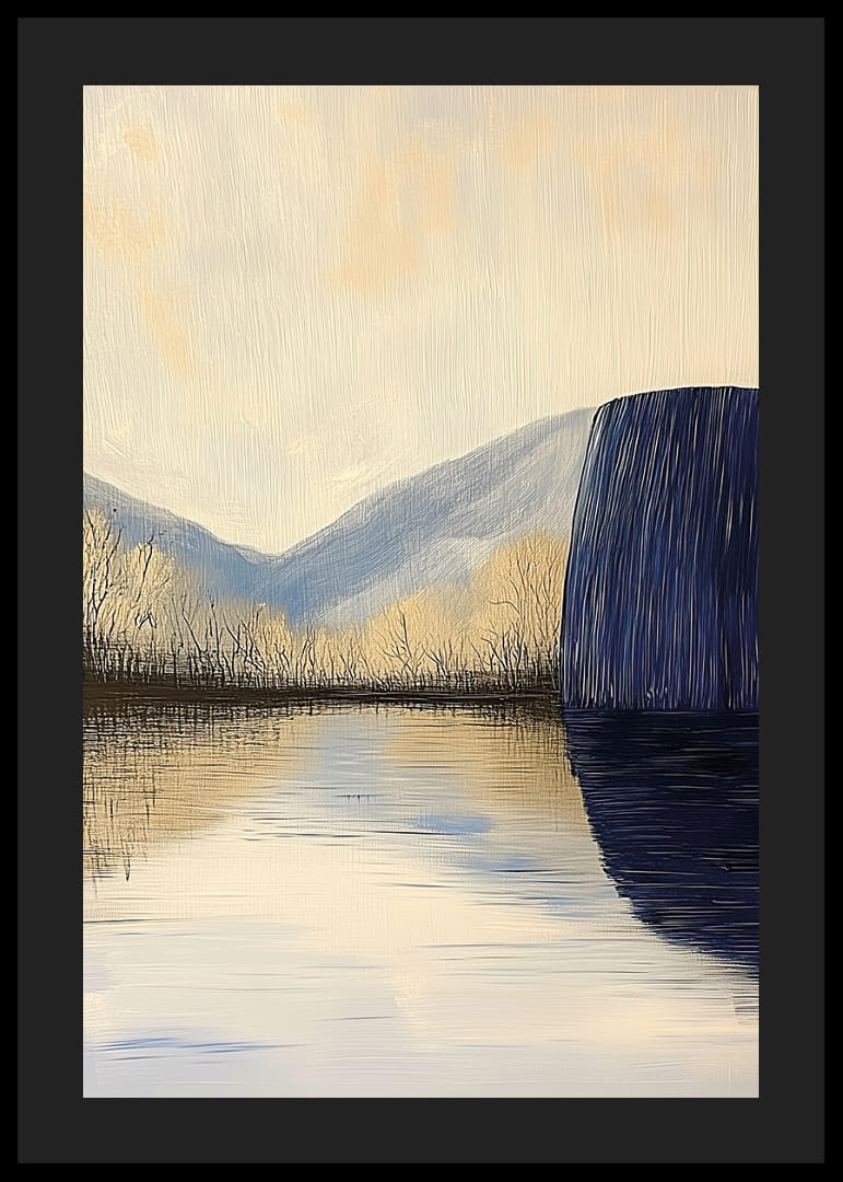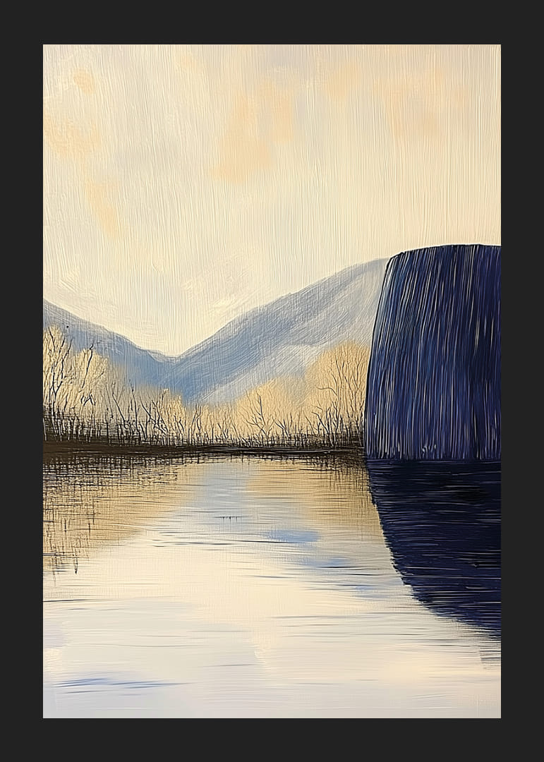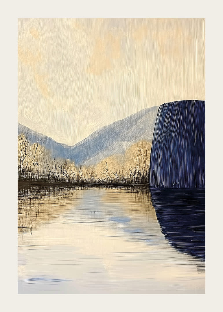 Denna poster fångar en stillsam sjö som speglar de mjuka bergen i en drömlik atmosfär. Färgtonerna av dämpat blått och gyllene nyanser skapar en harmonisk känsla av frid och ro. Detaljerna framhäver naturens skönhet, och motivet bjuder in till eftertanke. Postern förvandlar vilket rum som helst till en fristad av lugn och stillhet, perfekt för att skapa en rogivande miljö.