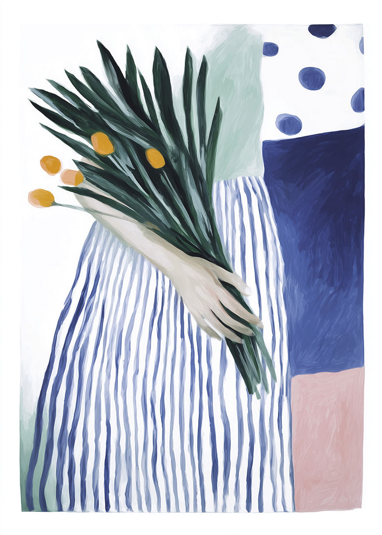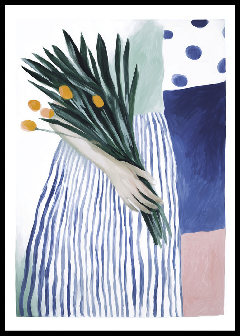 Denna poster fångar en harmonisk syn där en hand håller en levande bukett med gröna blad och gula blommor mot en bakgrund av ränder och prickar i mjuka pasteller. Kontrasten mellan de dynamiska linjerna och de mjuka tonerna skapar en känsla av lugn och stil. Postern förvandlar vilket rum som helst till en plats fylld med friskhet och enkel elegans, vilket gör den till en perfekt inredningsdetalj.