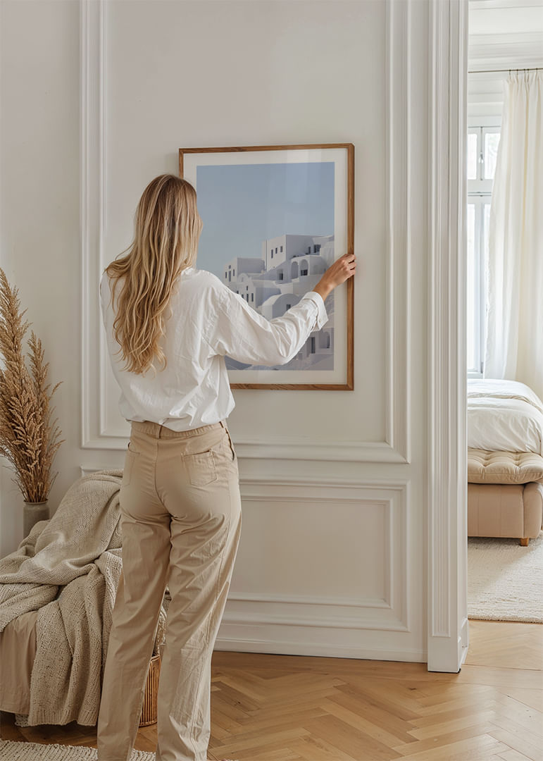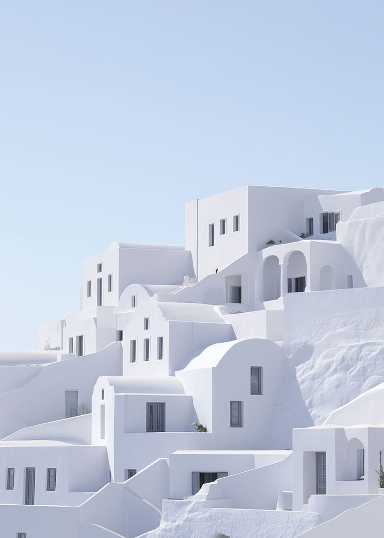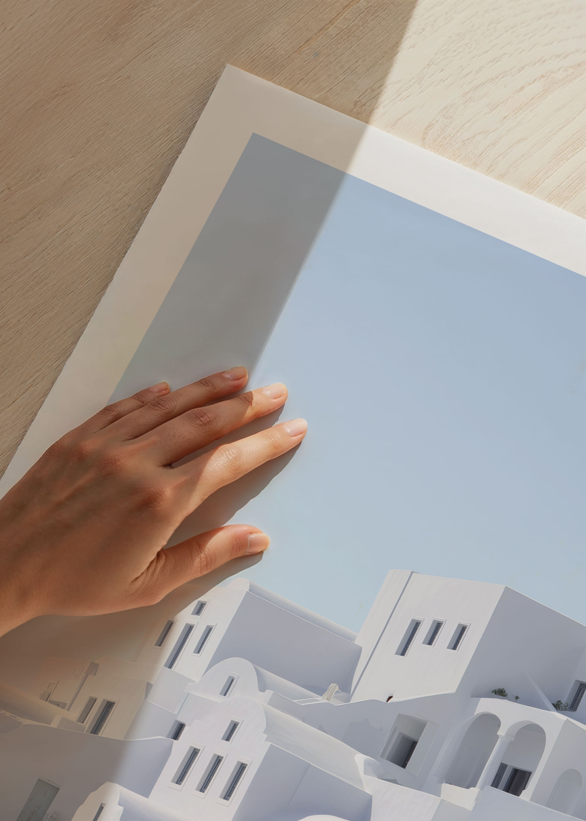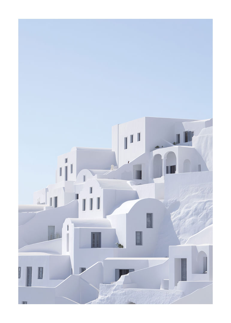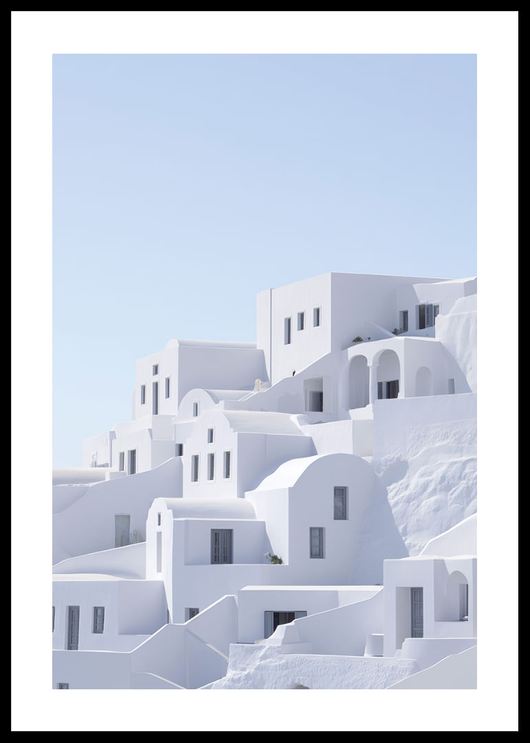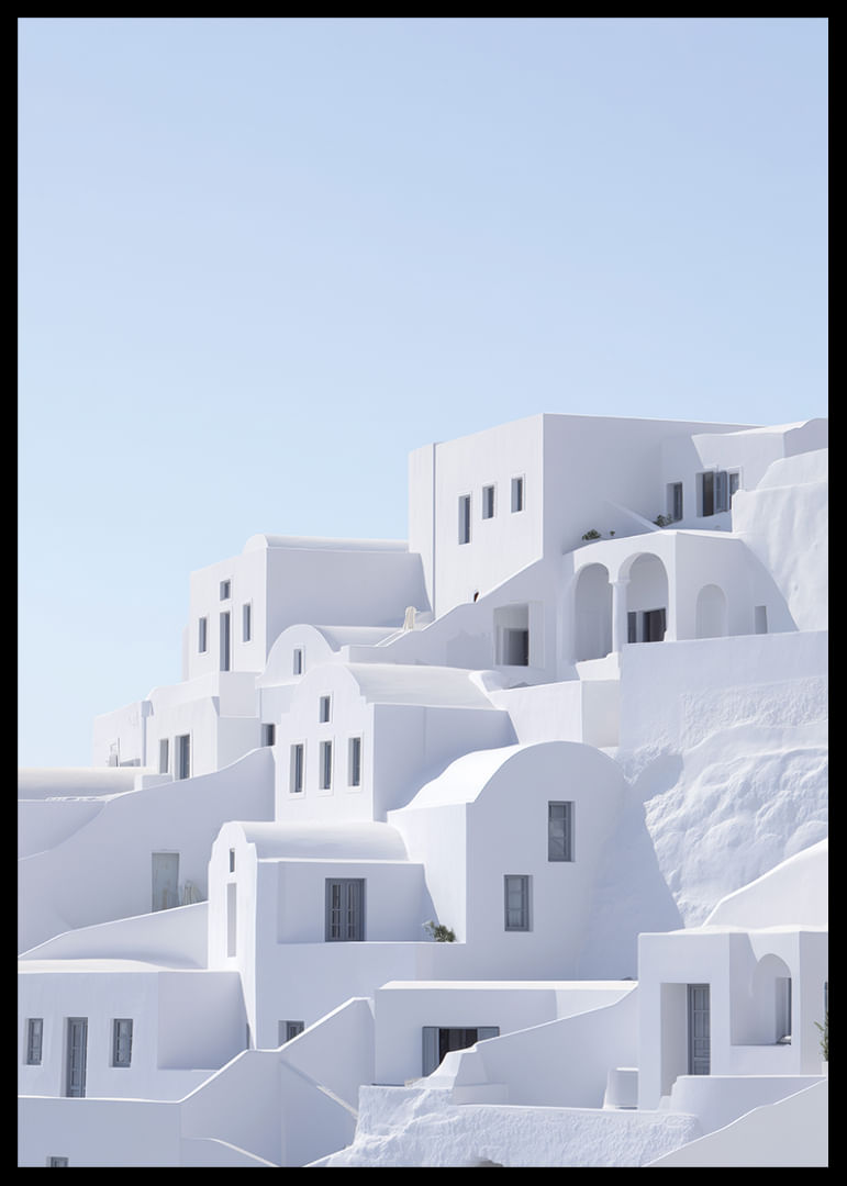 Denna poster fångar Santorinis magiska charm med sina vita byggnader mot en klarblå himmel. De mjuka linjerna och de distinkta formerna i arkitekturen skapar en känsla av ro och elegans. Färgerna och kontrasten mellan husen och himlen framkallar en känsla av evig sommar och avkoppling. Postern ger vilket rum som helst en känsla av lugn och en påminnelse om Medelhavets skönhet.