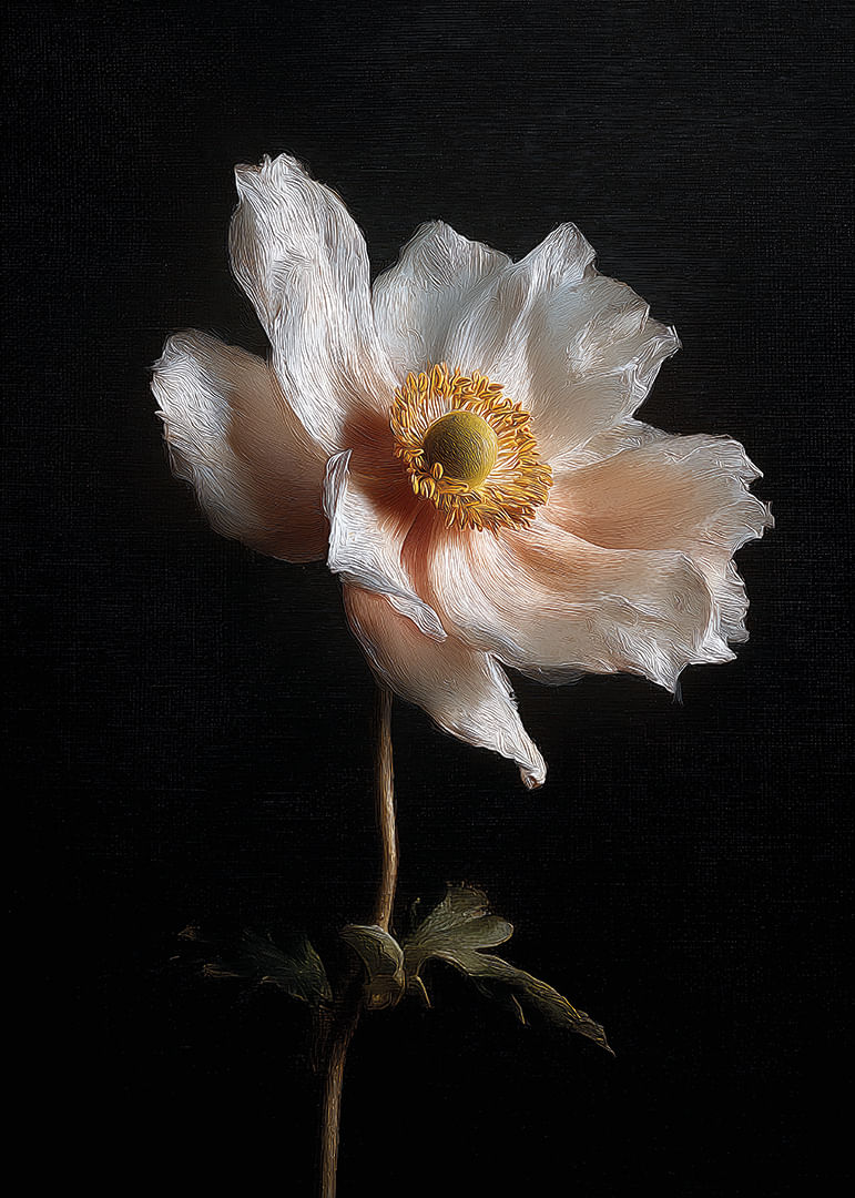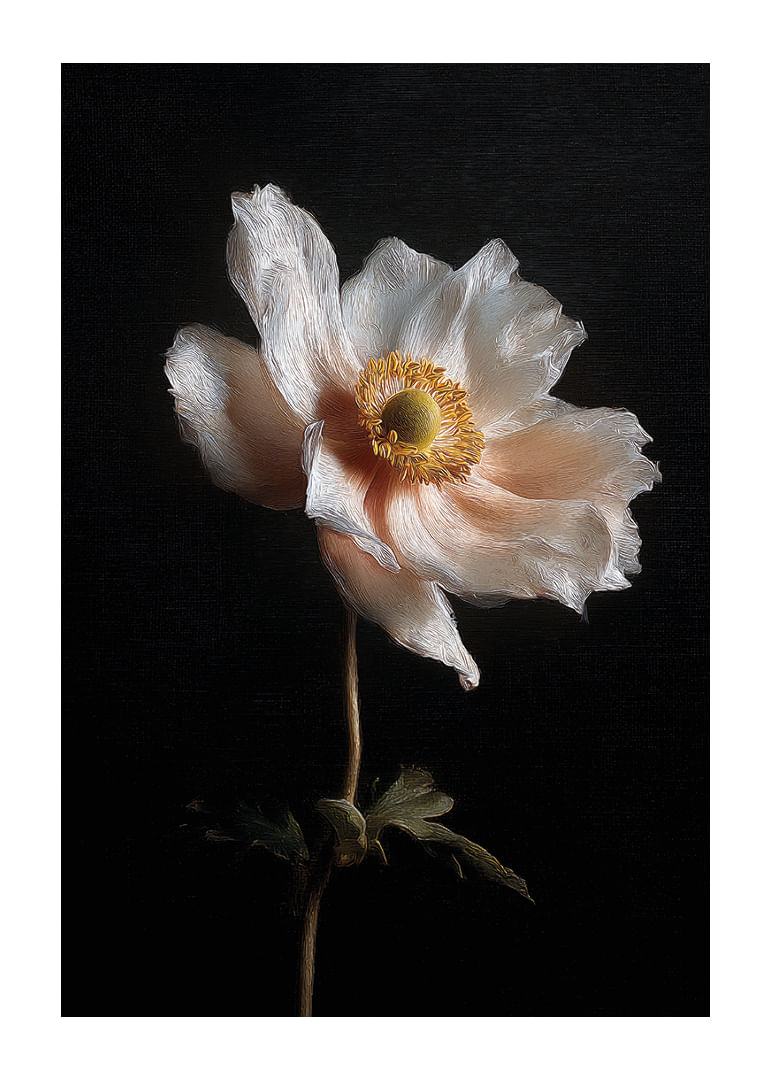 Denna poster fångar den tidlösa skönheten hos en enda blomma som står graciöst mot en djup, mörk bakgrund. Blommans mjuka, krämiga kronblad skimrar nästan mot det svarta, vilket skapar en känsla av lugn och elegans. Med sina subtila detaljer och ljuva färger blir denna poster en förtrollande och sofistikerad inredningsdetalj som förhöjer atmosfären i varje rum den pryder.