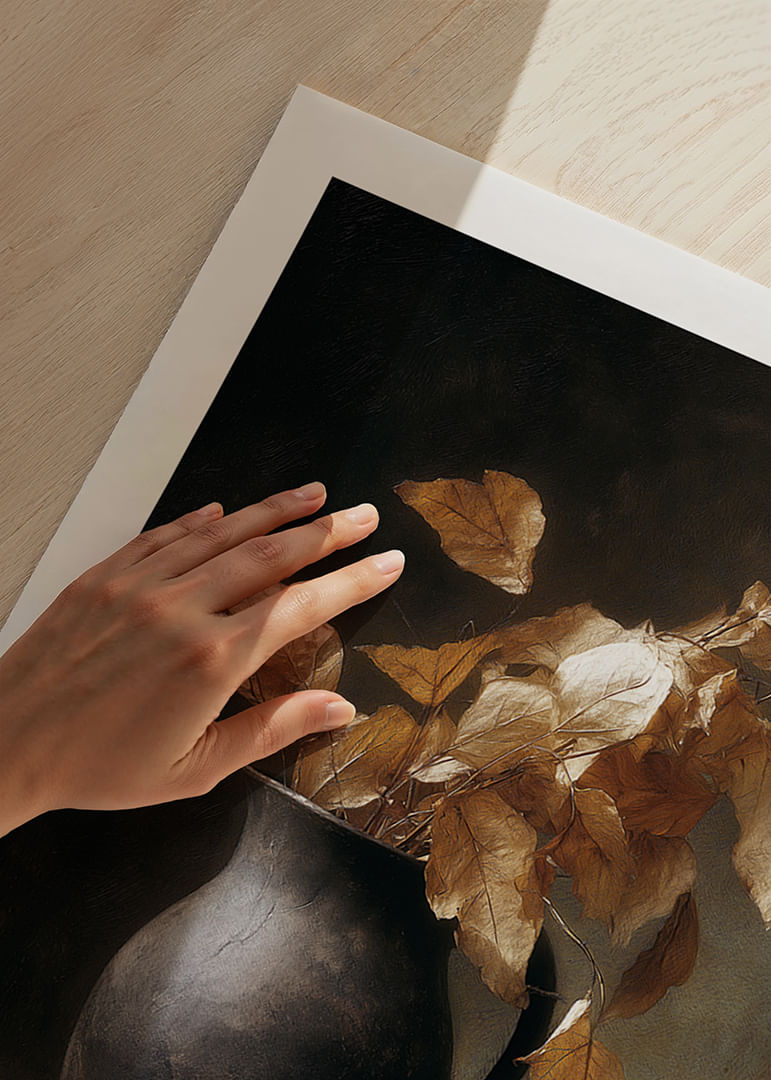 Denna poster fångar skönheten i gyllene löv som elegant vilar i en rustik, mörk kruka. Mellan ljus och skugga dansar bladen och förvandlar enkelhet till konst. Den mjuka kontrasten mellan de varma bladen och den robusta krukan skapar en harmonisk balans. Som dekoration i ditt hem ger denna poster en känsla av tidlöshet och rofylldhet, perfekt för att förbättra stämningen i alla rum.