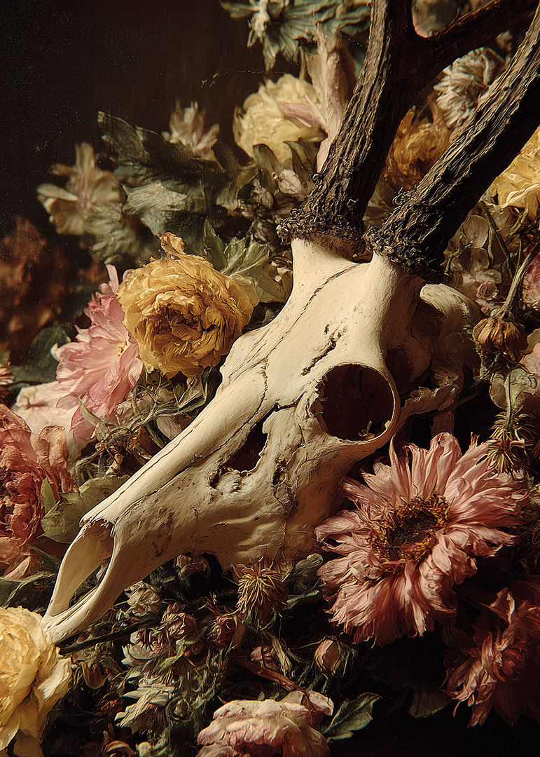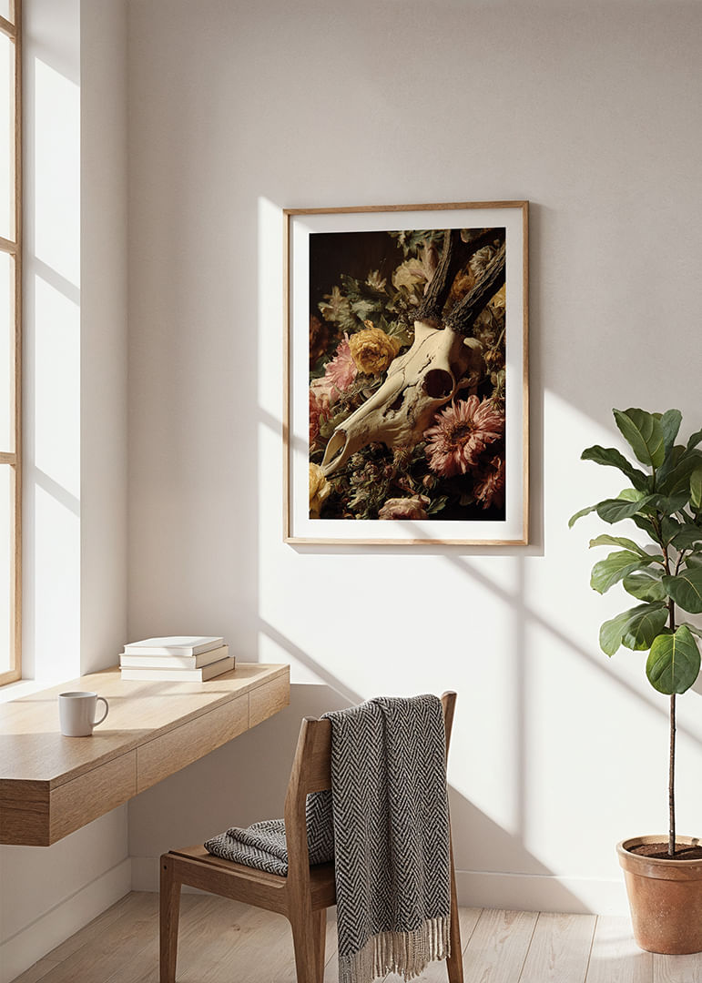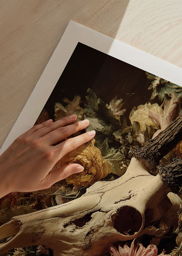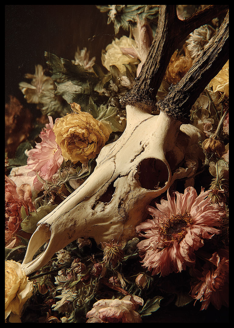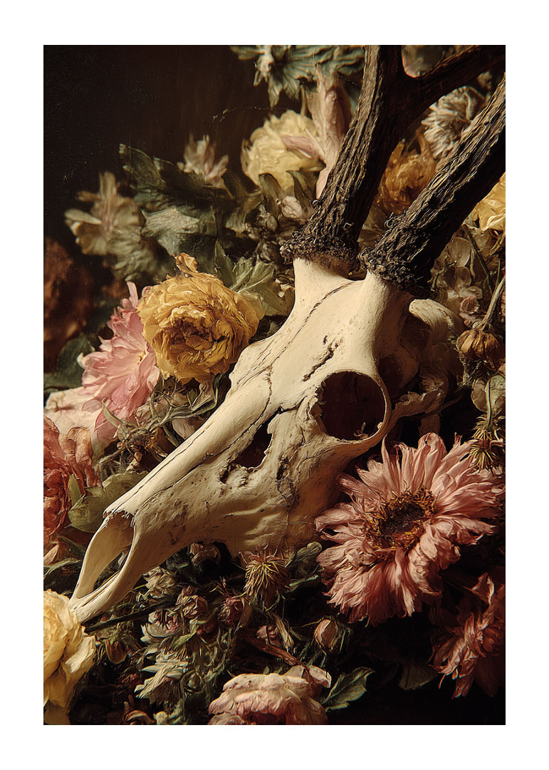 Med en dramatisk harmoni mellan en väderbiten dödskalle och livfulla blommor fångar denna poster en sensuell blandning av styrka och skönhet. Färgerna spelar en subtil symfoni av pastelltoner, medan kontrasten mellan död och liv väcker tankar och känslor. Denna poster skapar en mystisk och sofistikerad atmosfär i ditt hem, där naturens cykler påminner om livets eviga kretslopp.