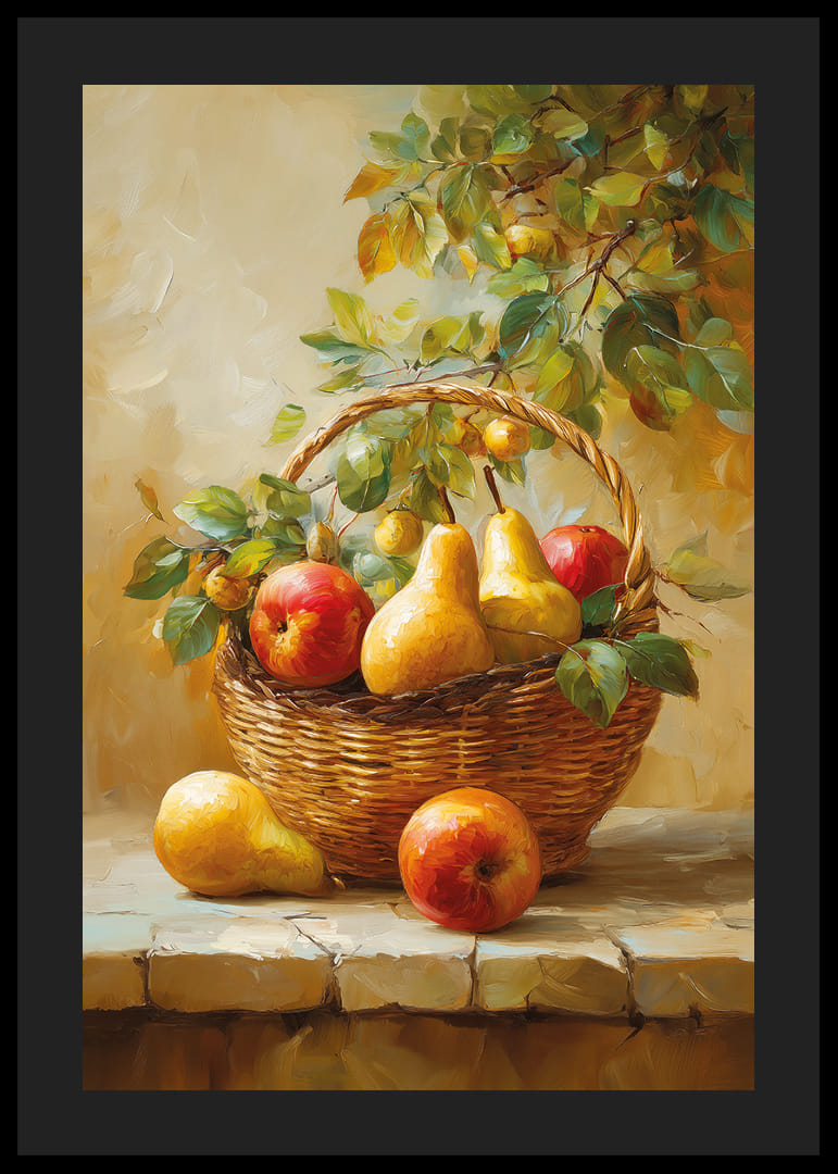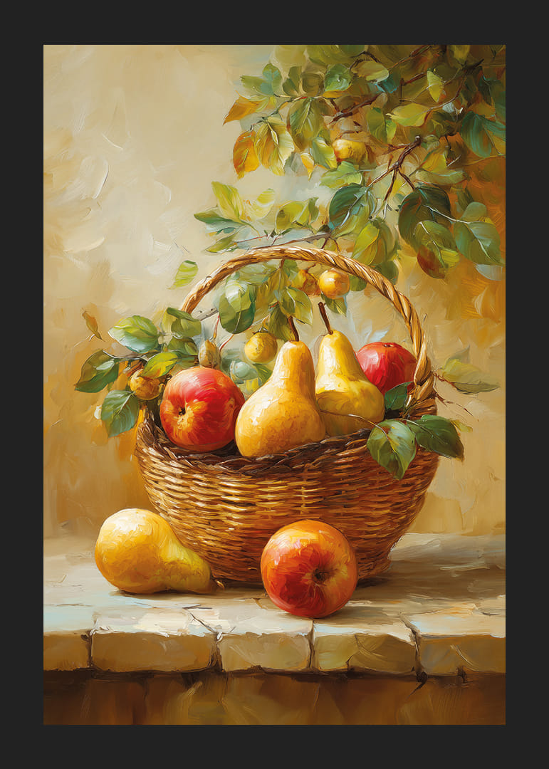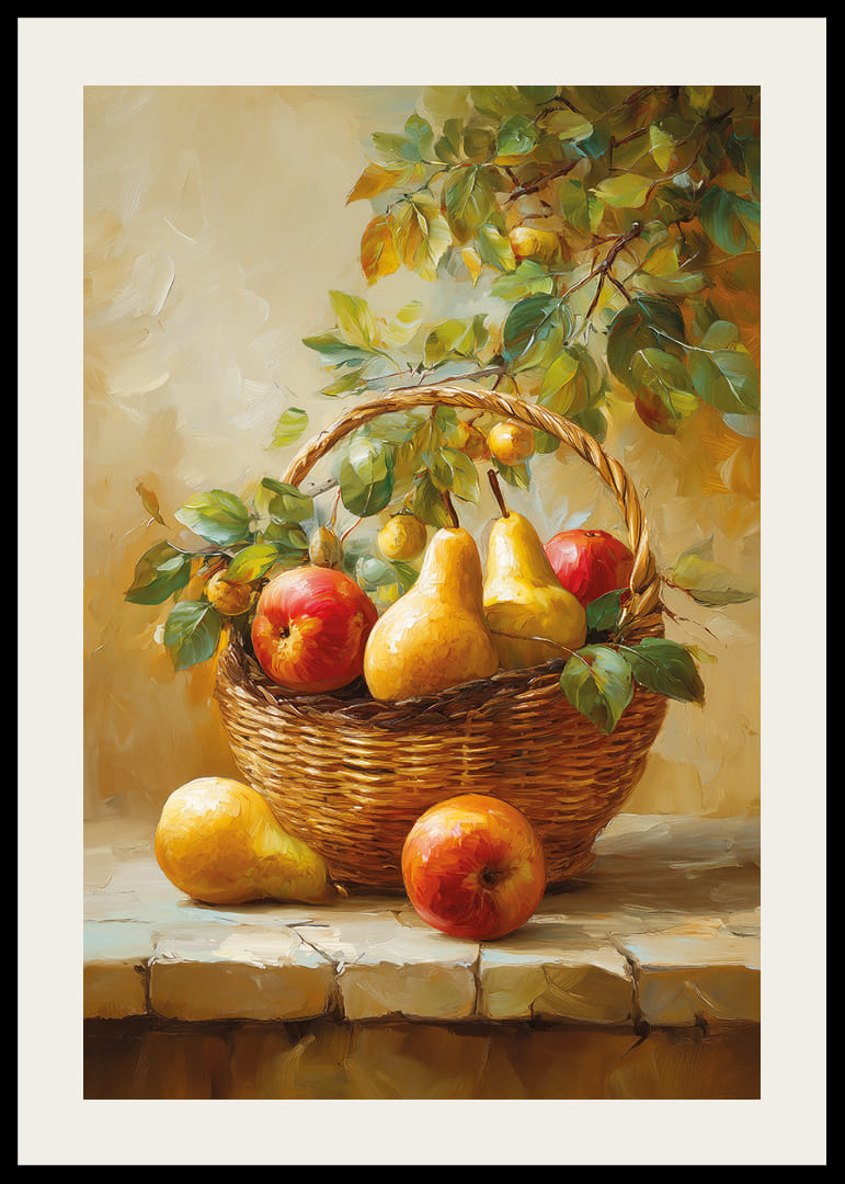 Denna poster omfamnar ögat med en livfull korg fylld av gyllene päron och glänsande röda äpplen, inramad av frodig grönska. De varma, jordnära färgerna skapar en atmosfär av rustik elegans och tidlös skönhet. Detaljerna är noggrant återgivna och ger en känsla av höstens rikedomar. Perfekt för att bringa lugn och naturlig charm in i alla rum, lyfter postern hela hemmets atmosfär.