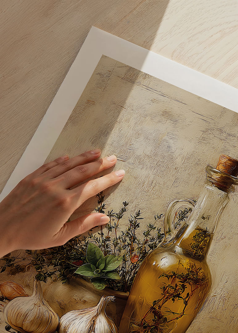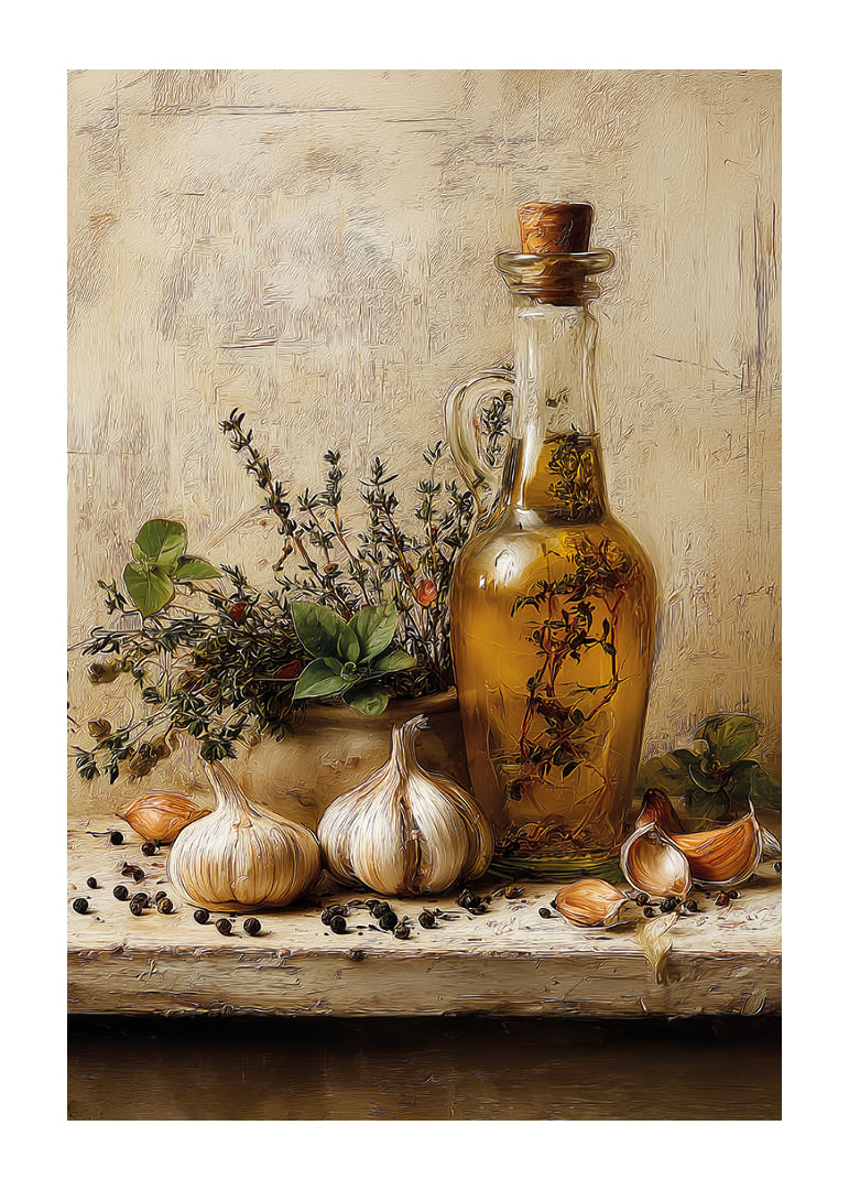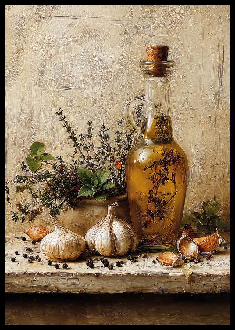 Upplev charmen med denna rustika poster där färska vitlöksklyftor och en elegant karaff med olivolja omges av aromatiska örter. Den nostalgiska känslan och färgtonernas värme ger ditt kök en tidlös touch. Perfekt för att skapa en inbjudande atmosfär och förmedla naturens skönhet, bidrar denna poster till en harmonisk och smakrik stämning i ditt hem.