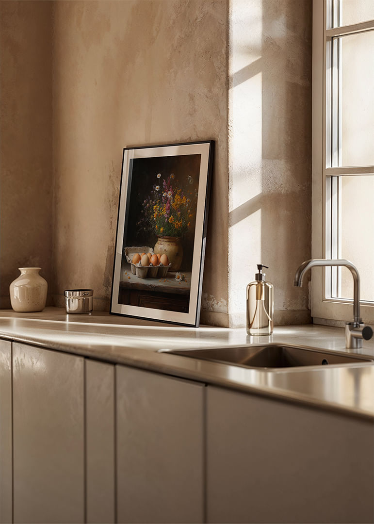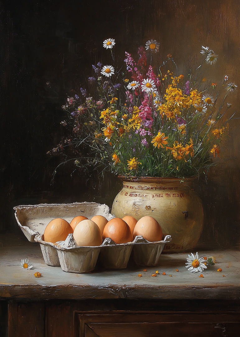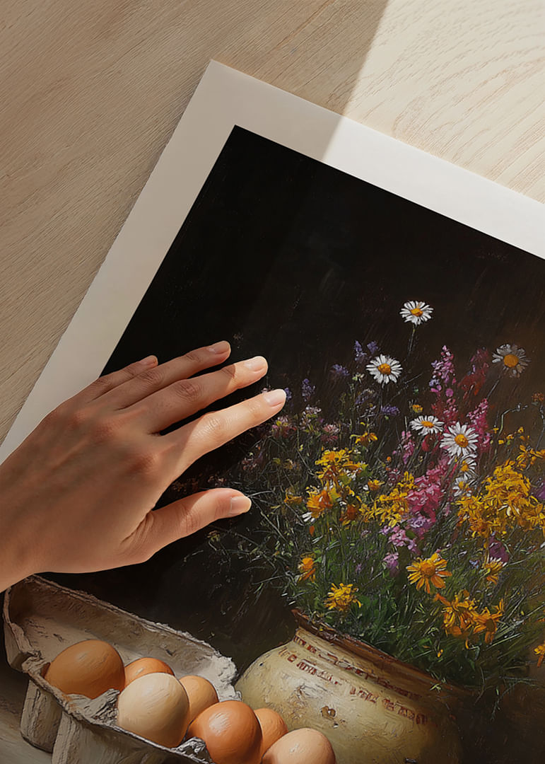 Denna poster fångar en underbar lantlig känsla med ett stilleben av bruna ägg och vilda blommor i en gammaldags kruka. De gyllene och jordnära tonerna skapar en varm och inbjudande atmosfär, där blommornas livfulla färger kontrasterar mot äggens mjuka nyanser. Perfekt för att ge ditt hem en touch av naturens skönhet, tillför denna poster en känsla av ro och enkelhet i ditt vardagsrum.