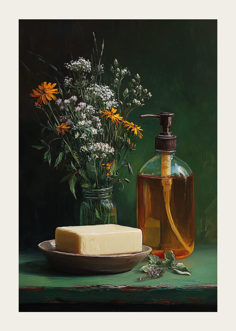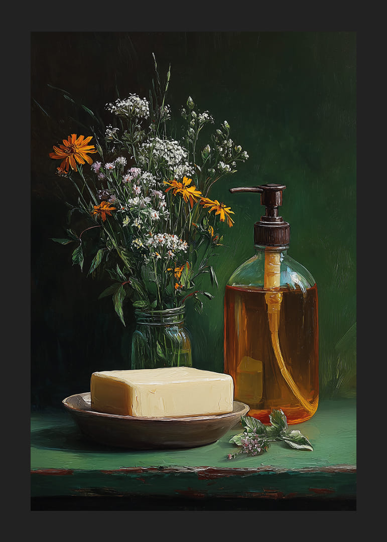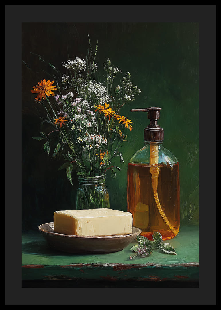 Denna poster fångar skönheten i en stillsam stund med en bukett av vilda blommor och en hantverkartvål vars toner av grönt och orange sprider värme och lugn. Posterns harmoniska komposition skapar en tidlös elegans som berikar ditt rum med en känsla av naturens enkelhet och skönhet. Placera denna poster i ditt hem för att skapa en mysig och inbjudande atmosfär.