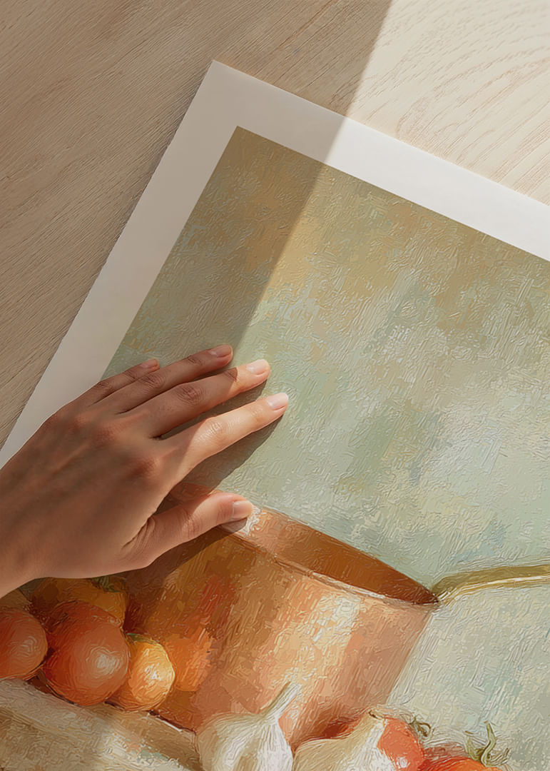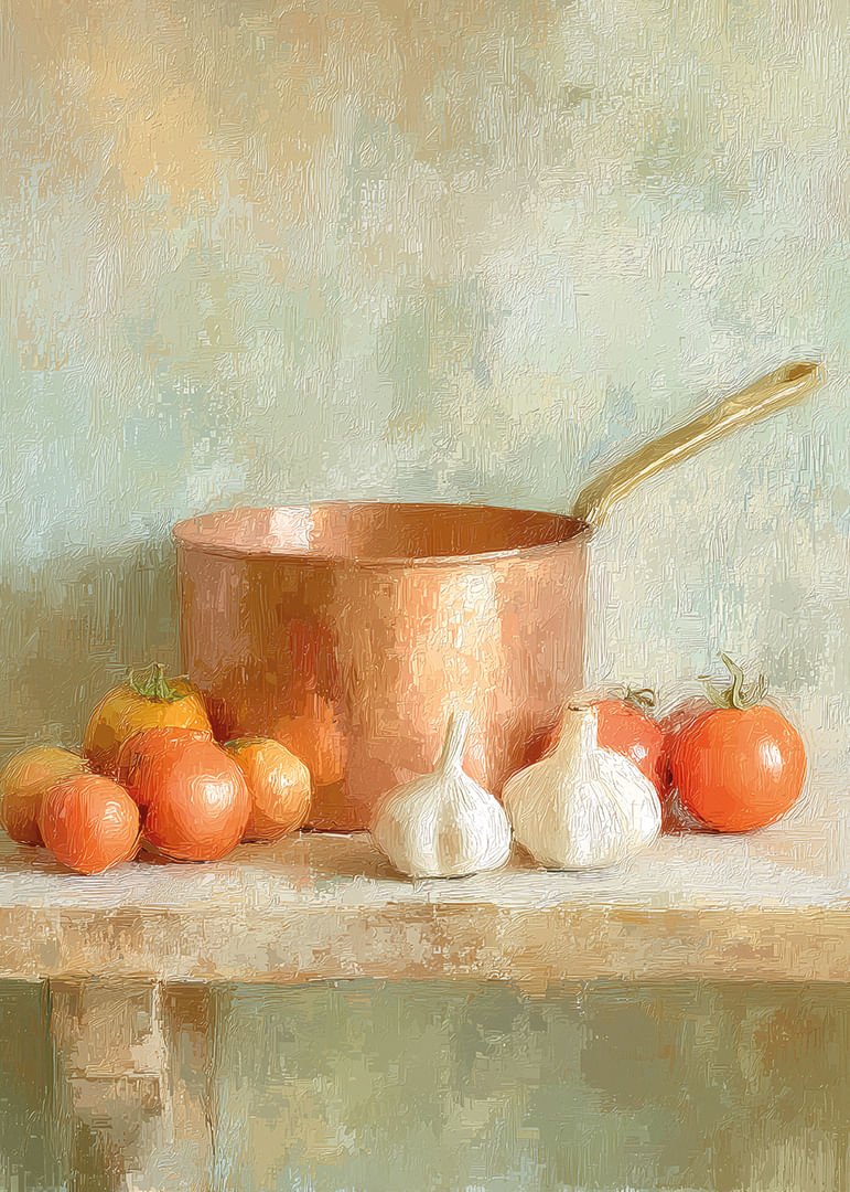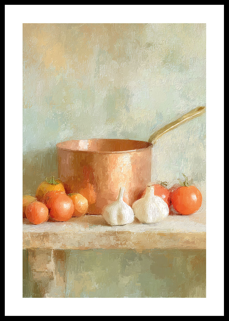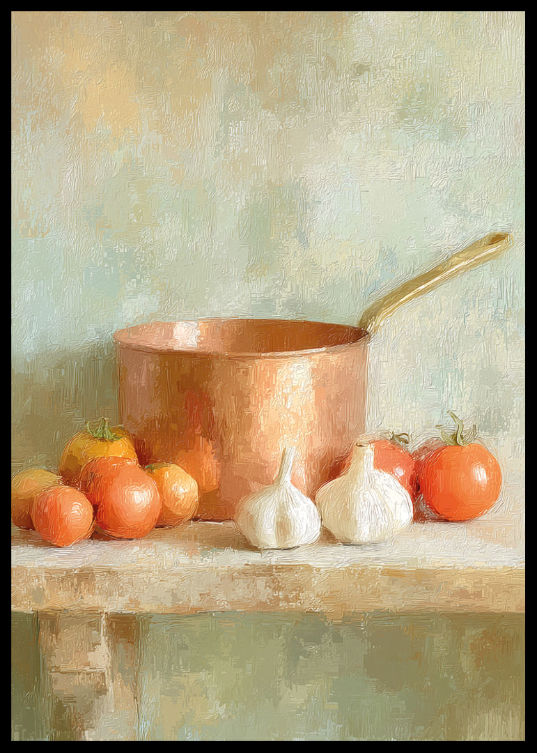 Denna poster fångar ögat med en förtrollande blandning av jordnära färger och klassiska motiv. En vacker kopparkruka står i centrum, omgiven av mogna tomater och doftande vitlök, vilket ger en känsla av ett tidlöst kök. Denna poster för med sig en varm, hemtrevlig atmosfär som förstärker känslan av lugn och enkelhet i vilket rum den än hängs upp i.