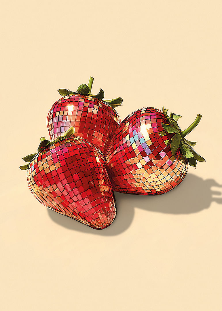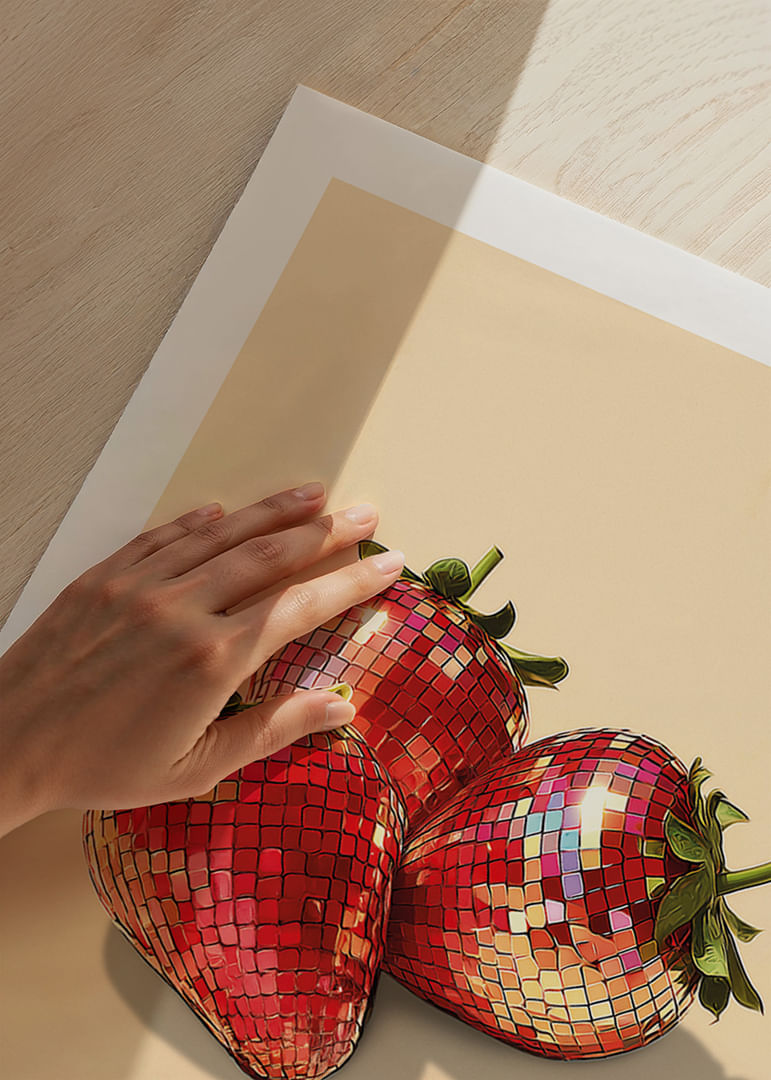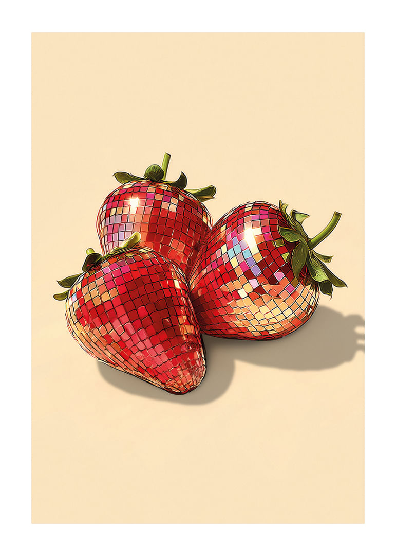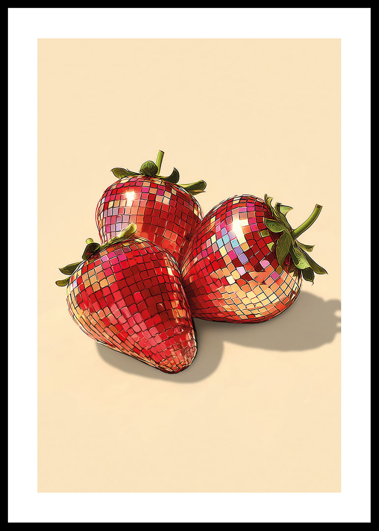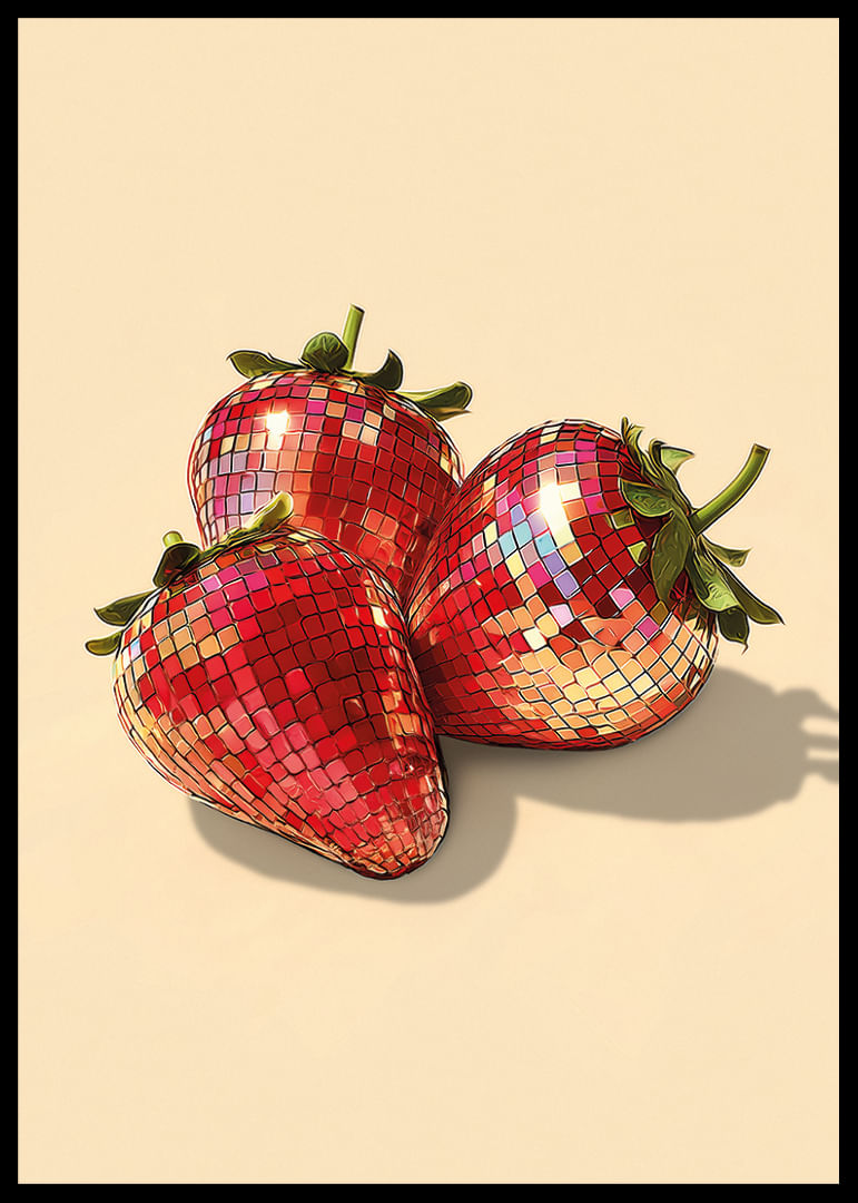 Denna poster fångar ögat med tre jordgubbar klädda i glamorösa discokuler som skapar en festlig stämning. De skinande färgerna sprider en känsla av livfullhet och energi som lyfter vilket rum som helst. Posterns unika design blir ett samtalsämne och förvandlar vardagsrummet till en livfull plats fylld med glädje och stil. Perfekt för att ge hemmets miljö en fräsch och dynamisk touch.