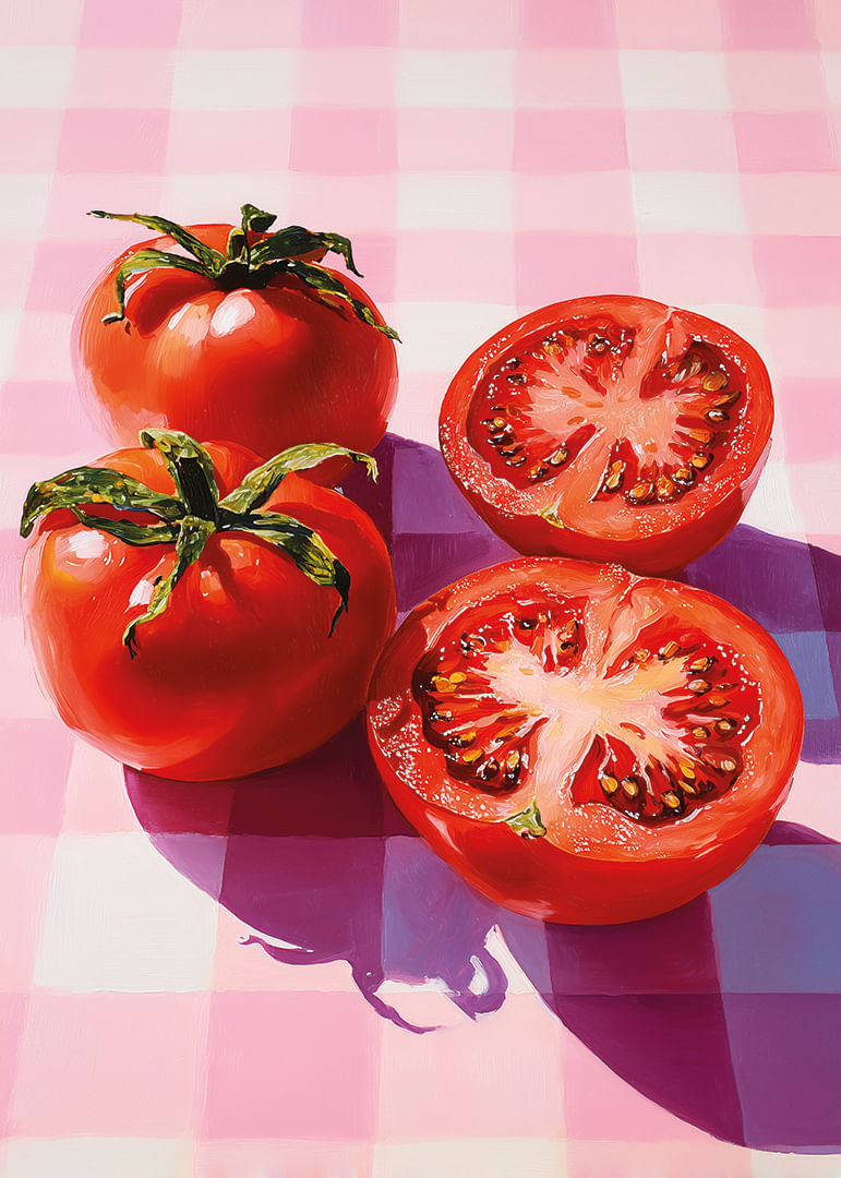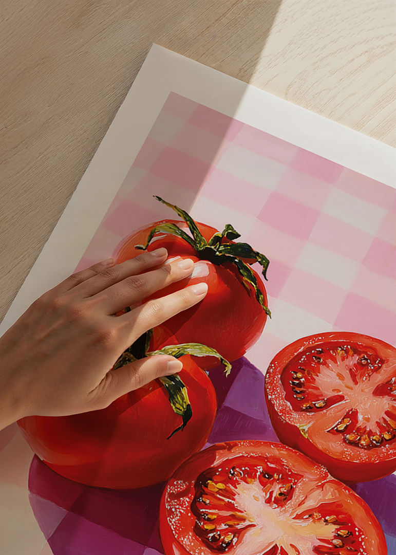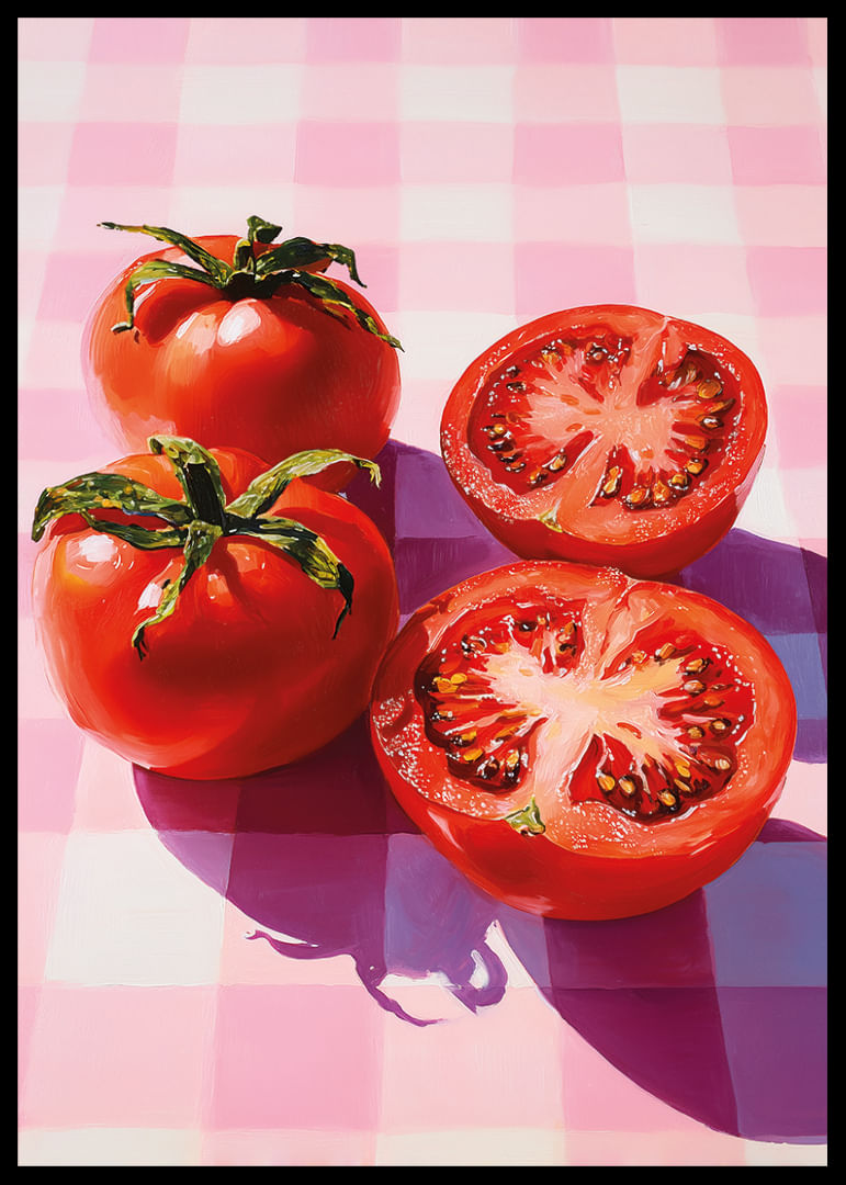 Denna poster fångar intensiteten av saftiga tomater mot ett charmigt rutigt bord. De rika röda nyanserna och den blanka ytan på tomaterna skapar en känsla av färskhet och liv. Sättet som ljuset dansar över ytorna ger en nästan tredimensionell effekt, vilket förbättrar atmosfären i vilket kök eller vardagsrum som helst. Postern ger ditt utrymme en fräsch och inbjudande känsla.