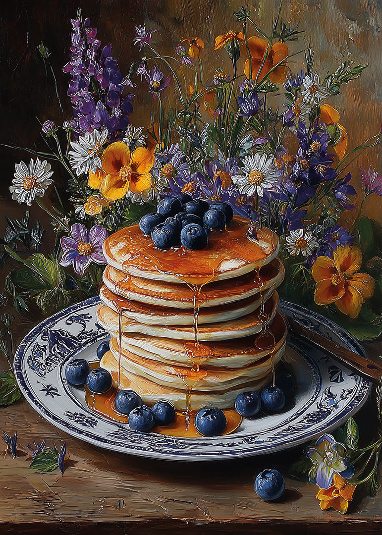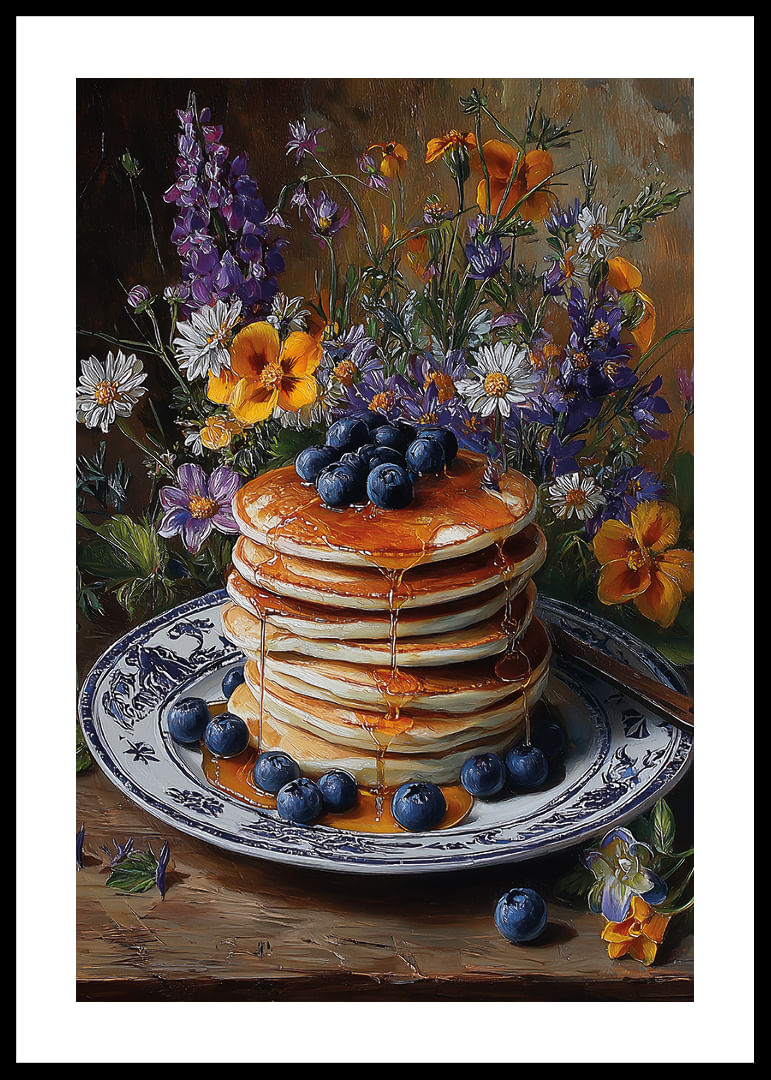 Denna poster erbjuder en ljuvlig mix av gyllene pannkakor täckta med saftiga blåbär och omgivna av färgsprakande blommor. Varje detalj lyfter fram en känsla av rofylldhet och lantlig charm. Syran från bären och de livfulla blommorna skapar en perfekt balans som fångar blicken och förhöjer stämningen i vilket rum som helst. Postern blir en samtalsstartare och en fröjd för ögat.