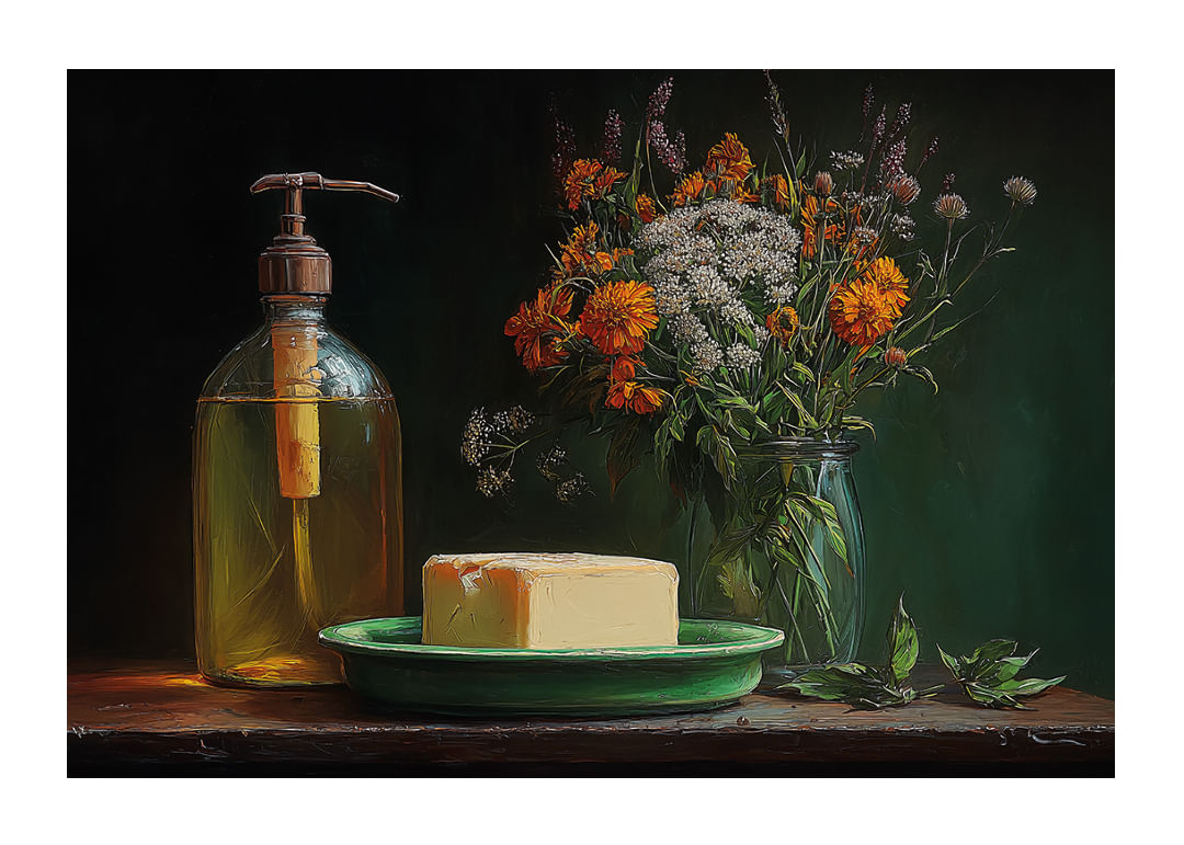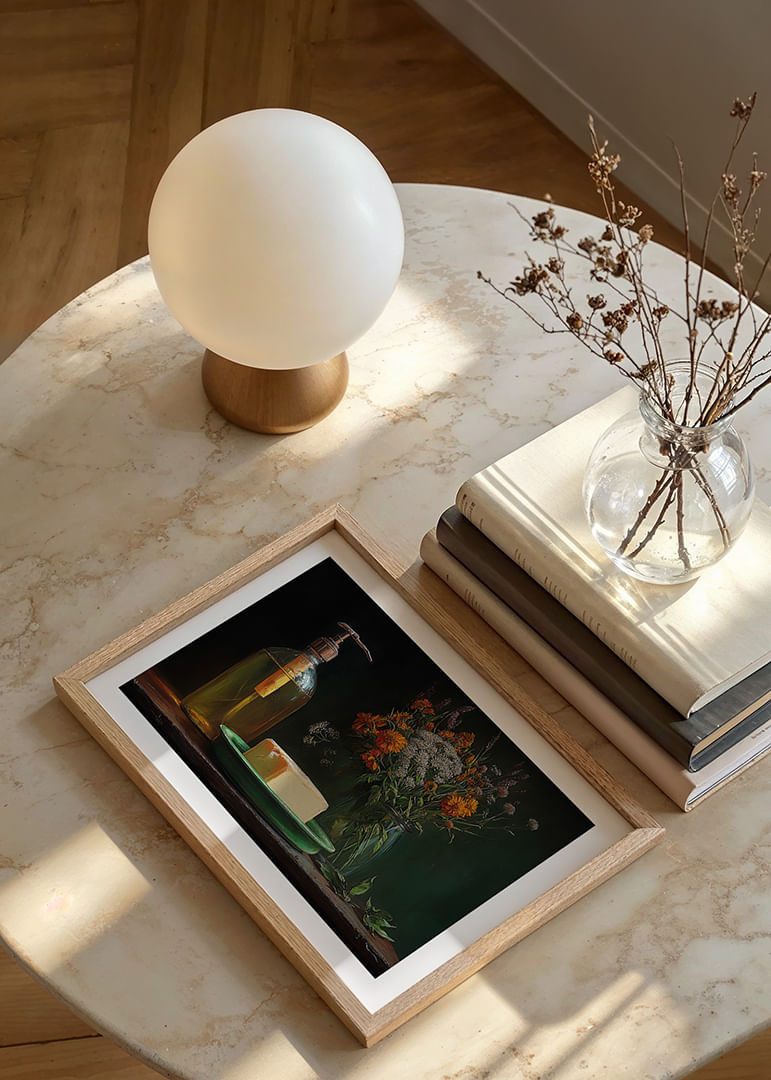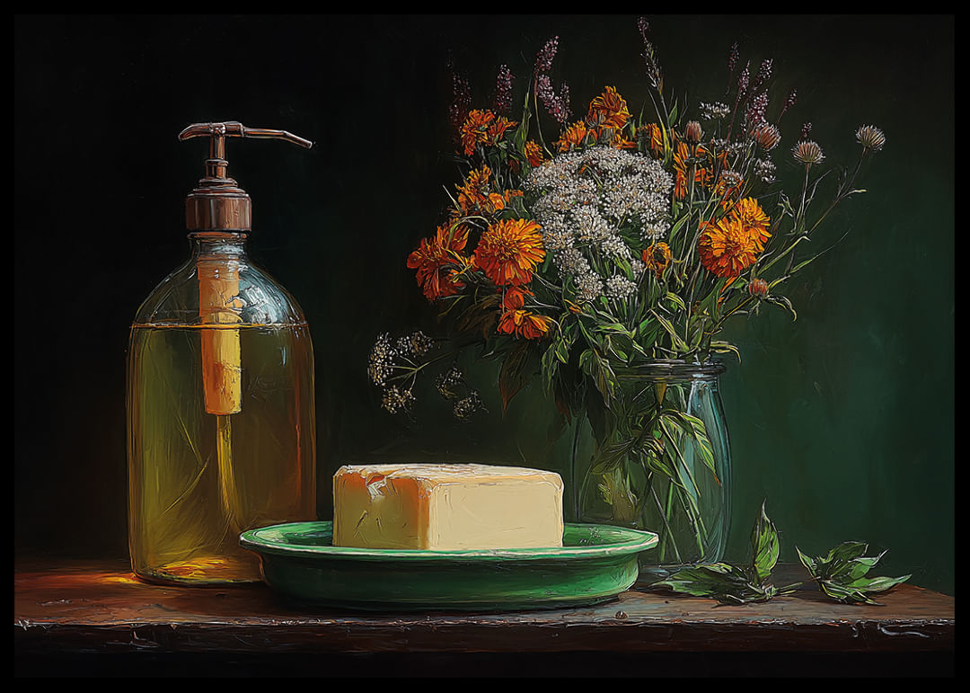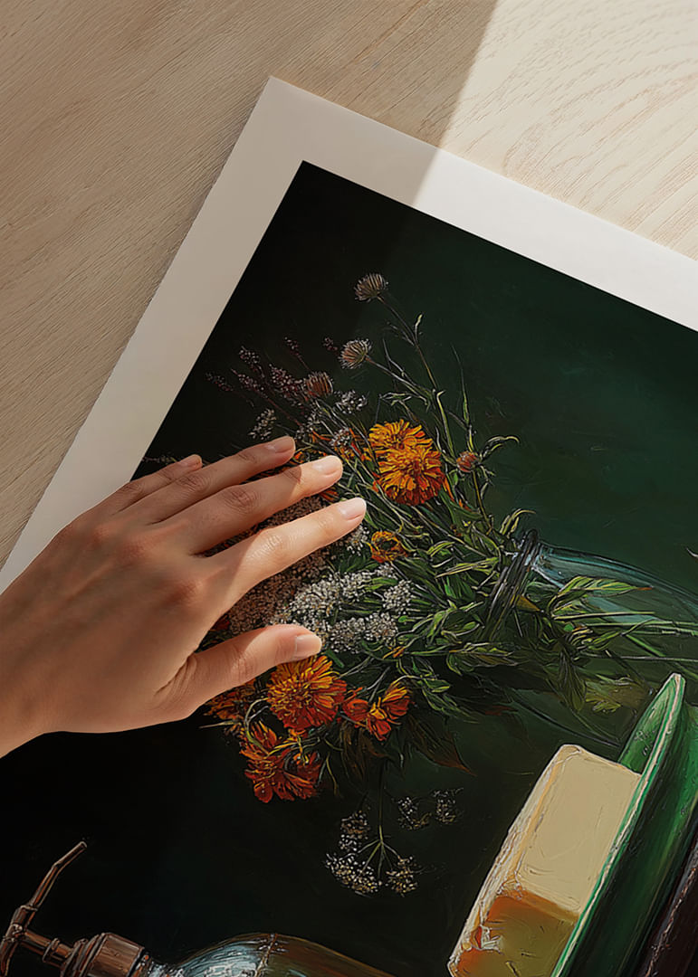 Denna poster fångar en tidlös charm som förenar natur och nostalgi. En vacker bukett av orange och vita blommor i en glasvas breder ut sig bredvid en vintage glasflaska och en bit smör på en grön tallrik. Varje element strålar en varm och inbjudande känsla, och denna poster förhöjer enkelt atmosfären i ditt hem genom sin rustika elegans och fridfulla harmoni.