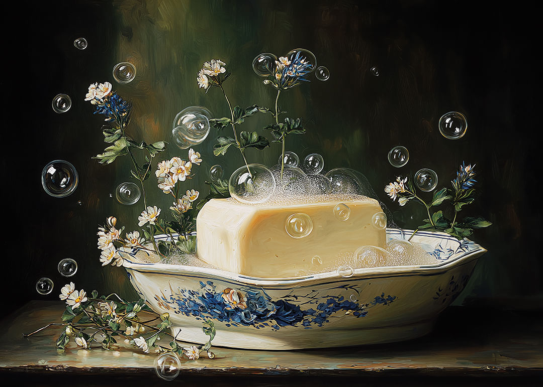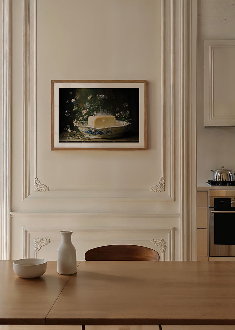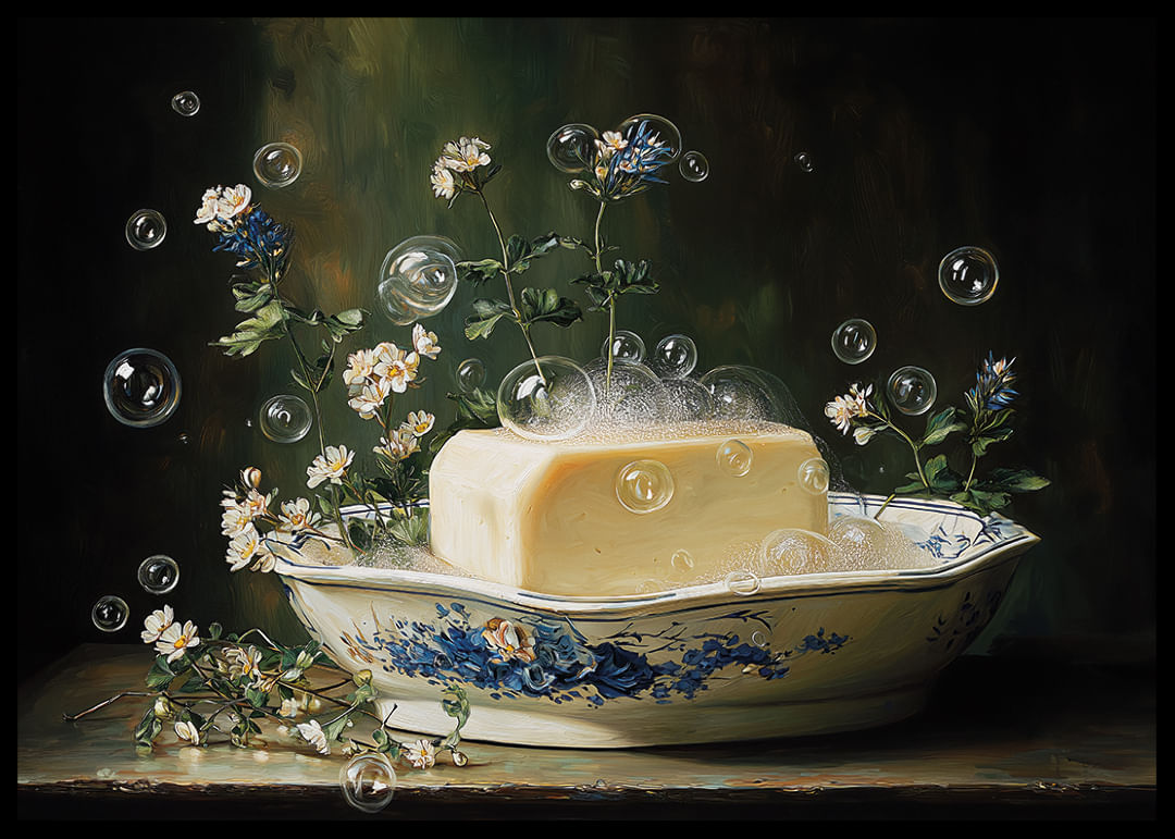 Mitt i en förtrollande balans av elegans och renhet, lyfter denna poster fram en vacker symfoni av delikata bubblor och färska blommor. Den blommiga tvålen placerad i en konstnärligt utformad skål fångar ljuset på ett magiskt sätt. En idealisk poster för att berika ett utrymme med känslan av lugn och skönhet, perfekt för att skapa ett harmoniskt och inbjudande hem.