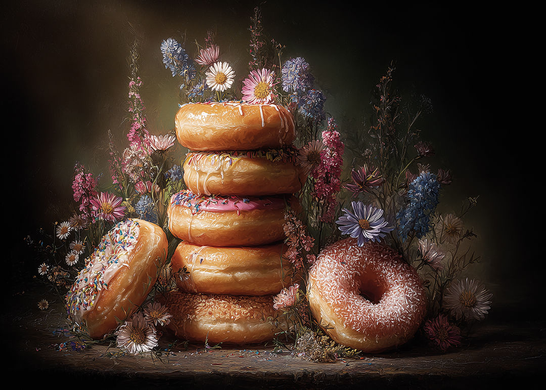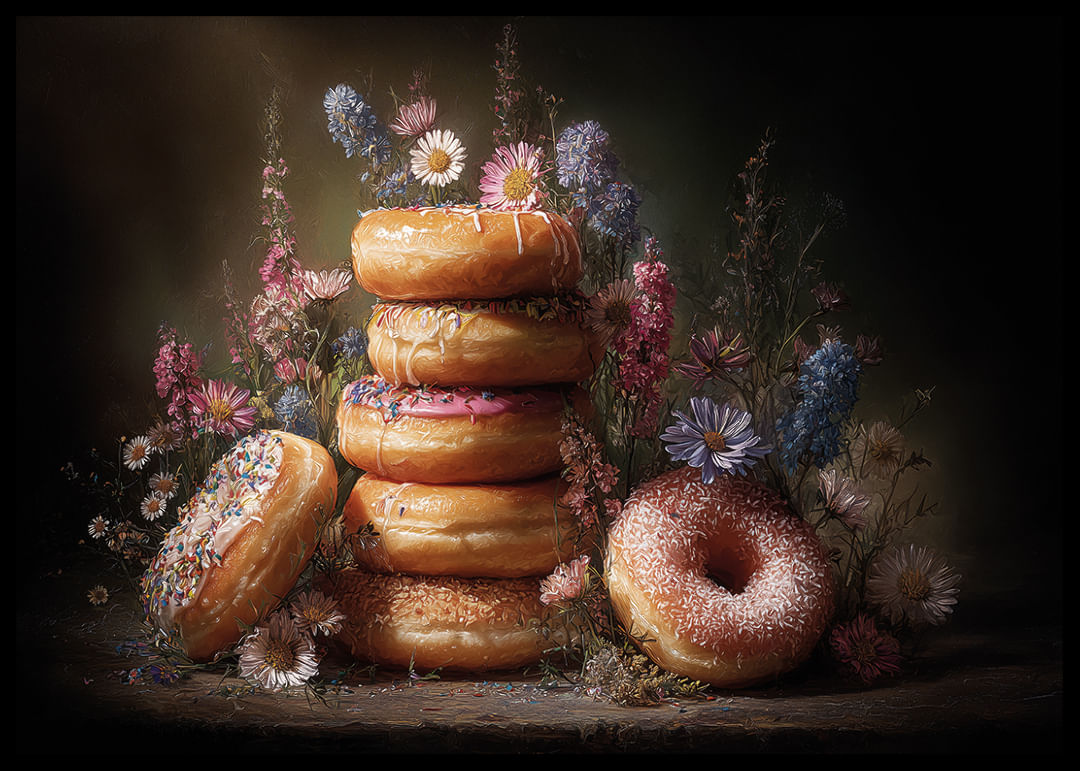 Denna poster utstrålar en känsla av magi med sina färgglada donuts omgivna av sprudlande blommor. Den mjuka belysningen och de harmoniska färgerna skapar en visuell symfoni som förtrollar betraktaren. Postern fångar både ögat och fantasin med sin unika kombination av sött och blomstrande, och den förvandlar vilket rum som helst till ett konstnärligt utrymme fyllt av glädje och elegans.