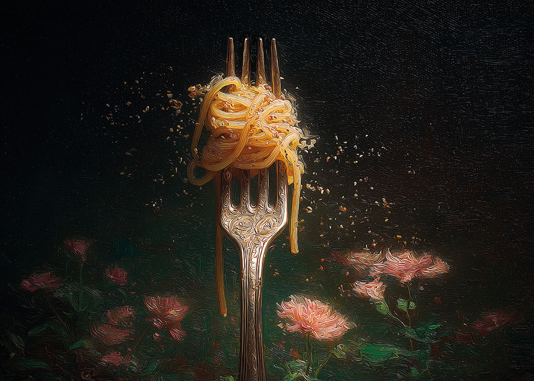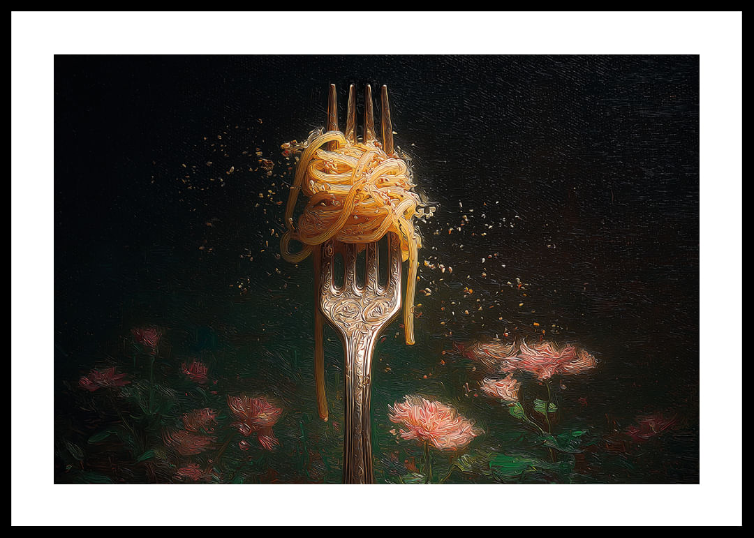 En magisk fusion av mat och konst! Denna poster fångar en förgylld gaffel som elegant lyfter en perfekt virad bunt pasta, omgiven av spröda smulor och subtila blomster i bakgrunden. Med sin mörka, dramatiska kontrast och oljemålningsliknande struktur förvandlar motivet vardaglig njutning till ren poesi. En unik väggdekoration för både matälskare och konstentusiaster!