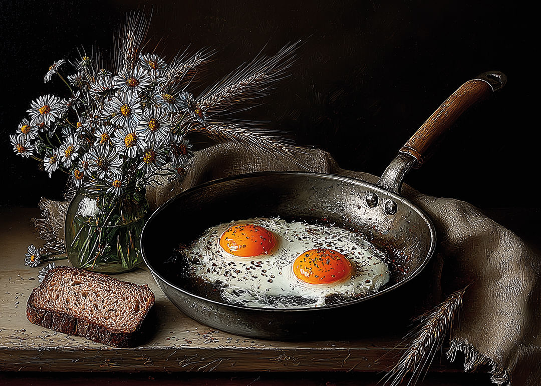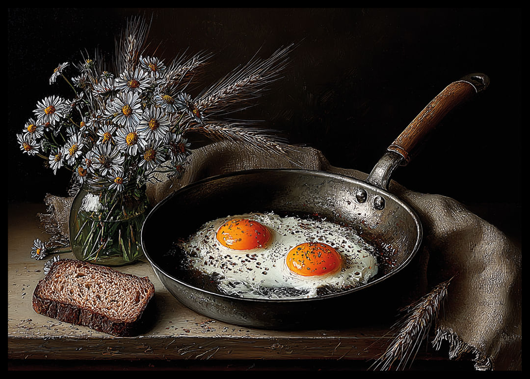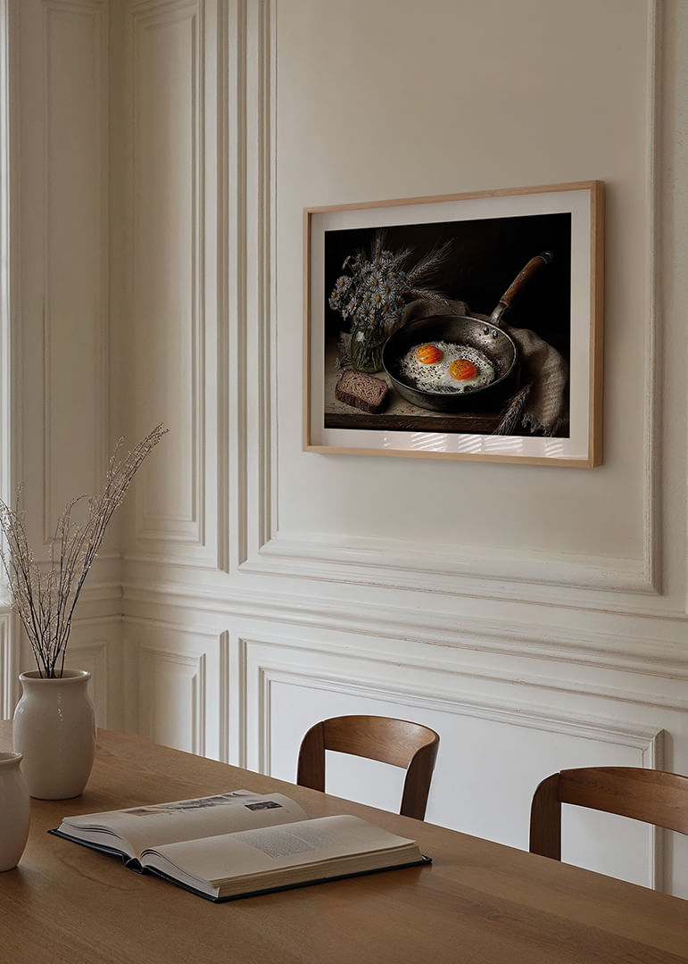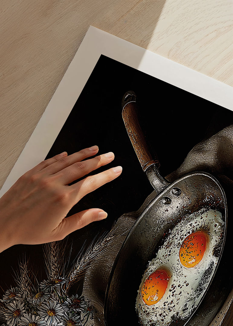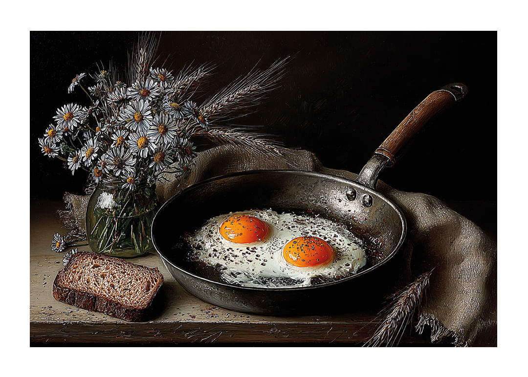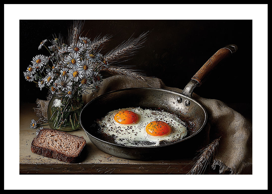 Med en omedelbar känsla av lantlig charm fångar denna poster ett stilleben med perfekta stekta ägg, ett stycke rustikt bröd och en bukett av vilda blommor. De rika, varma tonerna skapar en inbjudande atmosfär, medan detaljrikedomen i varje element ger djup åt verket. Denna poster förvandlar vilket rum som helst till en fridfull och vacker plats, full av enkel men elegant dekorativ stil.