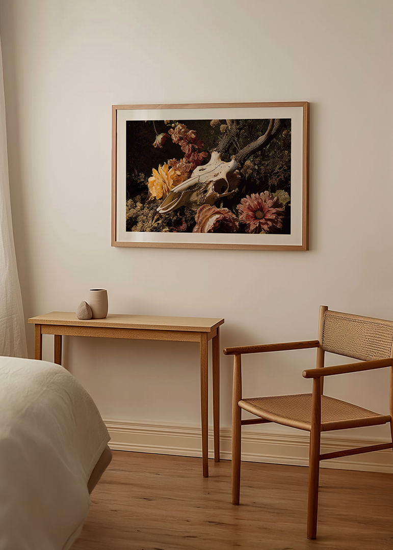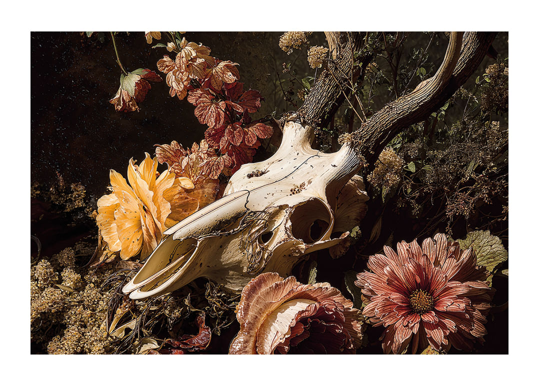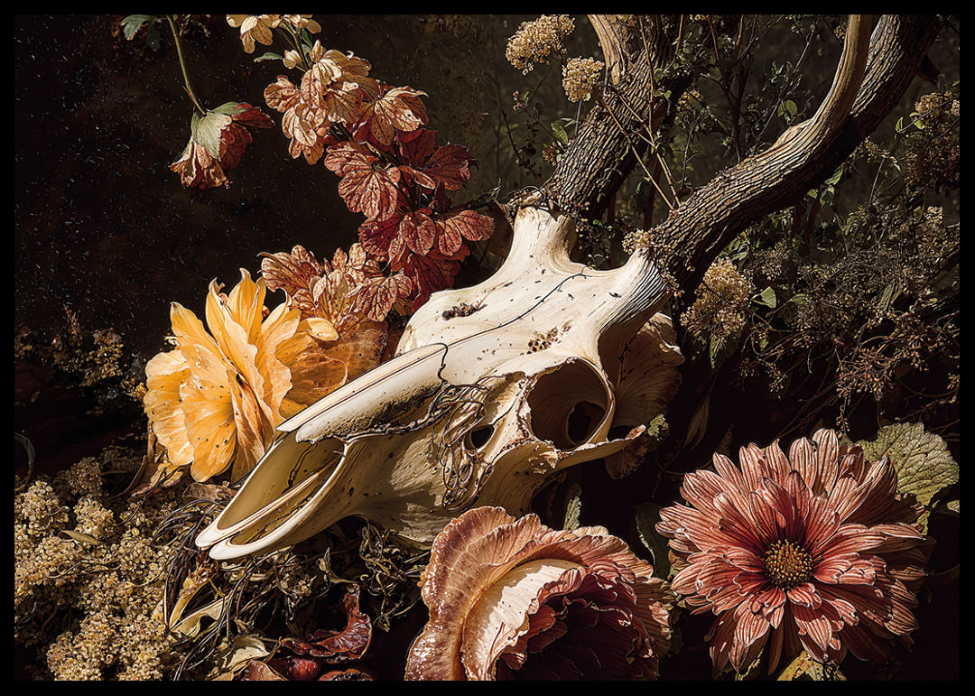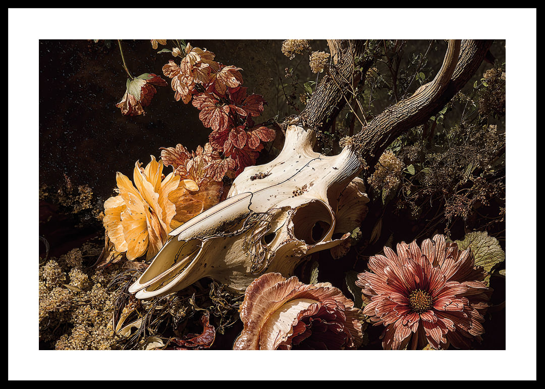 En otrolig poster där det vilda möter det vackra i en dramatisk scen av blommor och djurskalle. Kombinationen av sköra blomblad och robusta ben skapar en oemotståndlig kontrast, fylld av mystik och skönhet. Färgerna är jordnära och djupa, vilket ger rummet en touch av både elegans och naturens råa kraft. Denna poster förvandlar vilken vägg som helst till en fascinerande samtalspunkt.